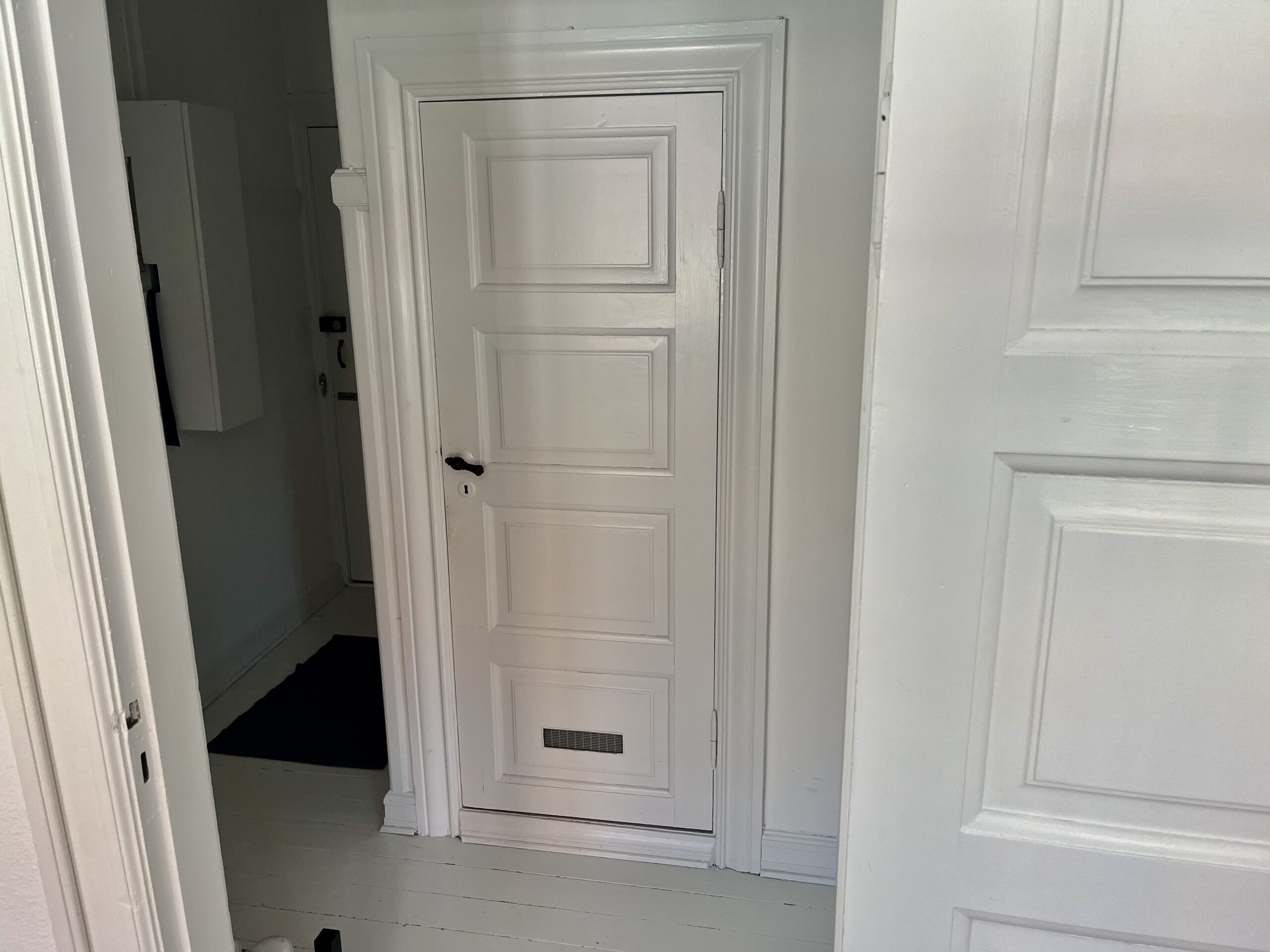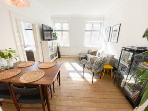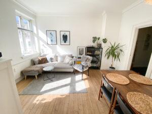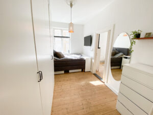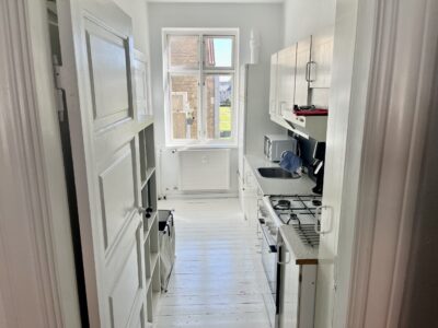 Resten af lejligheden er en stue af en god størrelse, hvor du både kan have et større spisebord samt et tv område. Af vinduerne strømmer der lys ind, som gør at man ikke behøver at have ret meget til intet lys tændt. Det samme gælder i soveværelset, hvor der også er lyst. Der er ingen faste skabe i soveværelset, så her er der mulighed for at medbringe sit eget. Det er også stort nok til både en dobbeltseng, klædeskab og et skrivebord.