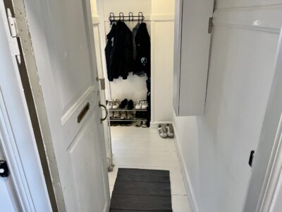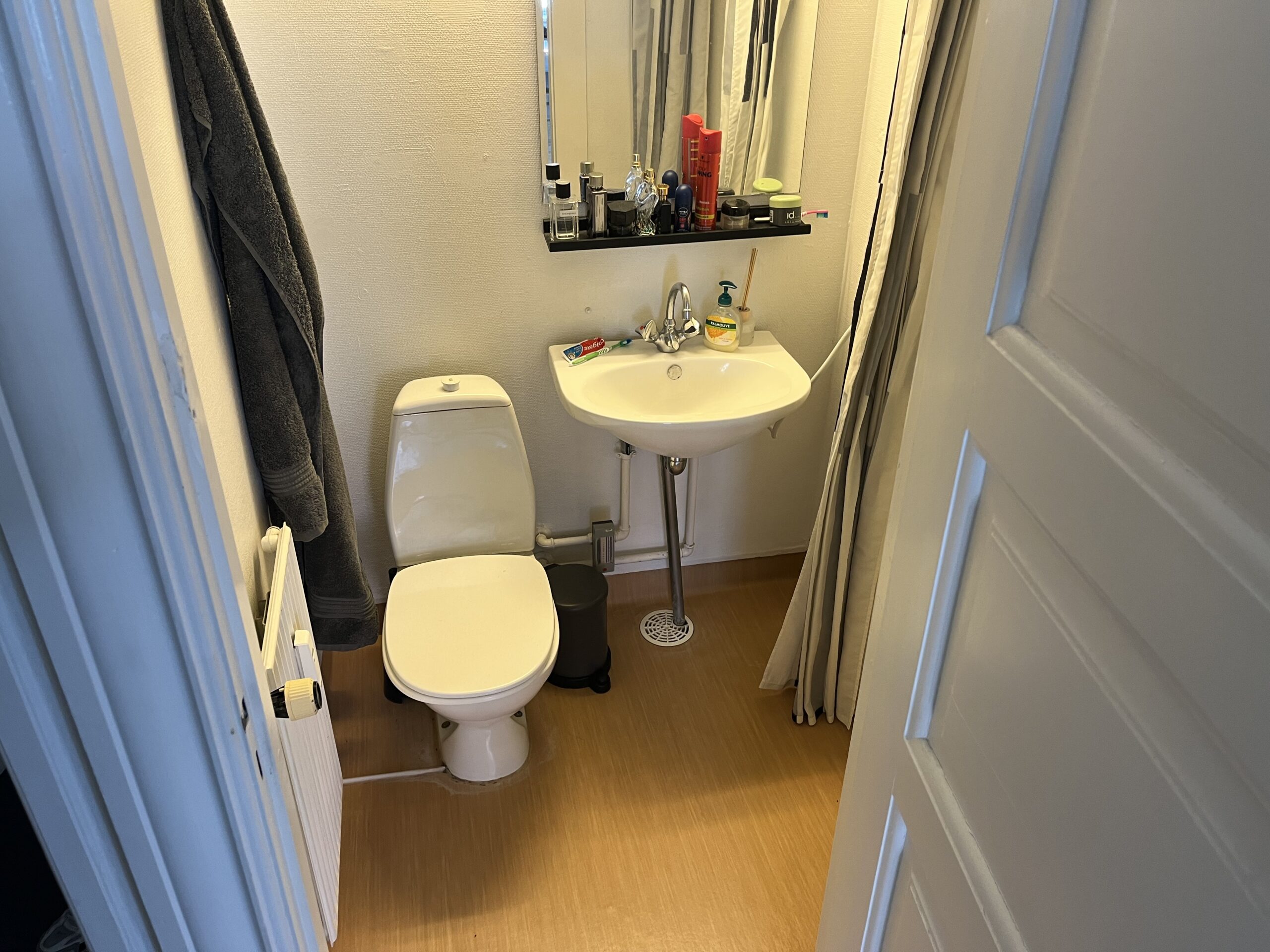 Når du træder ind i denne lejlighed, har du en lille entré, hvor der vil være plads til at hænge overtøj og sætte sine sko samt have et lille bord. Det første du kan gå ind i, når du kommer ind, er badeværelset. Her er der indsat en bruser over håndvasken, men der er sat en brusestand, som skærmer af fra resten af badeværelset, så der ikke er vand over det hele. Fra badeværelset kan du fortsætte ud i køkkenet, som har masser af skabsplads og har udsigt ud til gårdhaven.