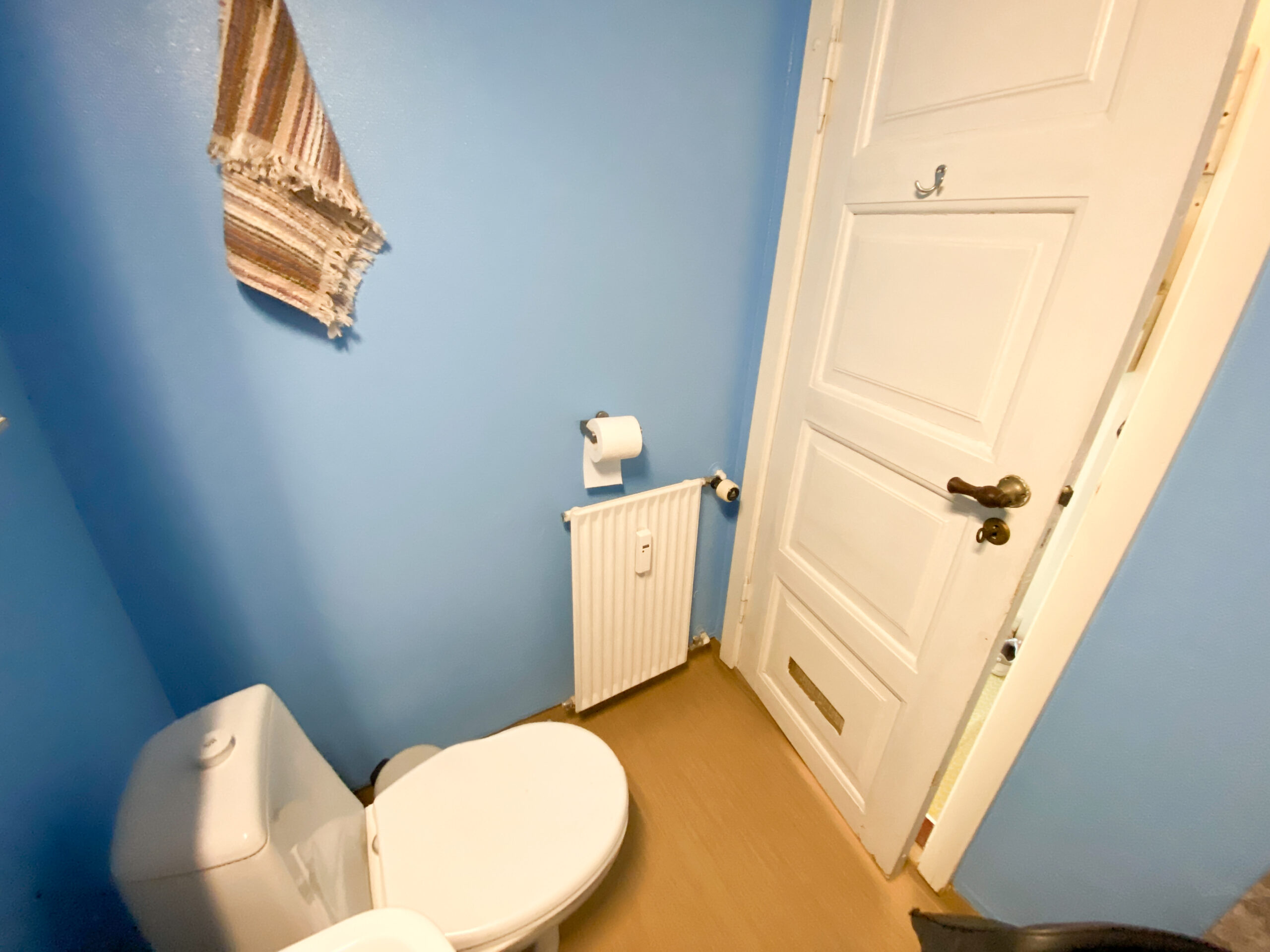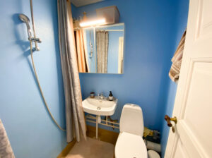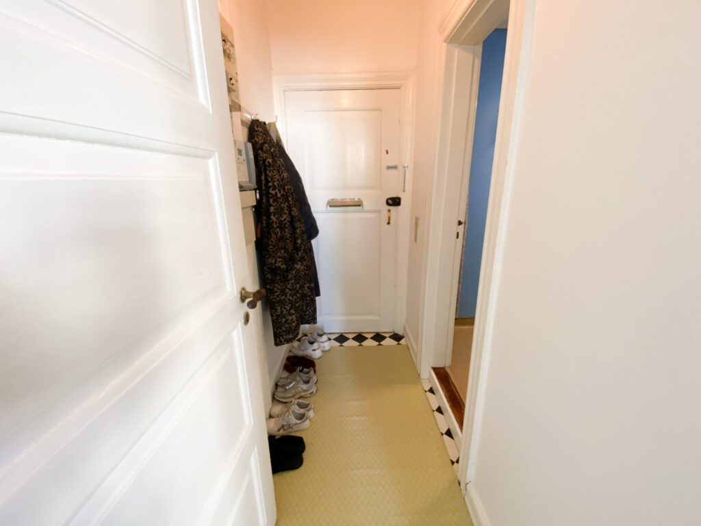 Lejligheden er bestående af en entré, hvor der er udgang til badeværelset. Der er lavet en forhængsstang i loftet, der gør, at forhænget omringer det område, hvor man bader.