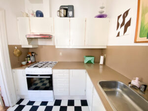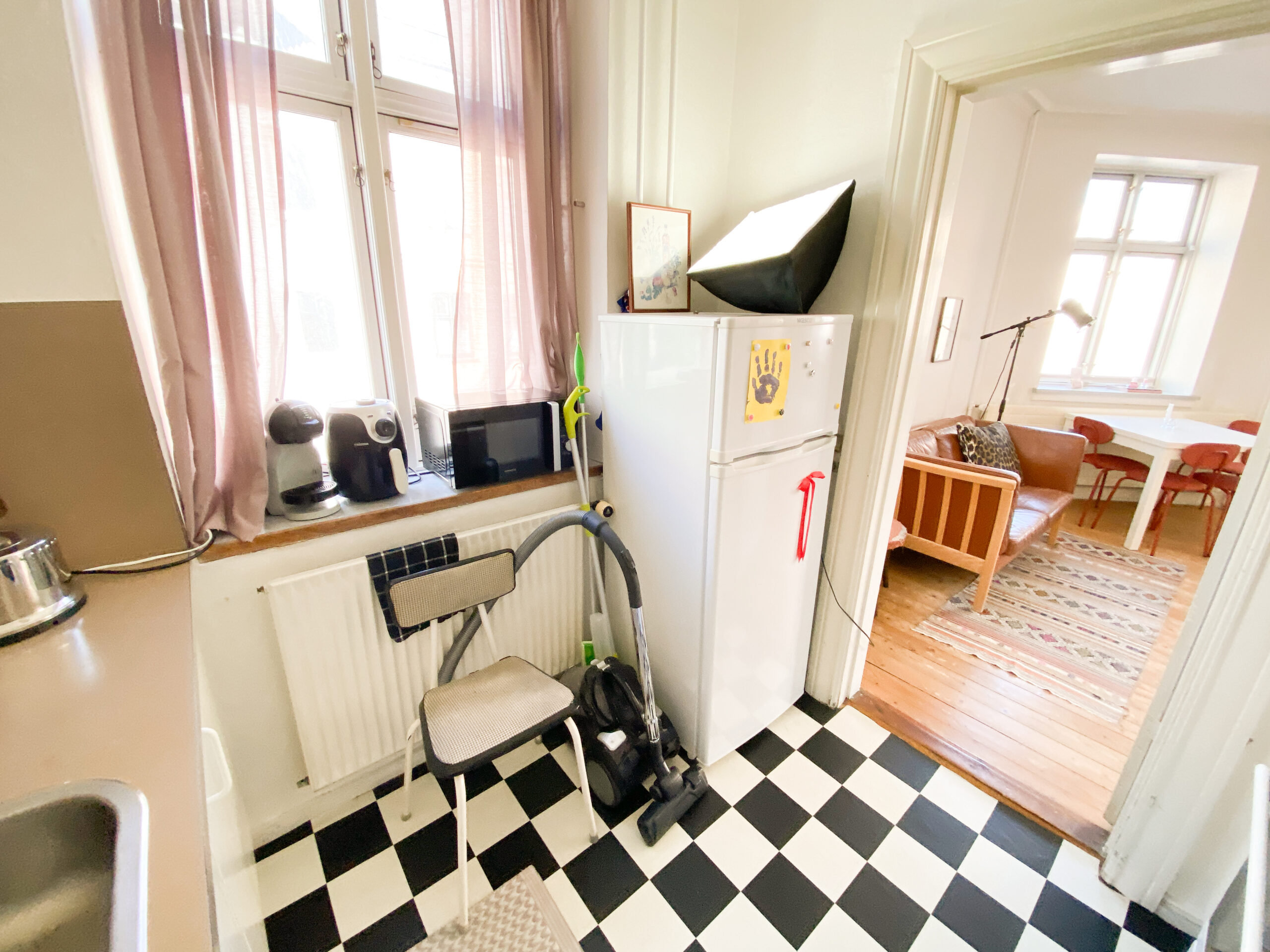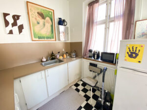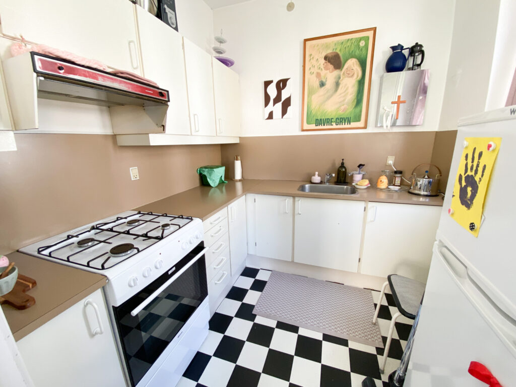 Til slut har vi køkkenet, som er i en flot retro brun farve, og som faktisk er rigtig flot. Det er en god størrelse, som ikke blot er et te-køkken.
