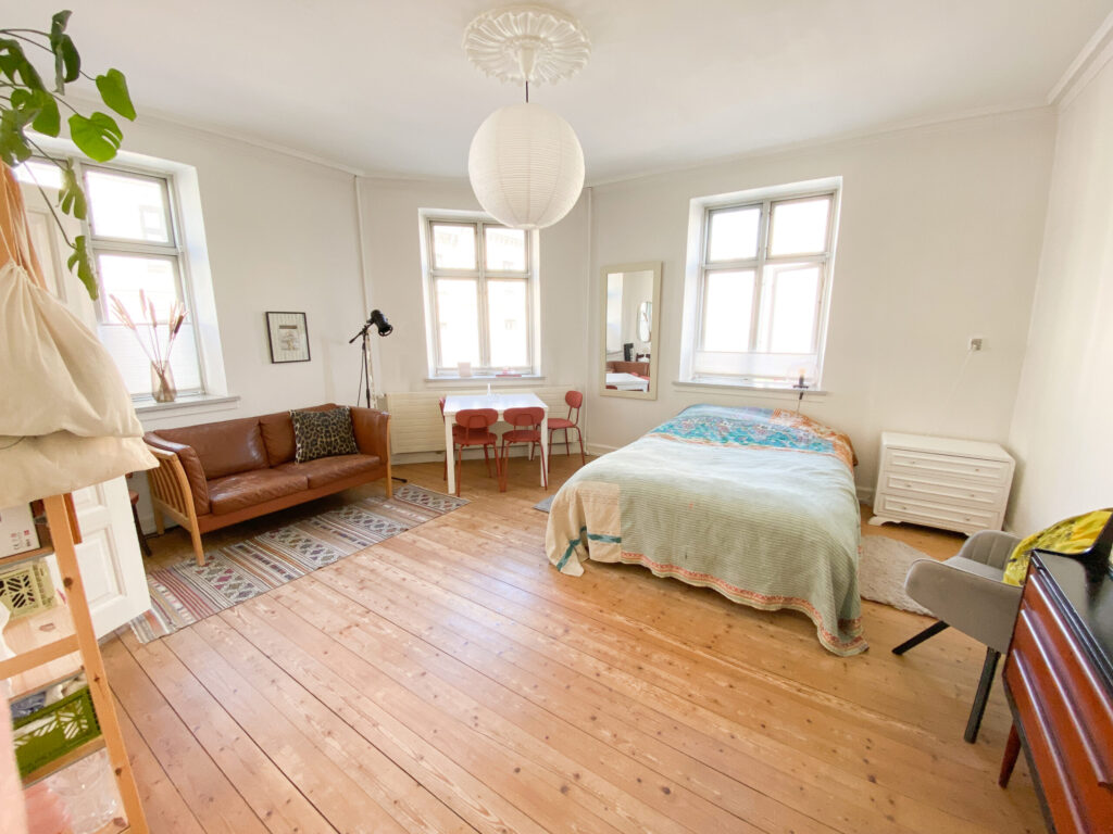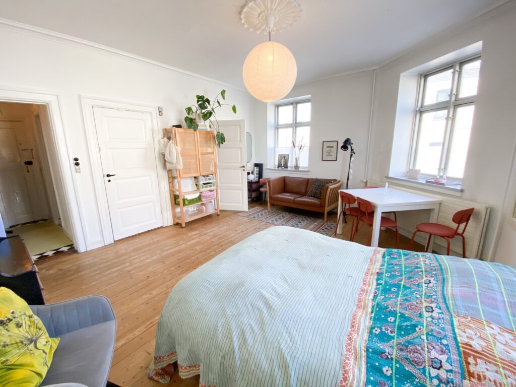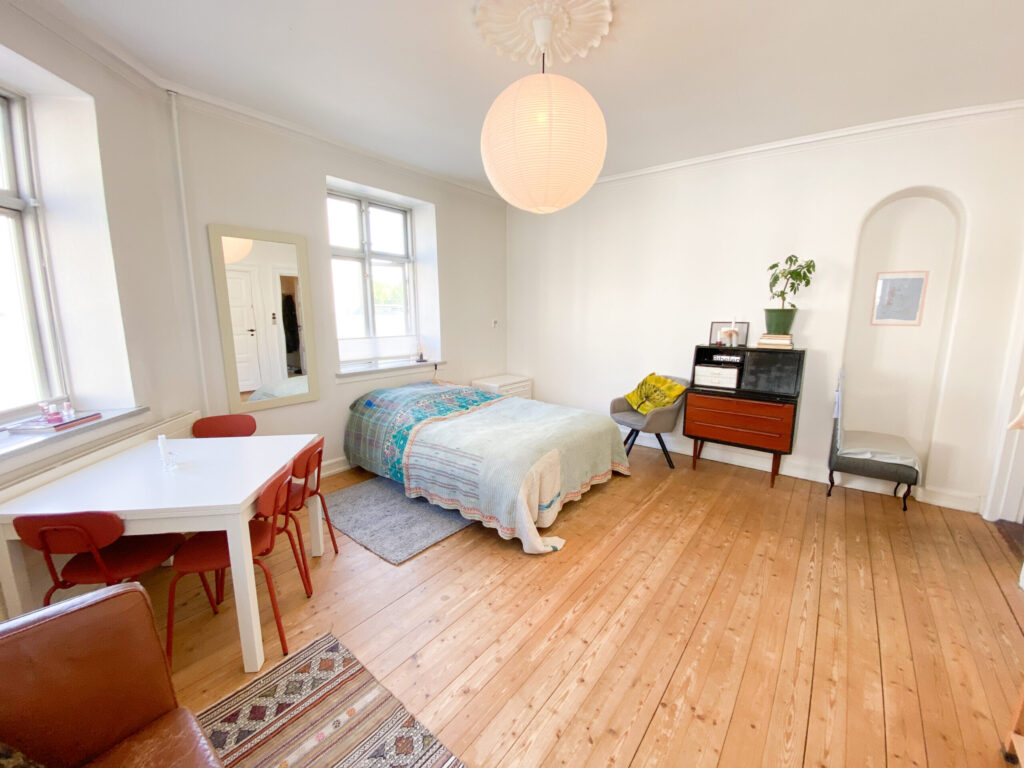 Så træder man ind i lejlighedens store flotte rum. Her er et indbygget skab blandt andet, og rummet er indrettet således, at man nemt kan have en masse i det.