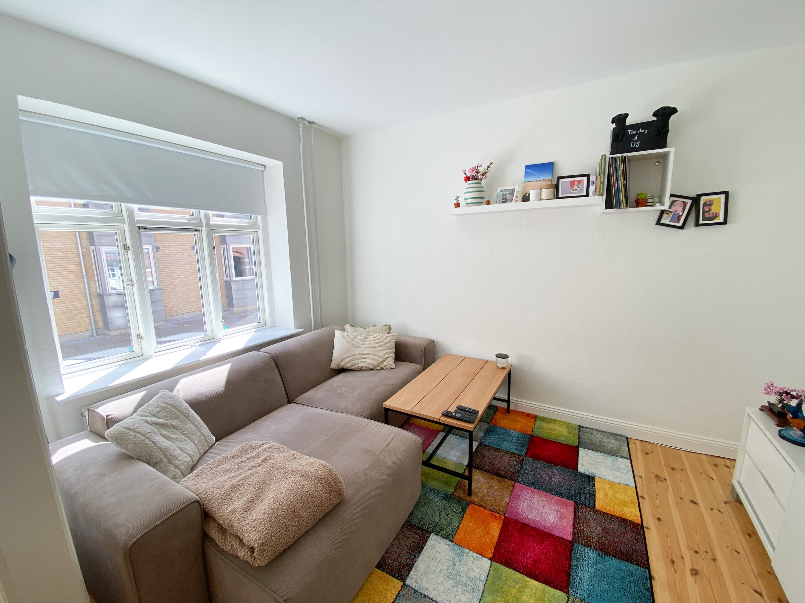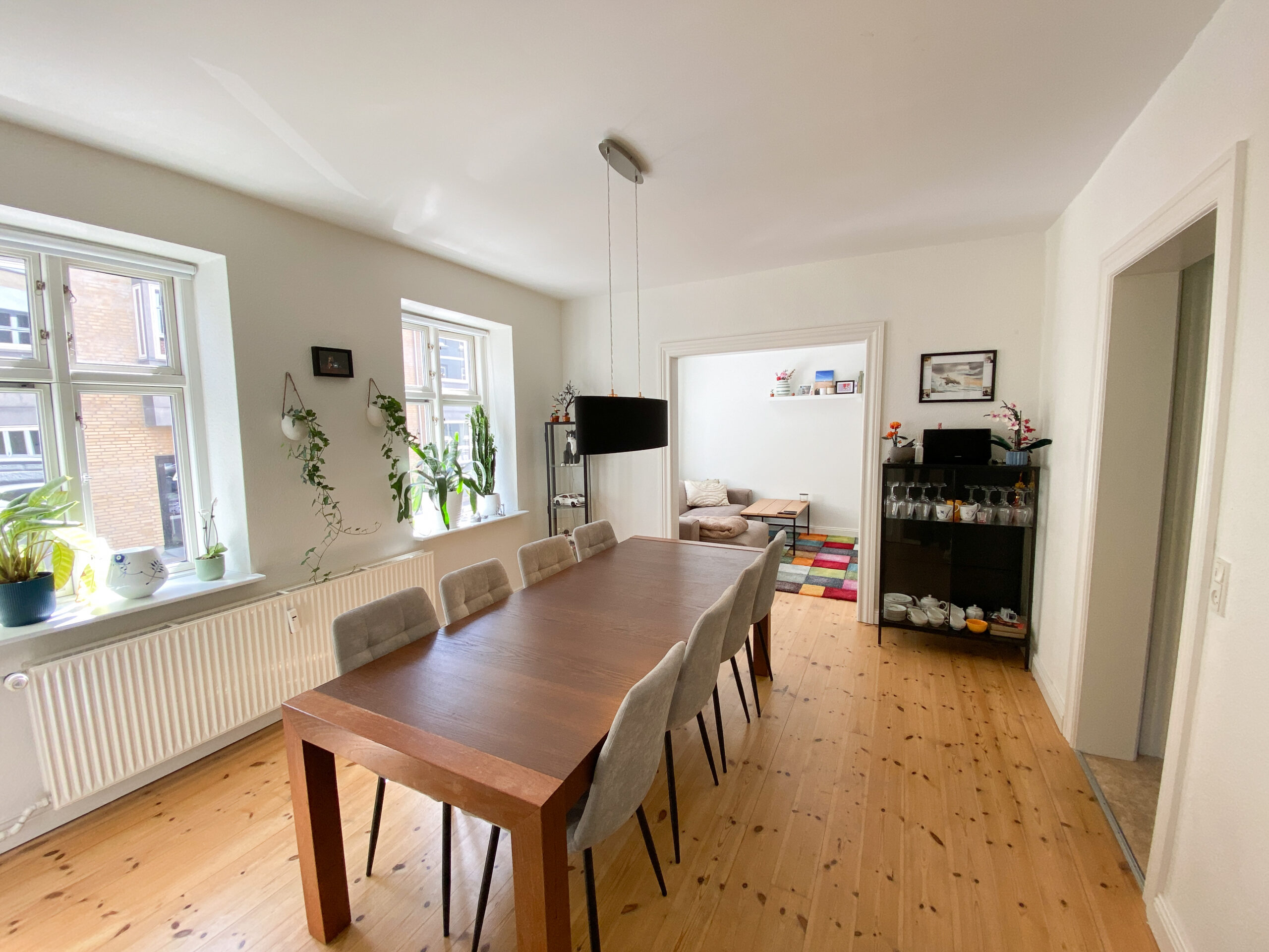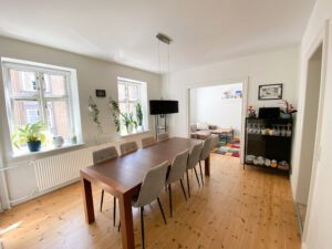 Lejligheden byder på en skøn dobbeltstue, der både giver plads til sofaafdeling og spisebord – ideelt til både afslapning og samvær med familie og venner. De pæne trægulve gennem boligen skaber en varm og indbydende atmosfære, og de gode lysindfald bidrager til den behagelige rumfornemmelse.