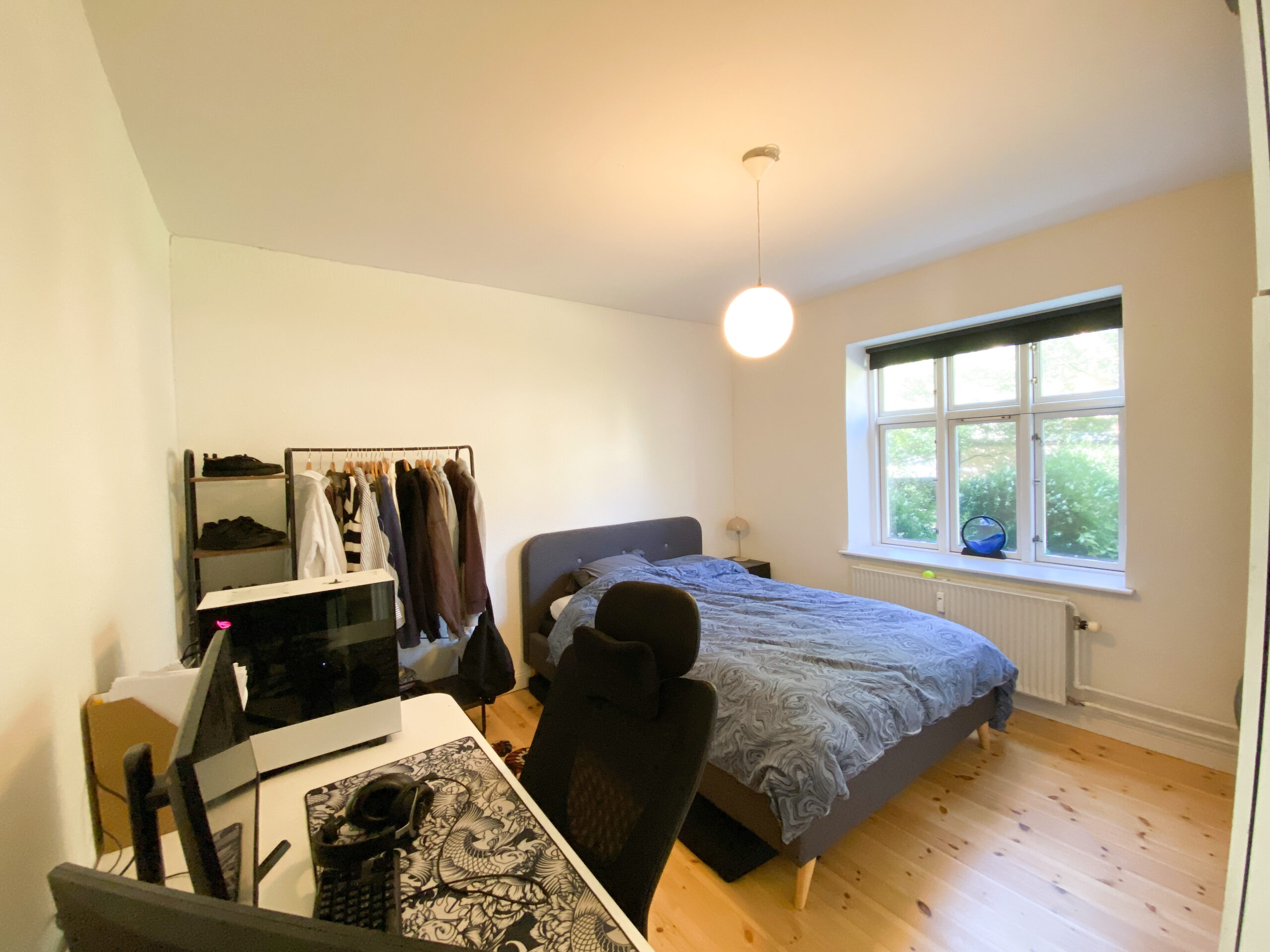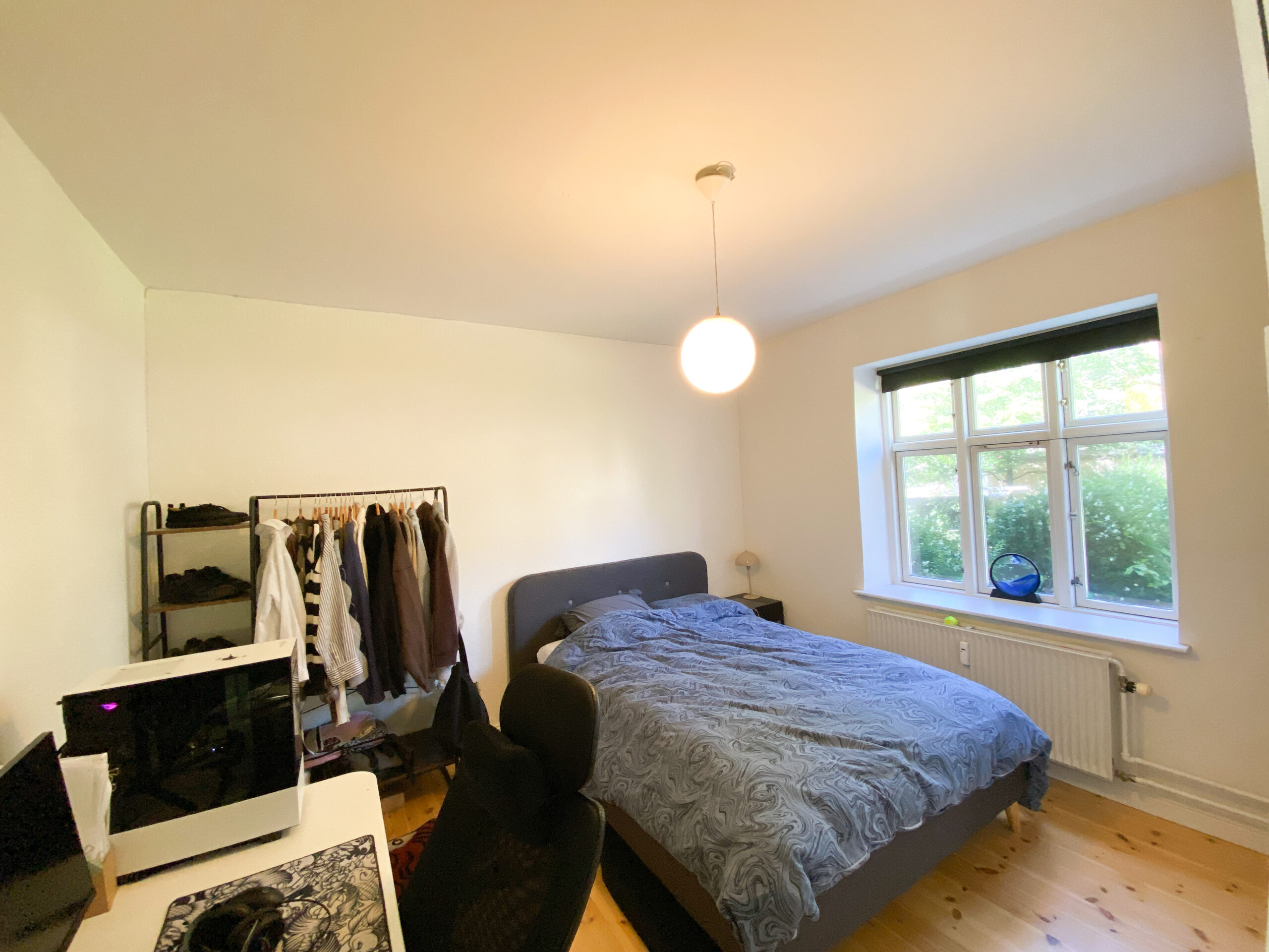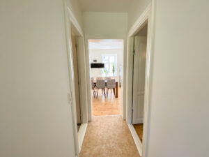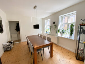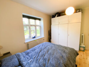 Soveværelset er rummeligt og roligt placeret mod en hyggelig, grøn gårdhave – et ideelt sted at trække sig tilbage og finde ro. Hertil kommer en praktisk fordelingsgang mellem stuen og køkkenet, som giver en naturlig adskillelse mellem opholdsrum og det mere praktiske område.