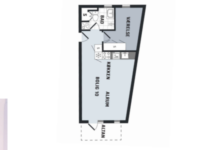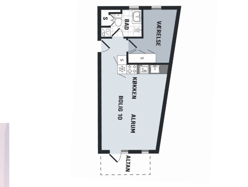 Lejligheden er bestående af en entré med indgang til badeværelset til venstre. Det er dejligt med separat brus og vaskesøjle. Går man ligeud fra entreen kommer man ind i soveværelset, her er der indbyggede skabe og et godt vindue.