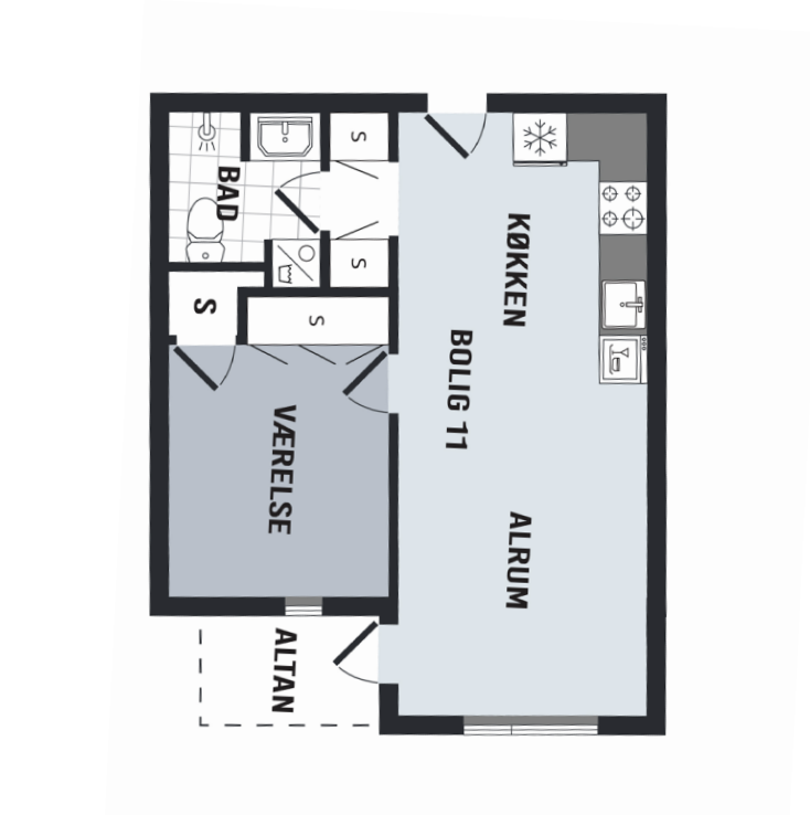 Lejligheden er bestående af et soveværelse, badeværelse med separat brus, et køkken-alrum med udgang til altan samt et soveværelse med indbyggede skabe.