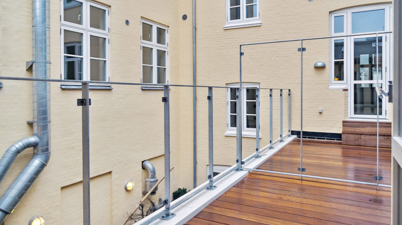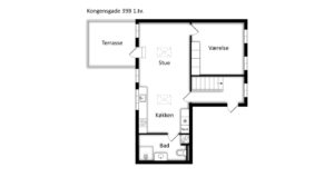 Lejligheden er beliggende på 1. sal i baghuset, som er tilbagetrukket fra Kongensgade . Lejligheden er en 2 værelses lejlighed på 69 m² med udgang til ca. 9 m² terrasse.