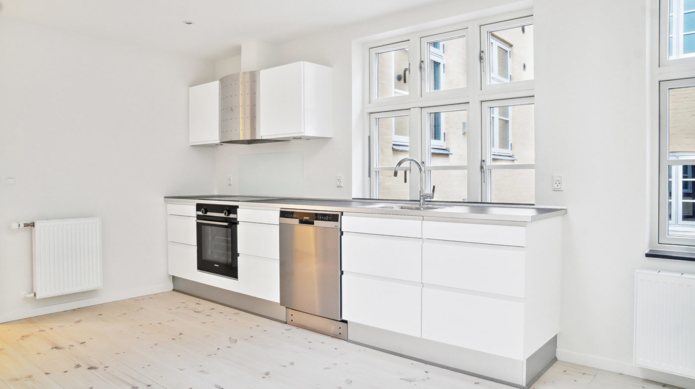 Fra opgangen går man direkte ind stort køkken/alrum, hvor der er plads til spisebordet. Køkkenet er et flot højglans køkken fra Designa med alle hårde hvidevarer i rustfrit stål, herunder opvaskemaskine.