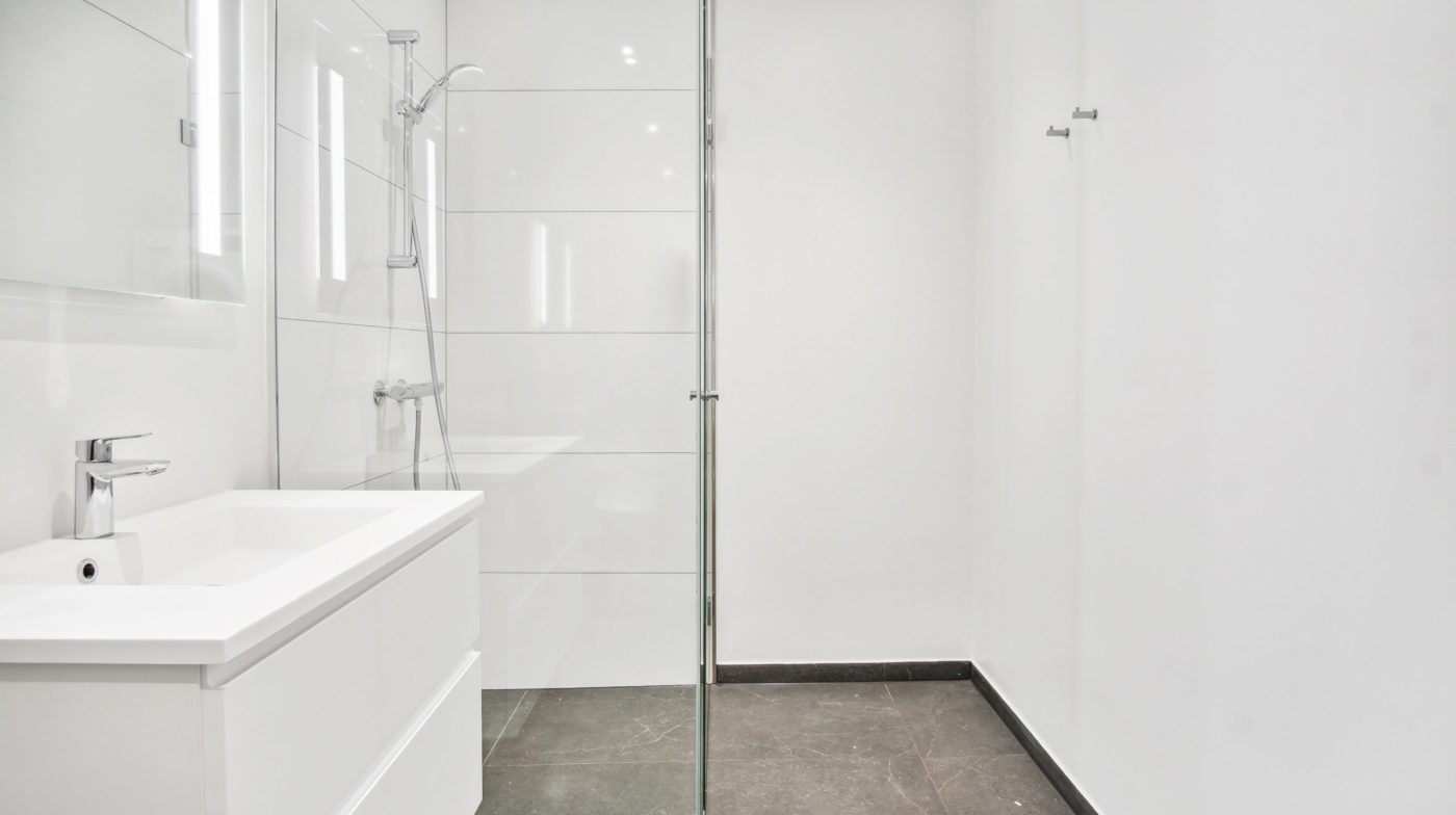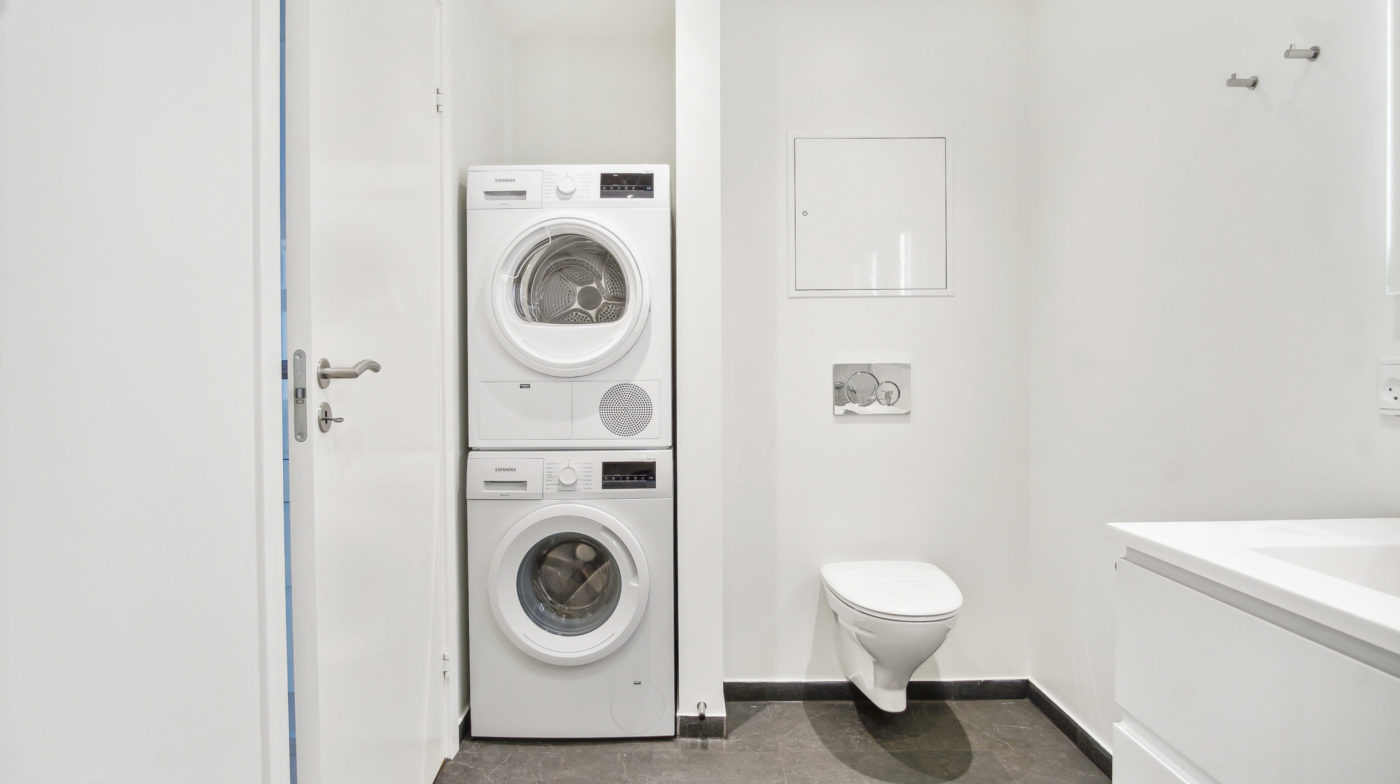 I badeværelset er der bruseniche, gulvvarme, væghængt toilet, egen vaske- og tørremaskine m.m.
