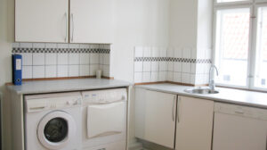 Fra lejlighedens anden entré er der adgang til stort flot køkken med spiseplads og alt i hårde hvidevarer herunder opvaskemaskine, samt vaskemaskine og tørretumbler.