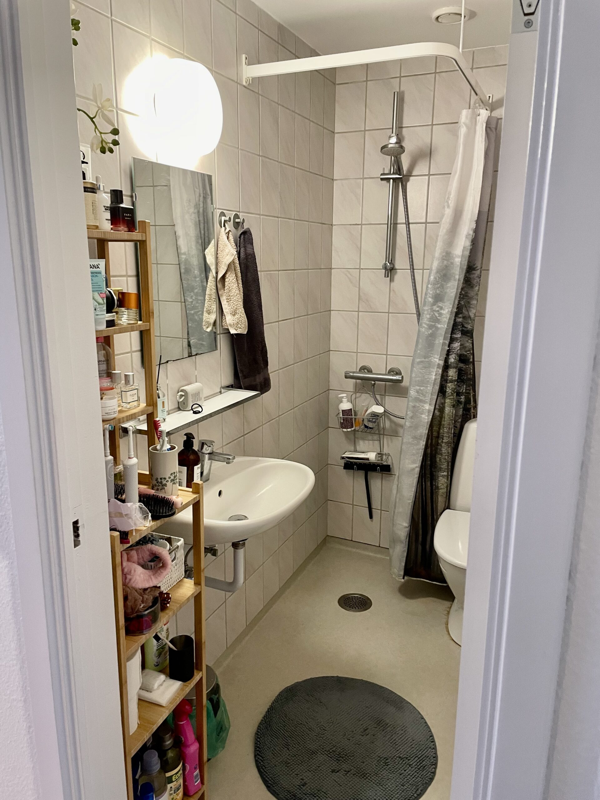 Badeværelset er også nyere i det og har til trods for lejlighedens størrelse separat brus ved siden af toilettet, som mange værdsætter meget.