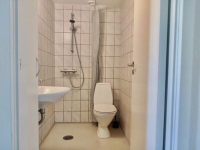 Badeværelset er også nyere i det og har til trods for lejlighedens størrelse separat brus ved siden af toilettet, som mange værdsætter meget.