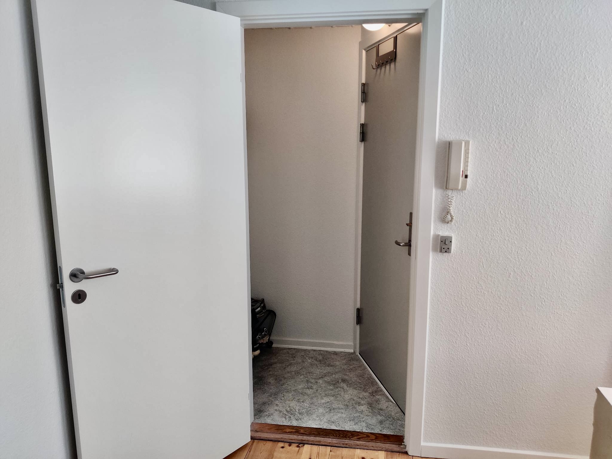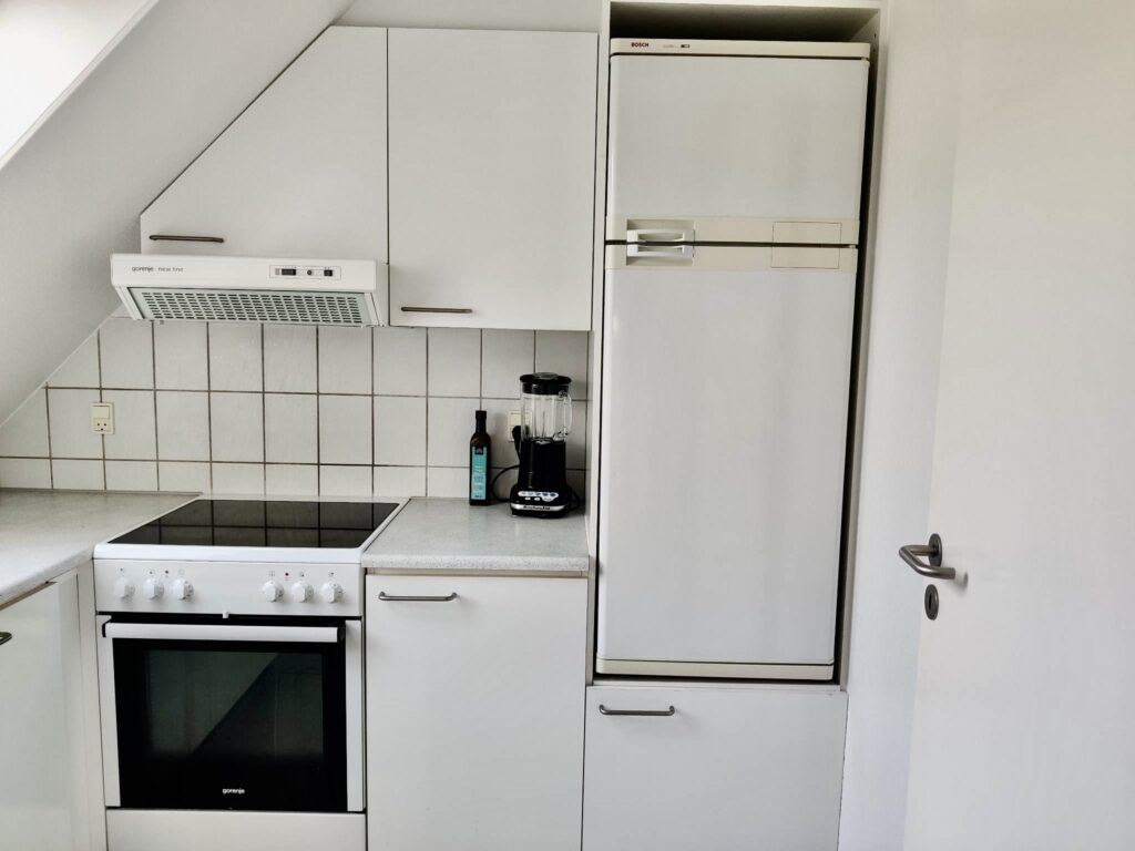 Lejligheden er bestående af en entré for sig, hvor man kan sætte overtøj og sko. Derudover er der et fint køkken i nyere materialer og med god skabsplads.