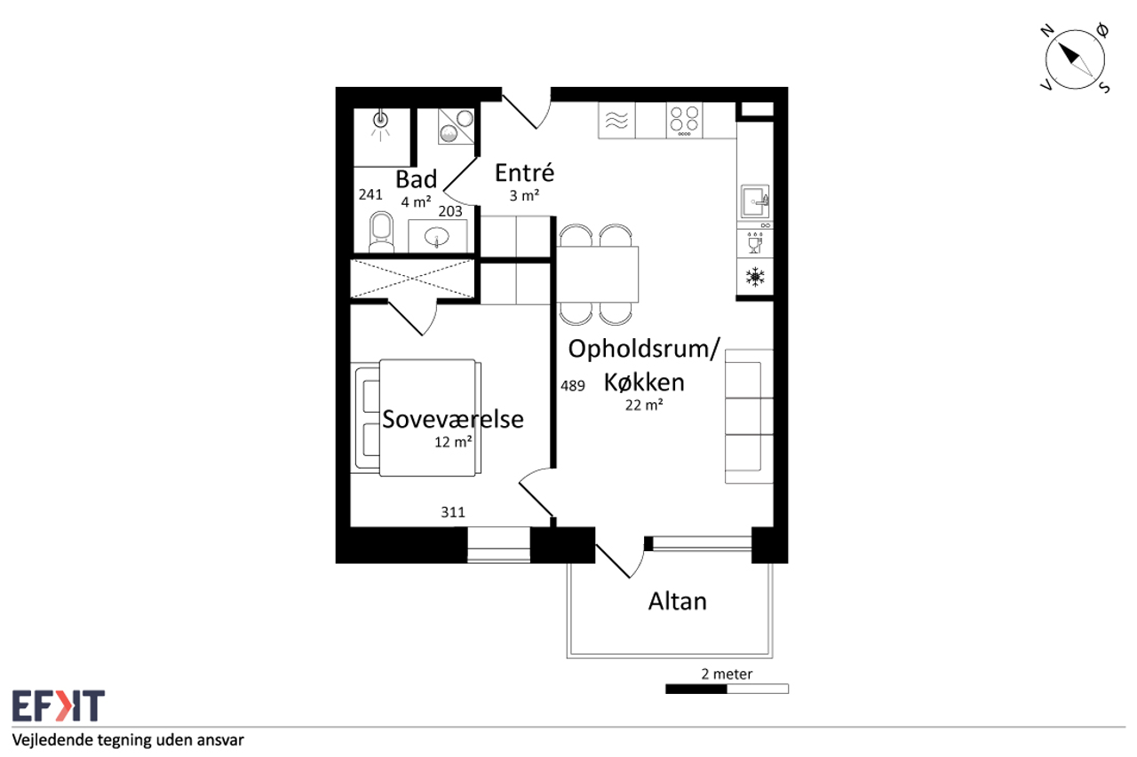 Lejlighederne henvender sig til unge par, singler eller seniorer. Materialerne afspejler i høj grad tiden, og der er kvalitet og en flot rød tråd over hele linjen – så er det bare op til dig at sætte dit præg med din personlige indretning. Alle boliger beriges af et åbent opholdsmiljø, og det er herfra, altanen tilgås. Om du får glæde af morgen- eller aftensolen, så er det bare om at komme ud og nyde det eksklusive uderum, der giver plads til loungesættet og en grill. Denne lejlighed har sydvendt altan.