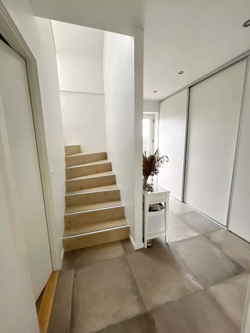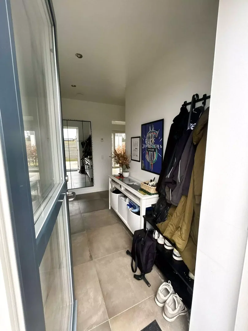 Rækkehuset byder på en rummelig entré, der elegant kombinerer funktionalitet med stil, herunder vaskemaskine og tørretumbler samt et gæstetoilet. Det åbne køkkenalrum stråler af lys og giver direkte adgang til en indbydende stue. Herfra kan du træde ud på den dejlige terrasse, der fører til en betagende have – et privat fristed for afslapning og leg.