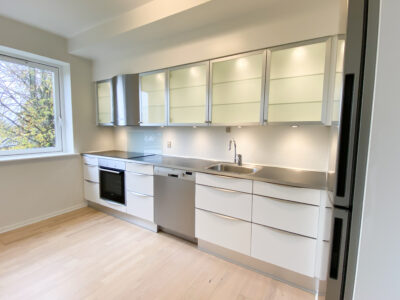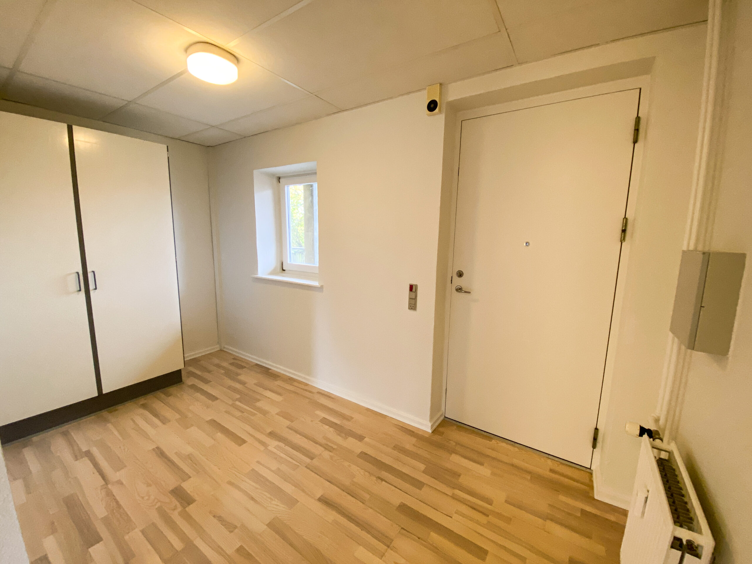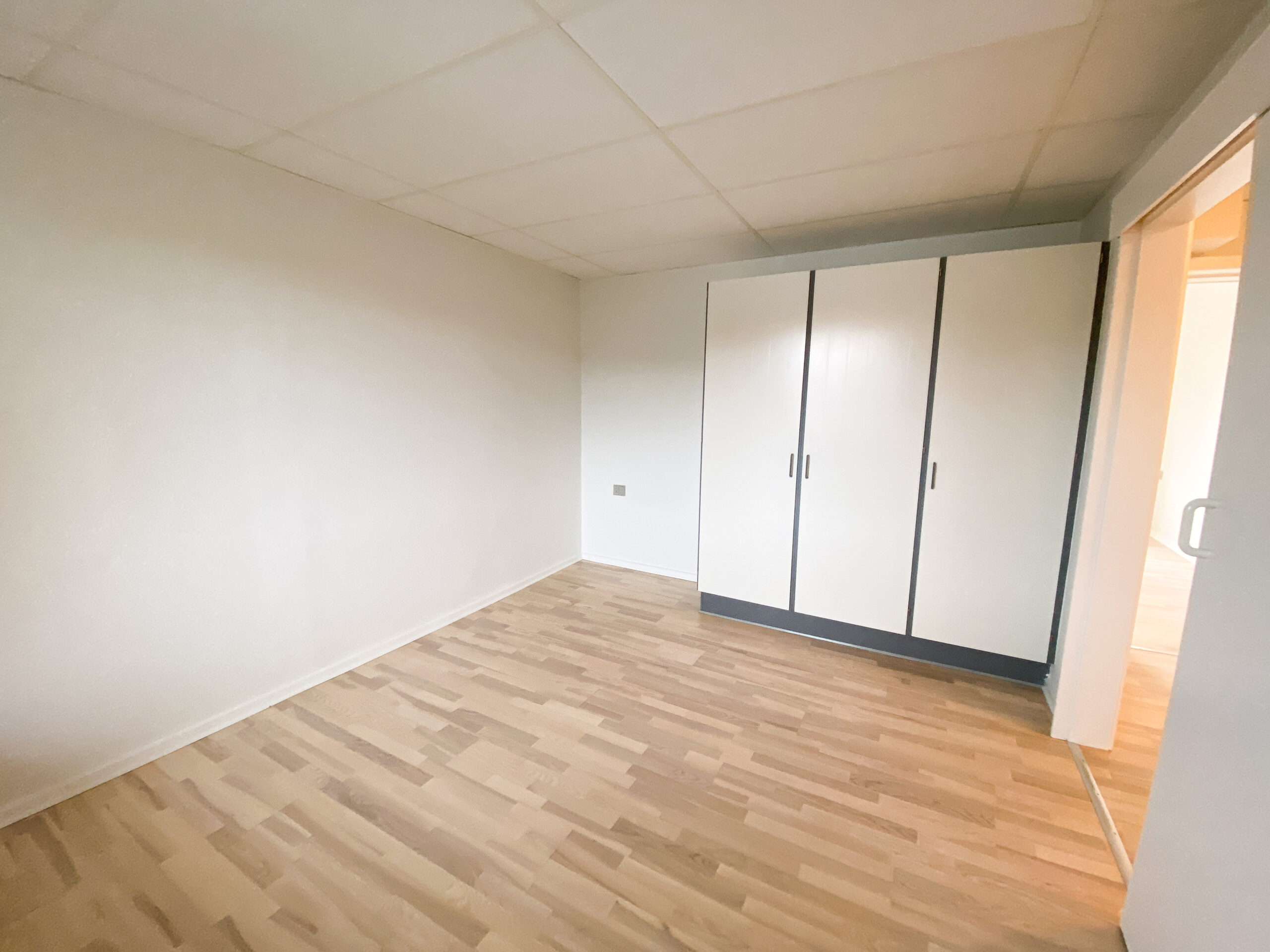 Derudover er der lejlighedens soveværelse, som har allerede har et klædeskab.Her er der plads til et skrivebord også udover en god stor seng. Lejligheden er udstyret med skydedøre, der gør det handicapvenligt samt seniorvenligt. Der er heller ingen dørtrin. Dette er der også ud til lejlighedens badeværelse. Her er der en vaskemaskine og en brusekabine med brusedøre, der kan sammenklappes, så det ikke fylder så meget. her er der også god gulvplads.