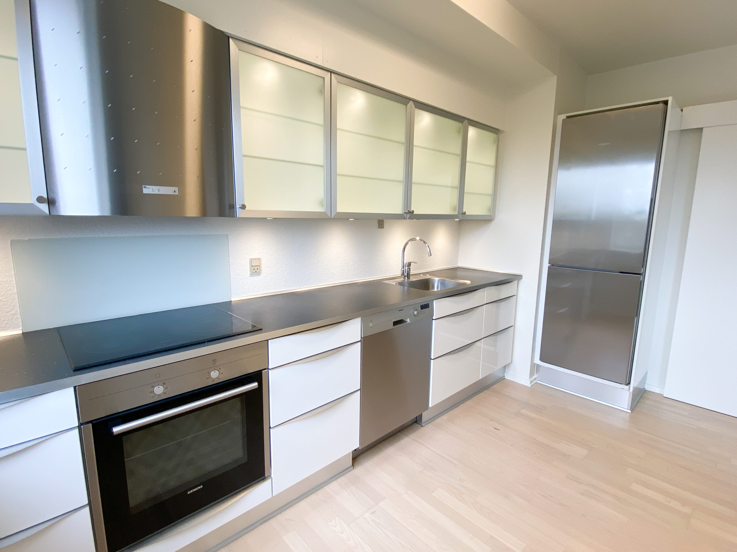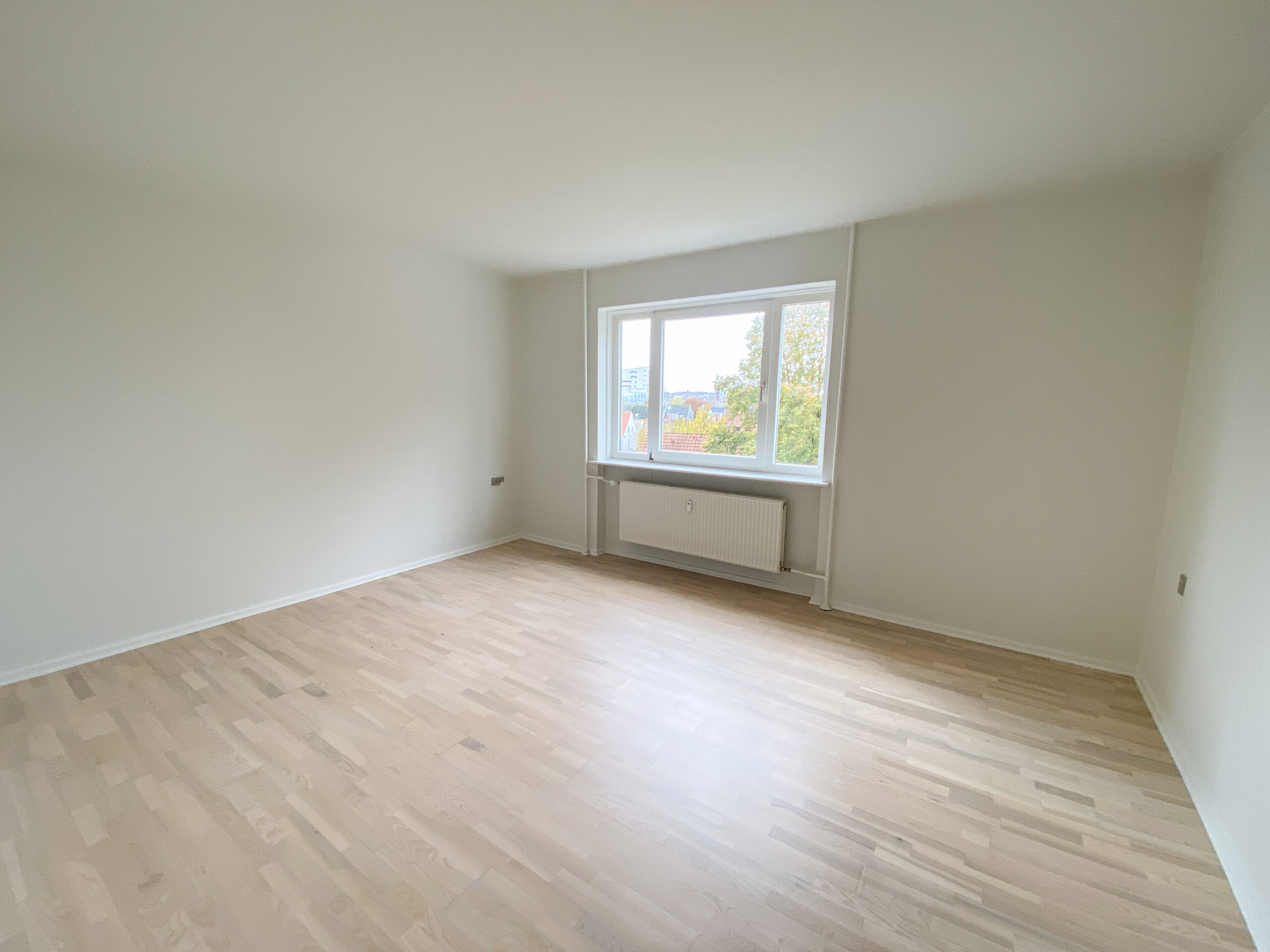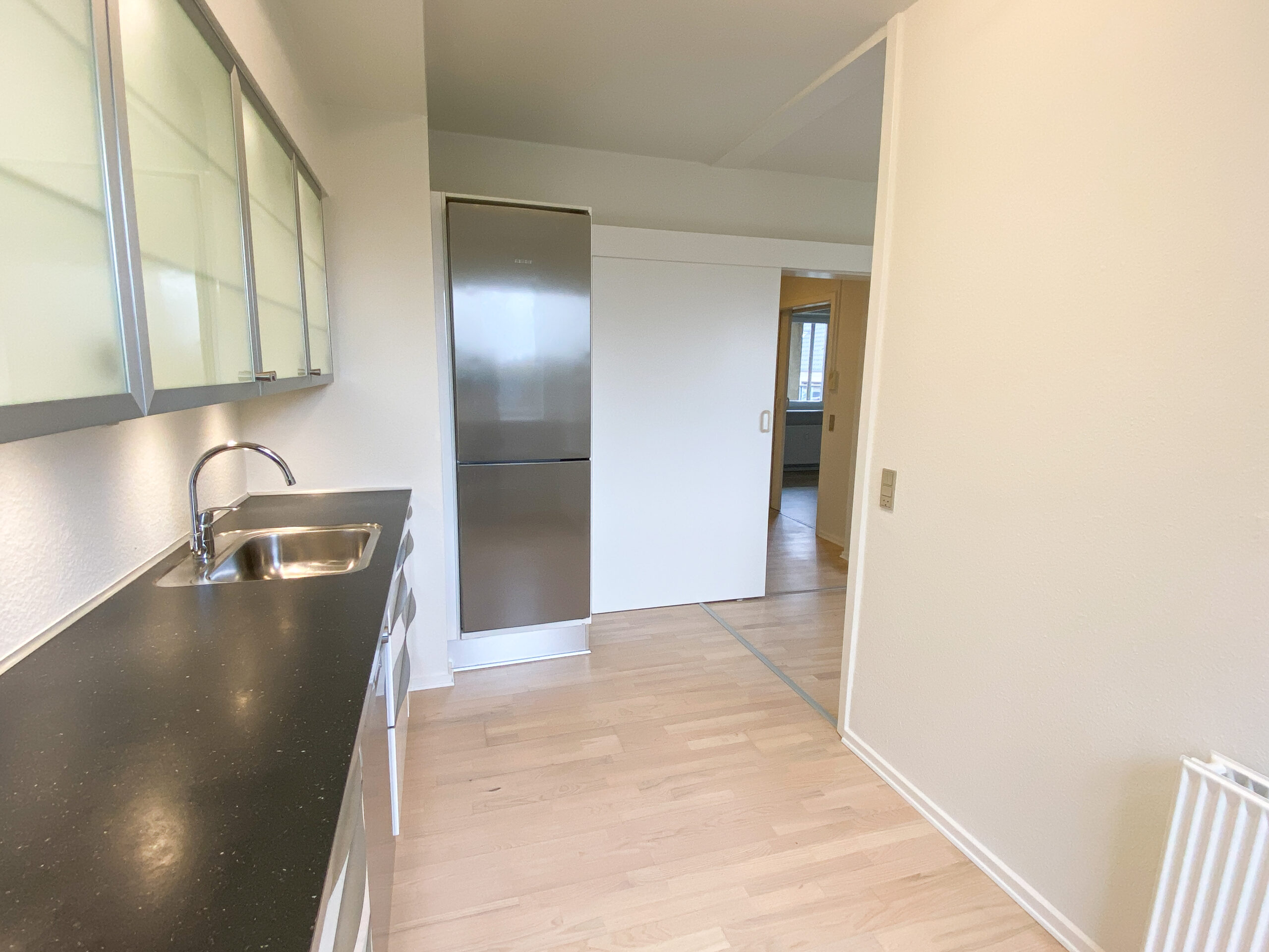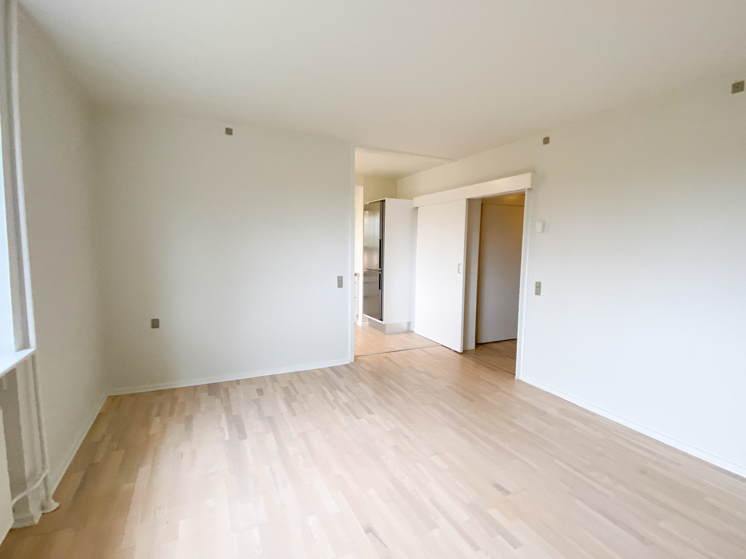 Lejligheden er bestående af et stort delvist køkken-alrum, hvor køkkenet er skærmet lidt af med en væg, der har en stor åbning i siden. Køkkenet er nyere og med opvaskemaskine. Stuen er rimelig stor og der er plads til både et stort sofaområde og spisebord m.m. Af vinduet kommer der masser af lys og der er en god udsigt.
