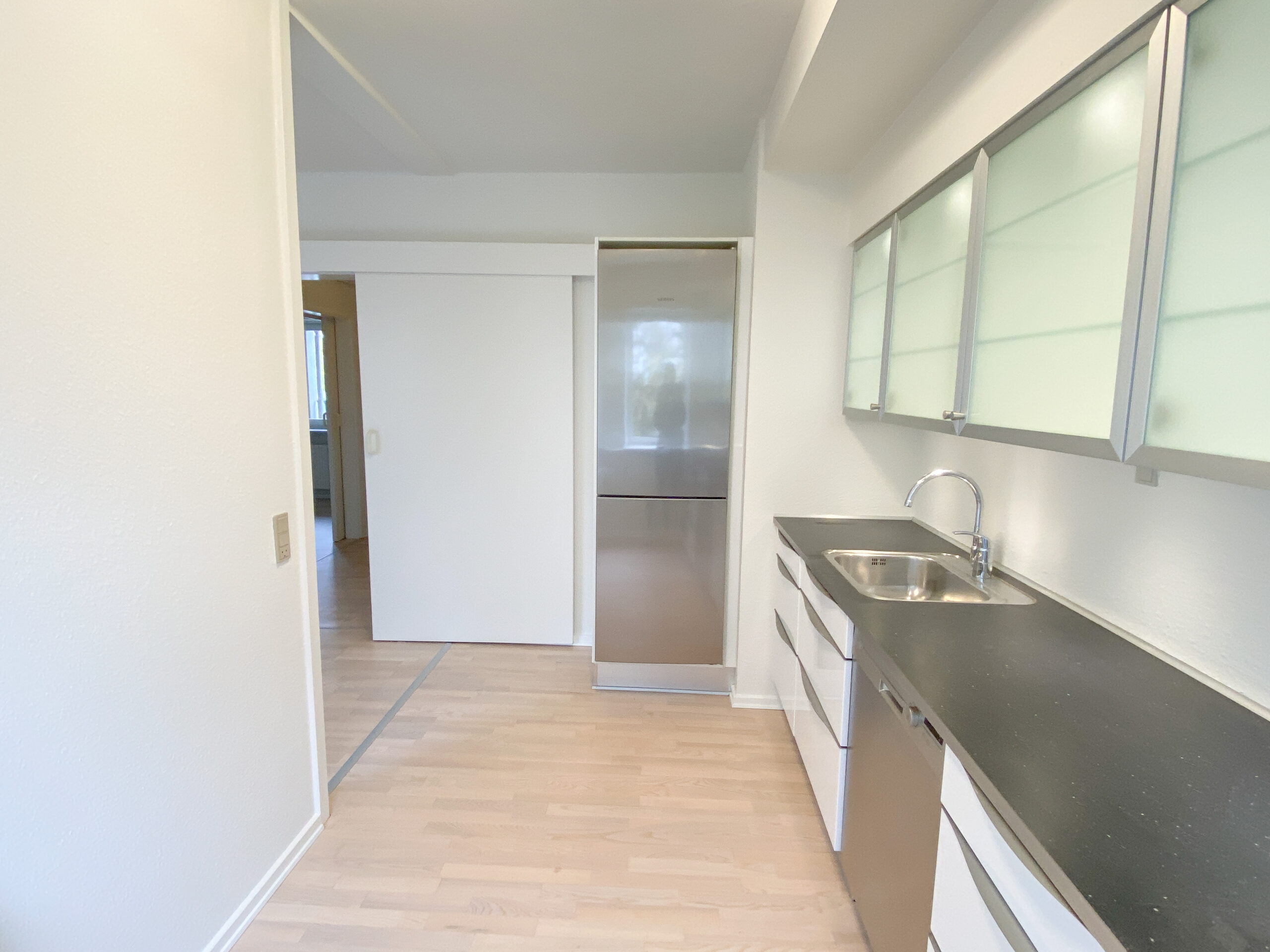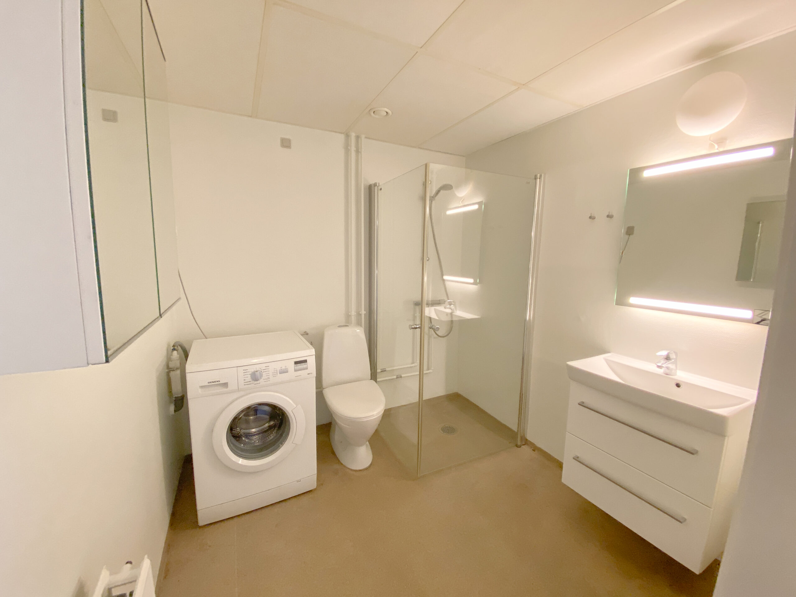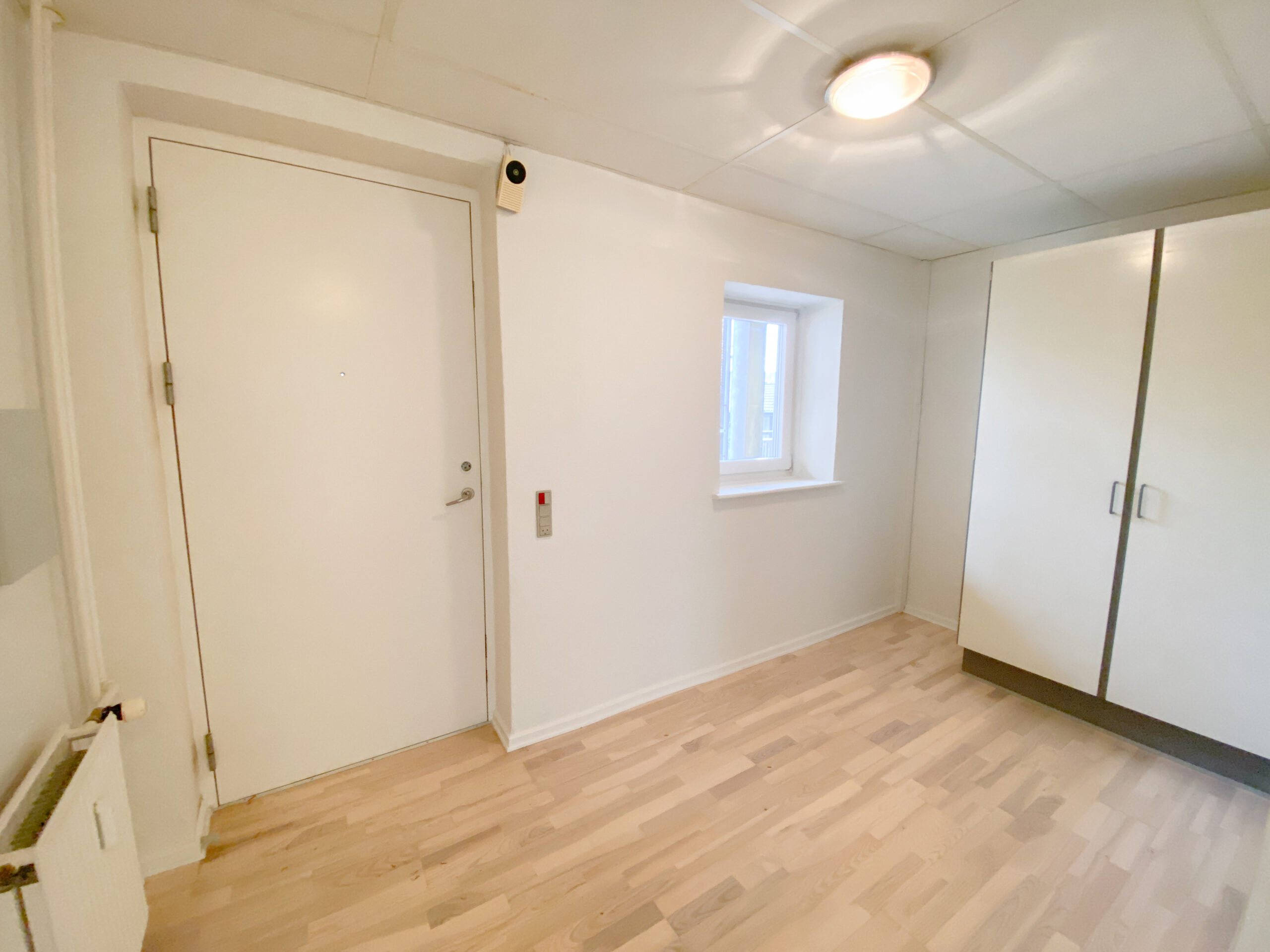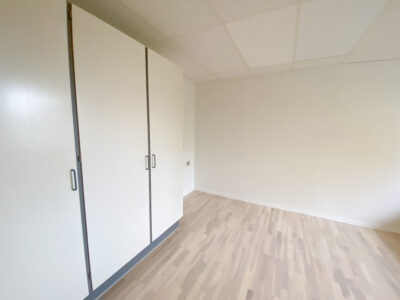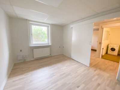 Derudover er der lejlighedens soveværelse, som har allerede har et klædeskab.Her er der plads til et skrivebord også udover en god stor seng. Lejligheden er udstyret med skydedøre, der gør det handicapvenligt samt seniorvenligt. Der er heller ingen dørtrin. Dette er der også ud til lejlighedens badeværelse. Her er der en vaskemaskine og en brusekabine med brusedøre, der kan sammenklappes, så det ikke fylder så meget. her er der også god gulvplads.