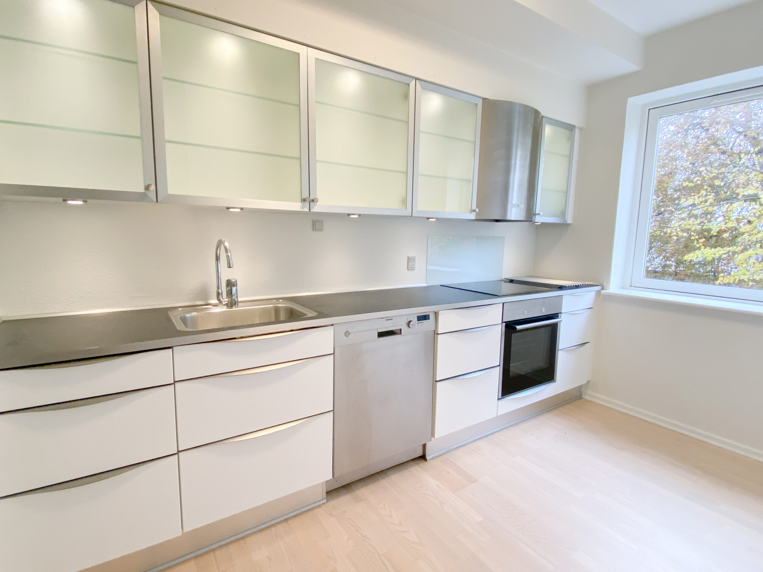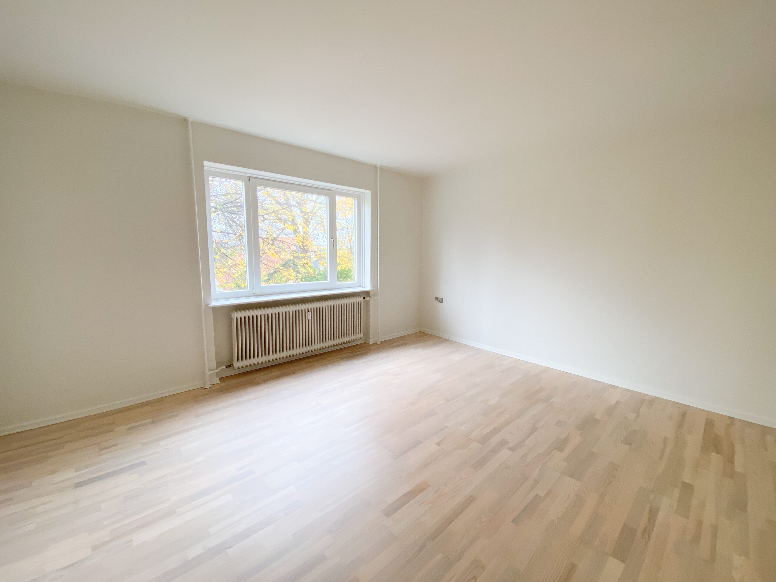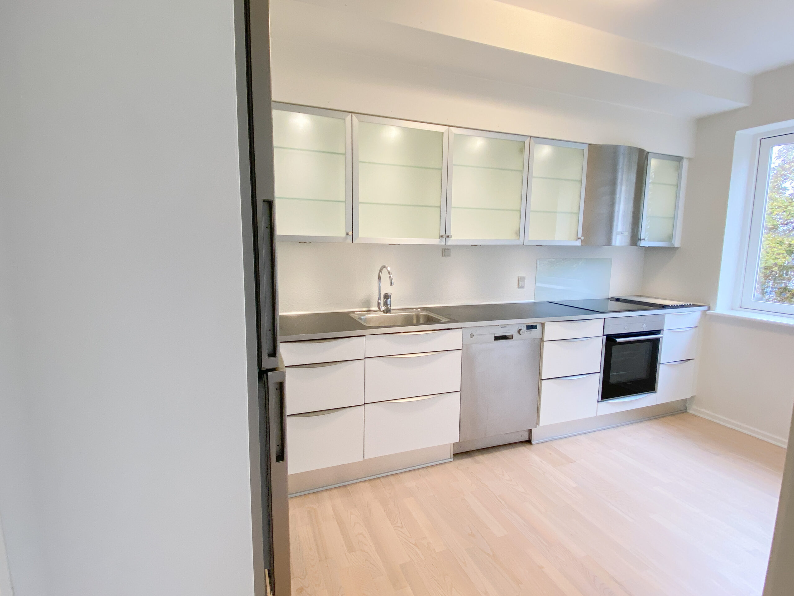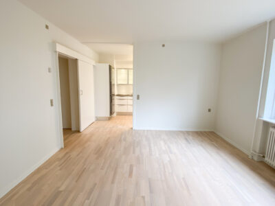 Lejligheden er bestående af et stort delvist køkken-alrum, hvor køkkenet er skærmet lidt af med en væg, der har en stor åbning i siden. Køkkenet er nyere og med opvaskemaskine. Stuen er rimelig stor og der er plads til både et stort sofaområde og spisebord m.m. Af vinduet kommer der masser af lys og der er en god udsigt.