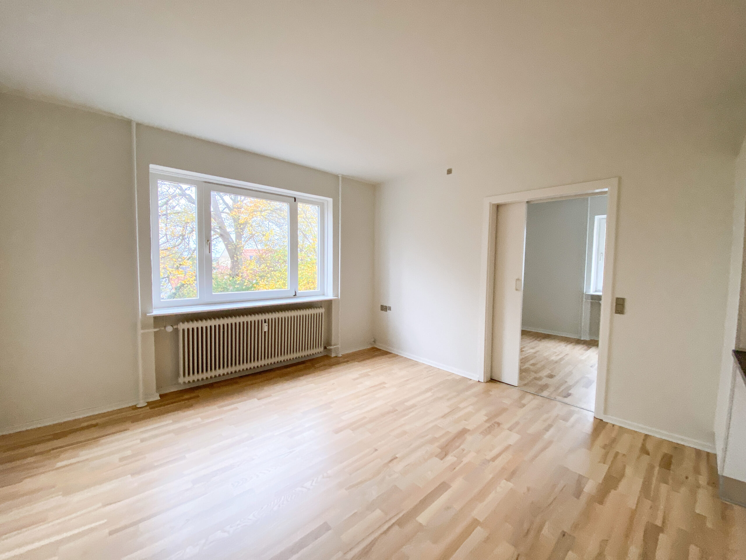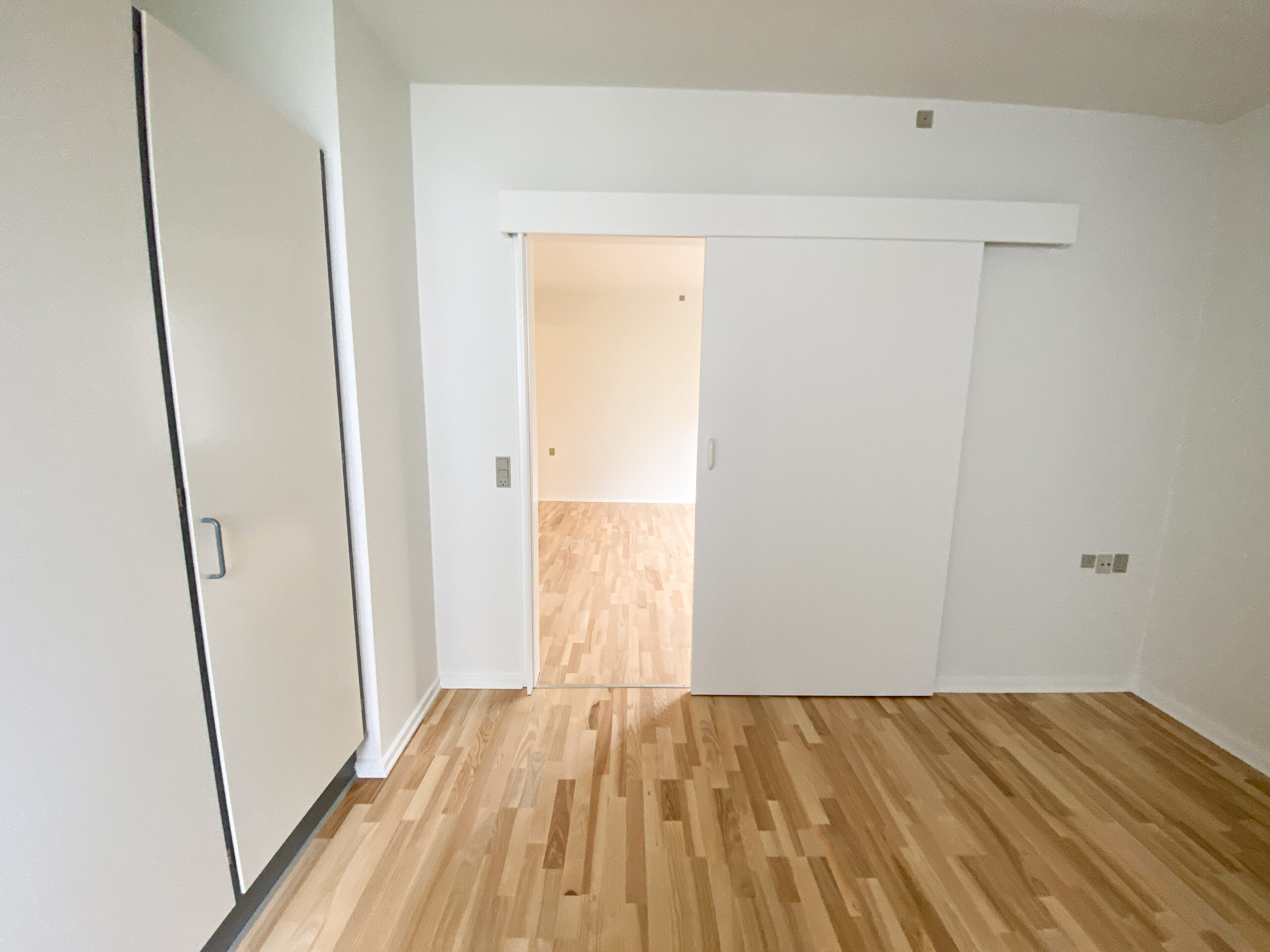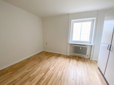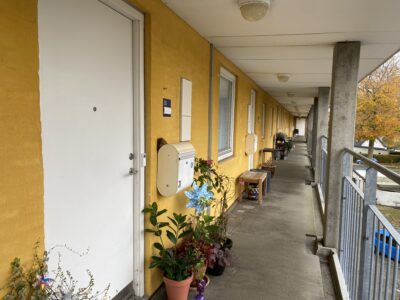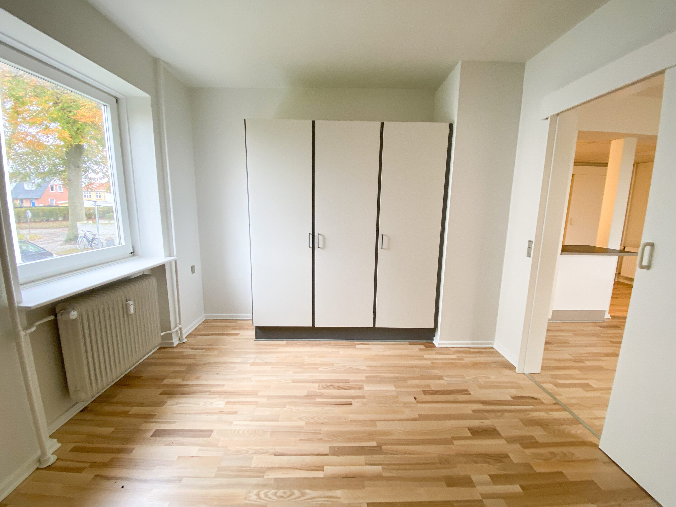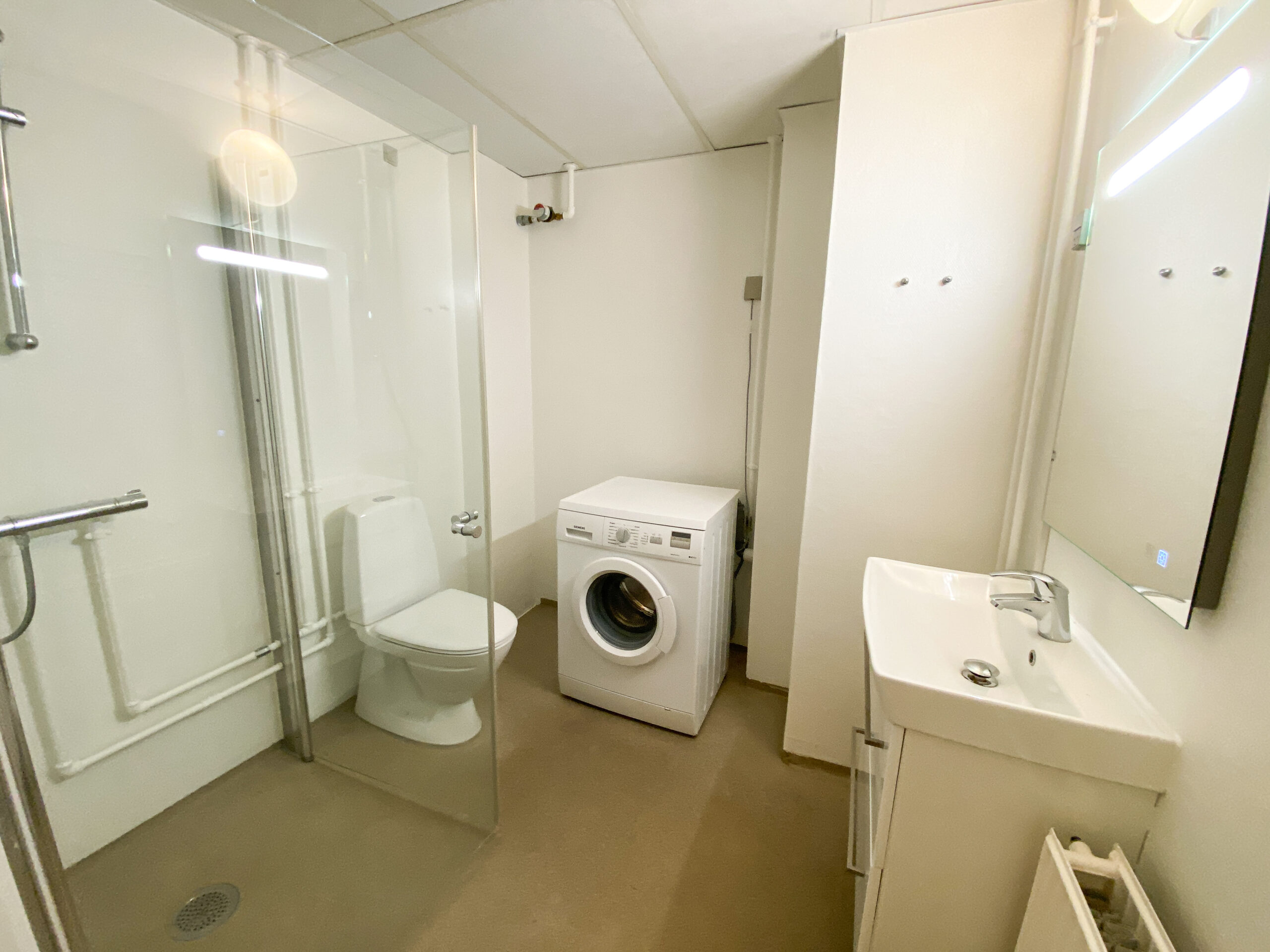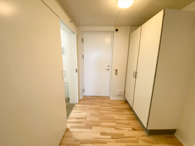 Derudover er der lejlighedens soveværelse, som har allerede har et klædeskab. Mellem køkken-alrum og soveværelset er en skydedør, som gør det lettere at åbne for ældre. Dette er der også ud til lejlighedens badeværelse. Her er der en vaskemaskine og en brusekabine med brusedøre, der kan sammenklappes, så det ikke fylder så meget.