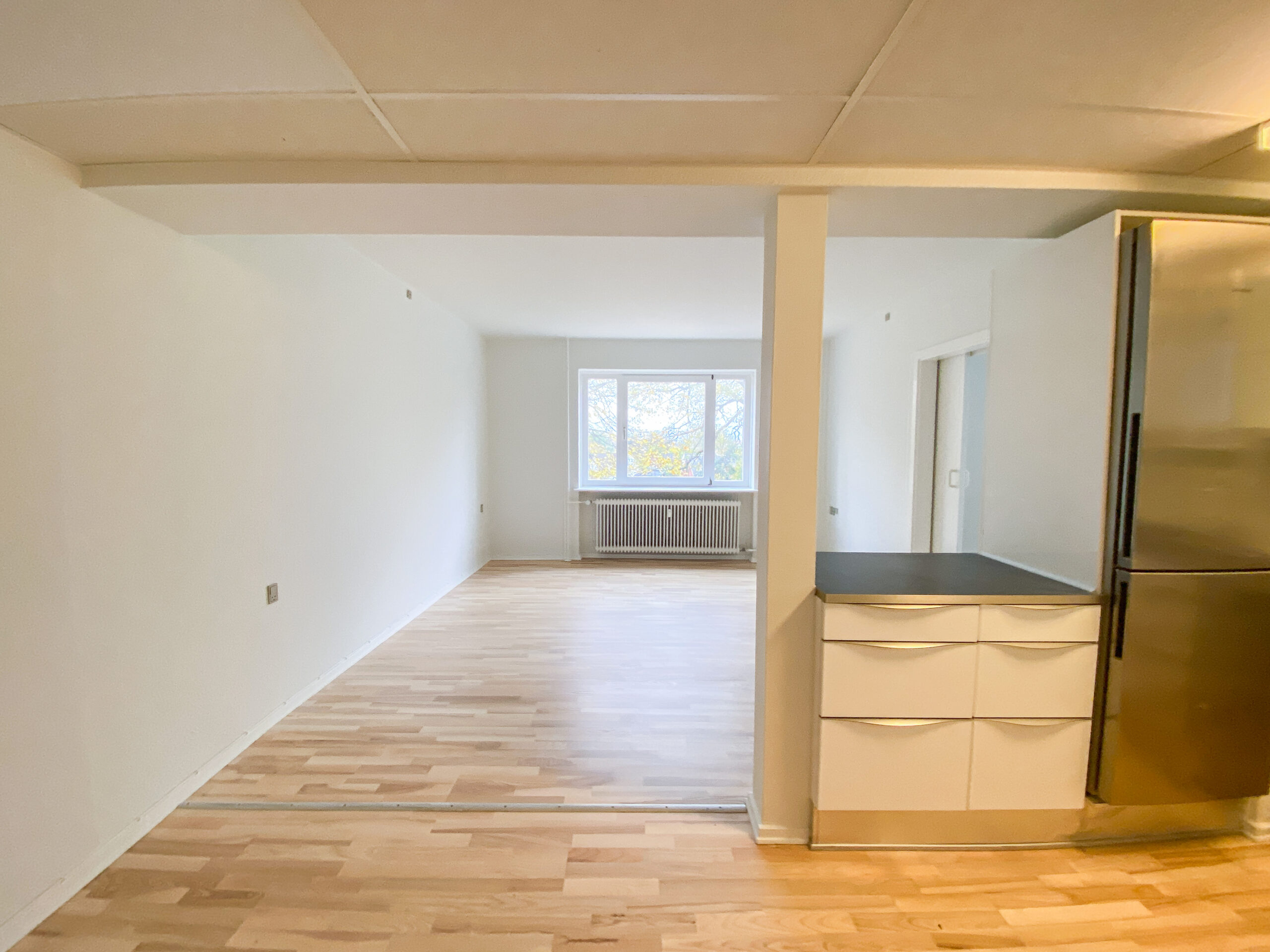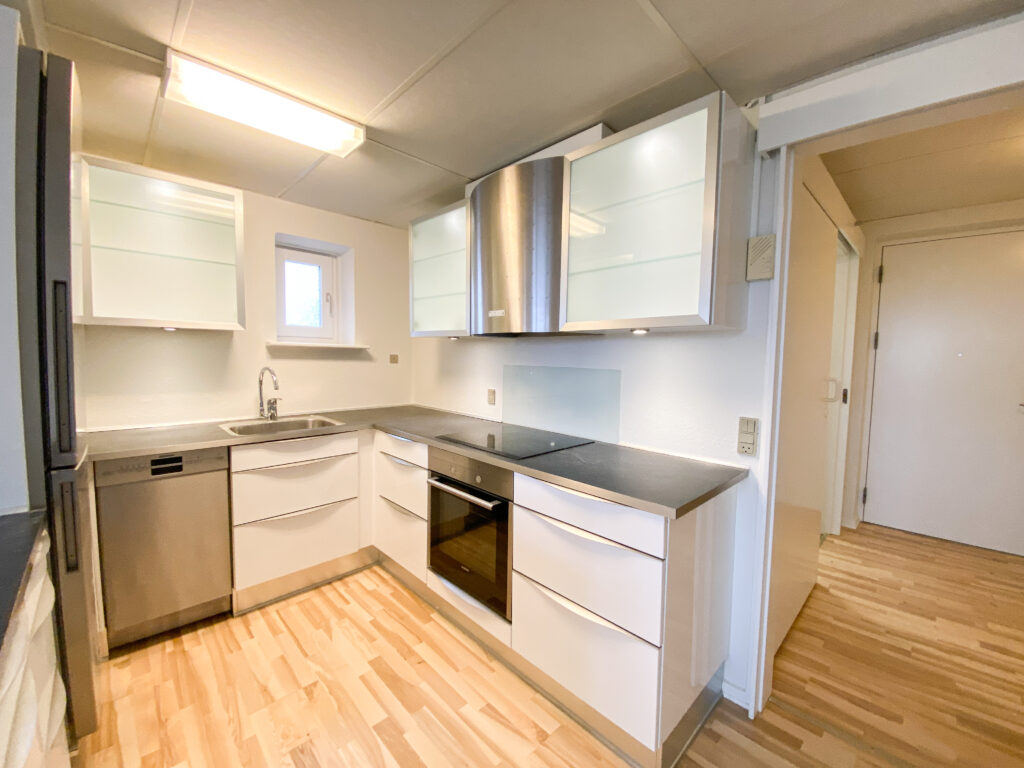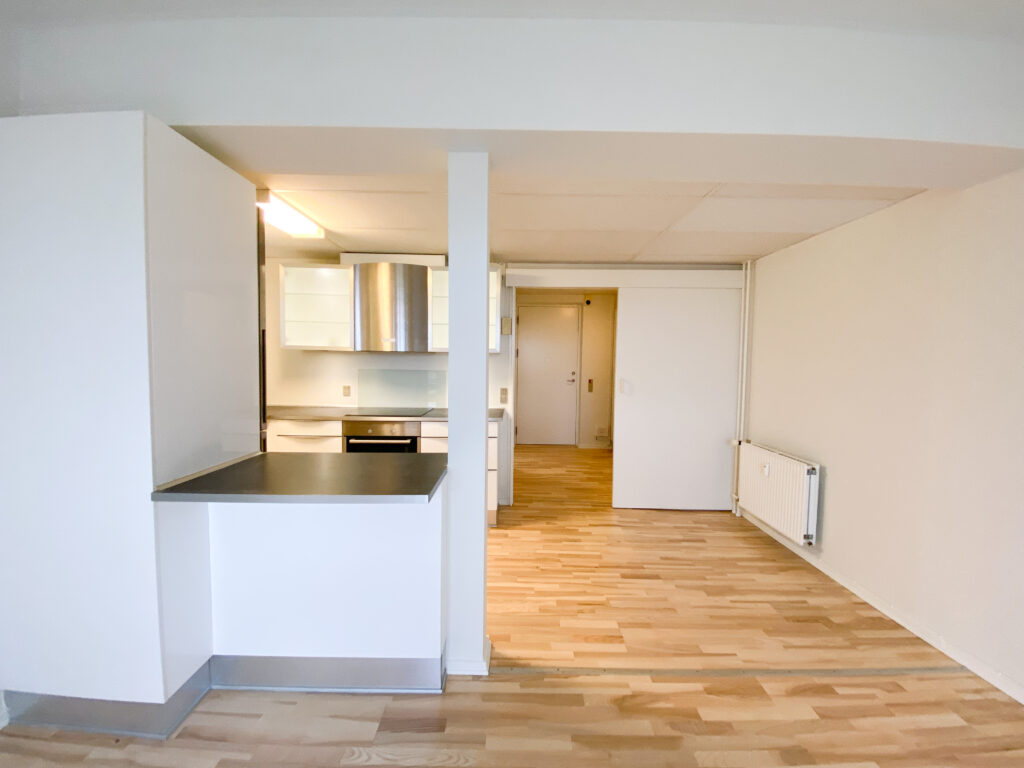 Lejligheden er bestående af et stort køkken-alrum, hvor køkkenet er skærmet af med en køkkenø, som bagpå fungerer som en bar, så man kan interagere og være en del af selskabet med sine gæster eller familie under madlavning.