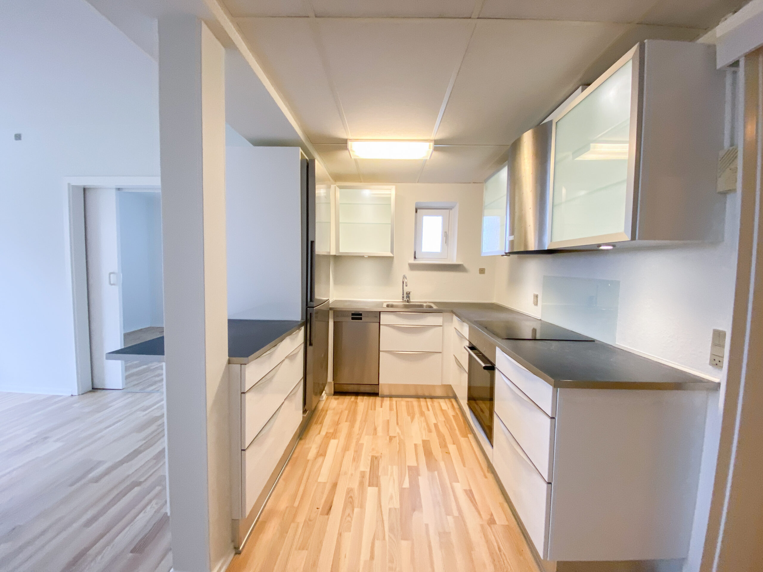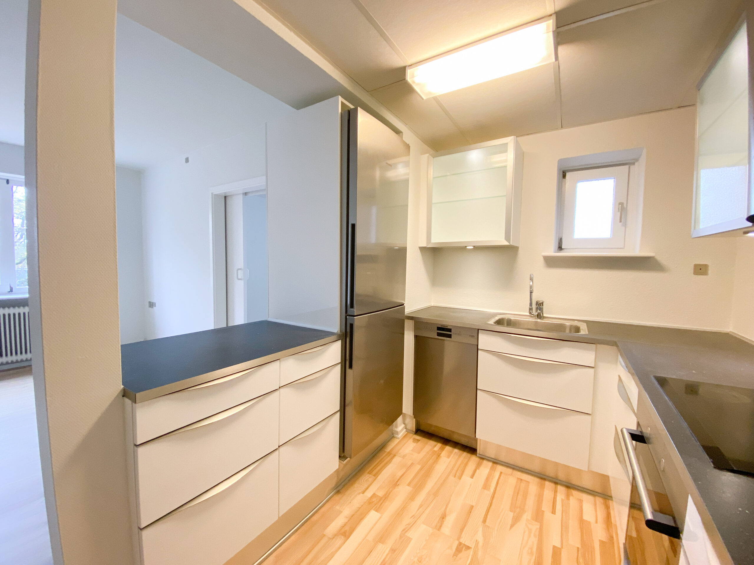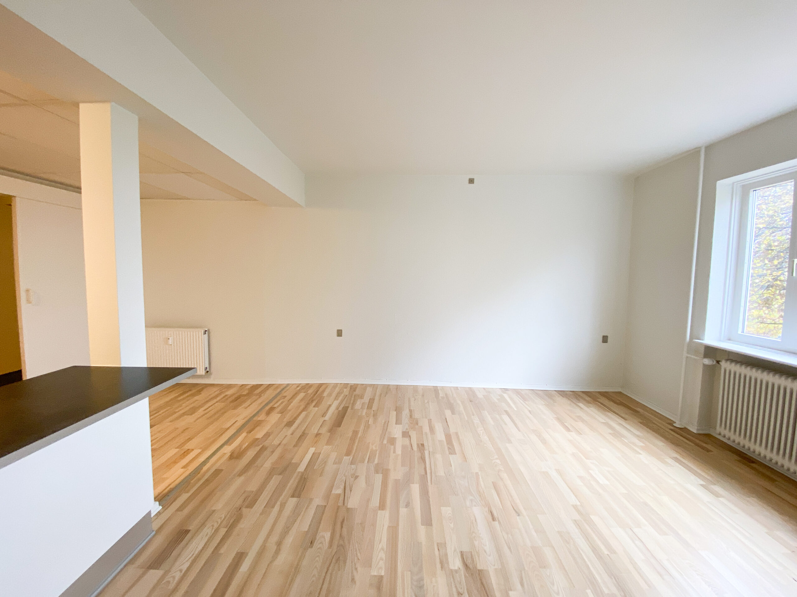 Lejligheden er bestående af et stort køkken-alrum, hvor køkkenet er skærmet af med en køkkenø, som bagpå fungerer som en bar, så man kan interagere og være en del af selskabet med sine gæster eller familie under madlavning.