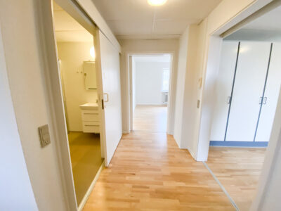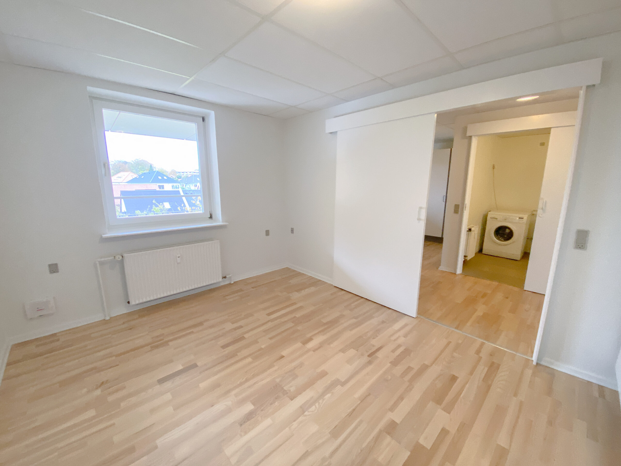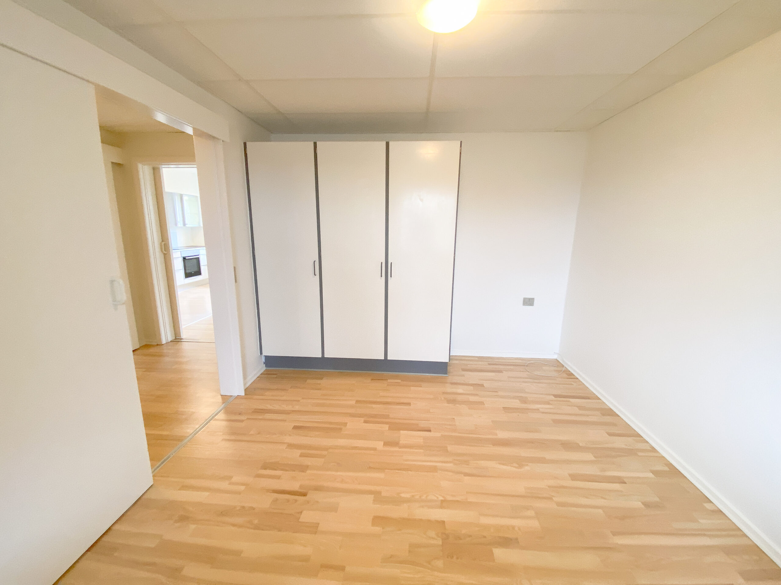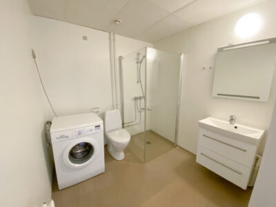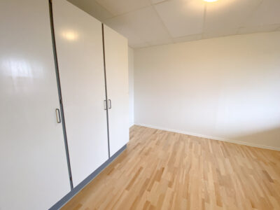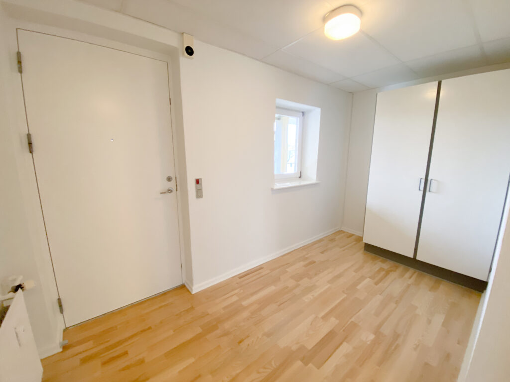 Derudover er der lejlighedens soveværelse, som har allerede har et klædeskab.Her er der plads til et skrivebord også udover en god stor seng. Lejligheden er udstyret med skydedøre, der gør det handicapvenligt samt seniorvenligt. Der er heller ingen dørtrin. Dette er der også ud til lejlighedens badeværelse. Her er der en vaskemaskine og en brusekabine med brusedøre, der kan sammenklappes, så det ikke fylder så meget. her er der også god gulvplads.