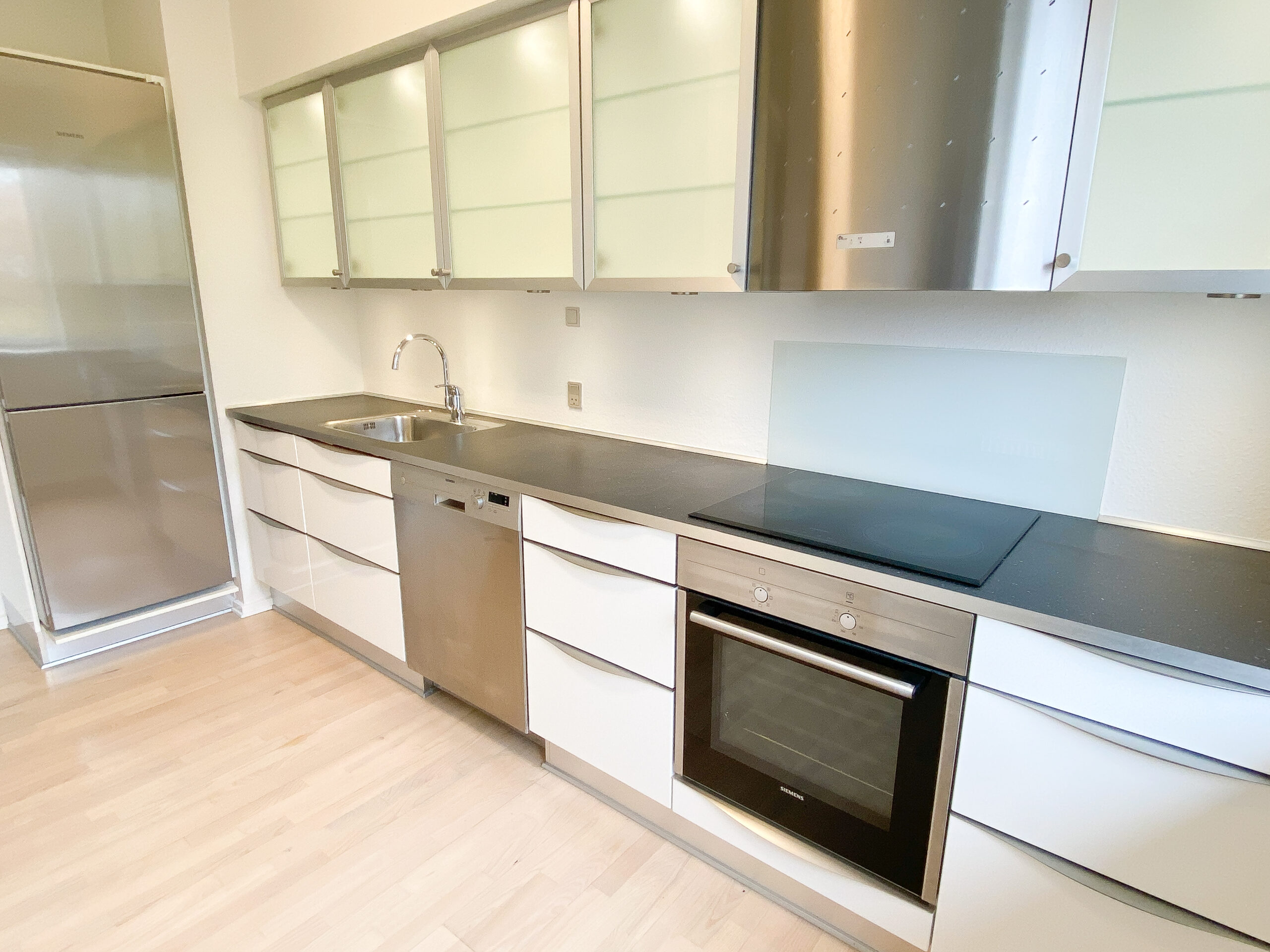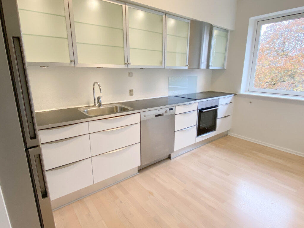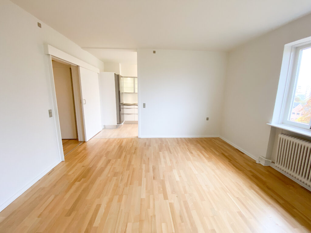 Lejligheden er bestående af et stort delvist køkken-alrum, hvor køkkenet er skærmet lidt af med en væg, der har en stor åbning i siden. Køkkenet er nyere og med opvaskemaskine. Stuen er rimelig stor og der er plads til både et stort sofaområde og spisebord m.m. Af vinduet kommer der masser af lys og der er en god udsigt.