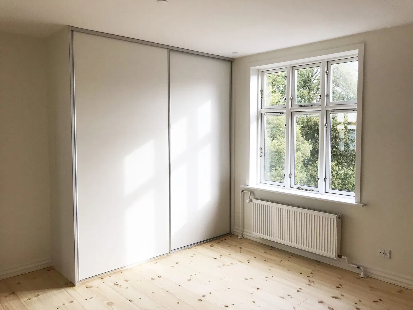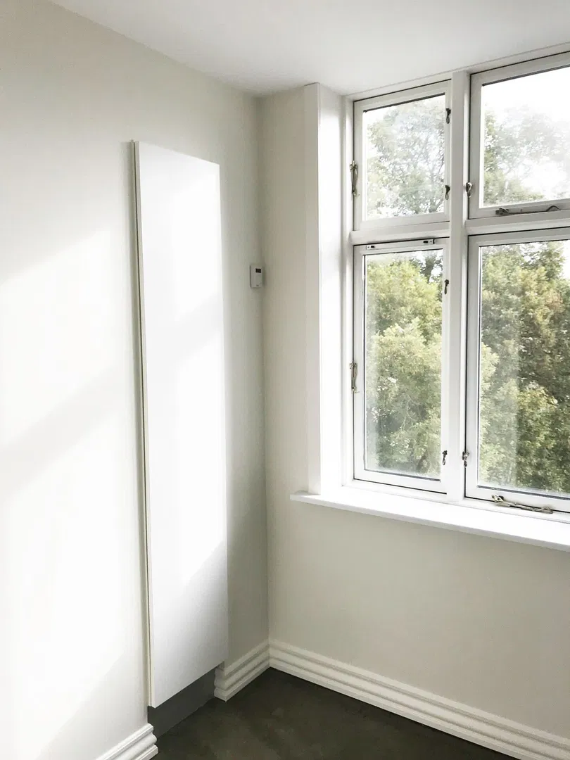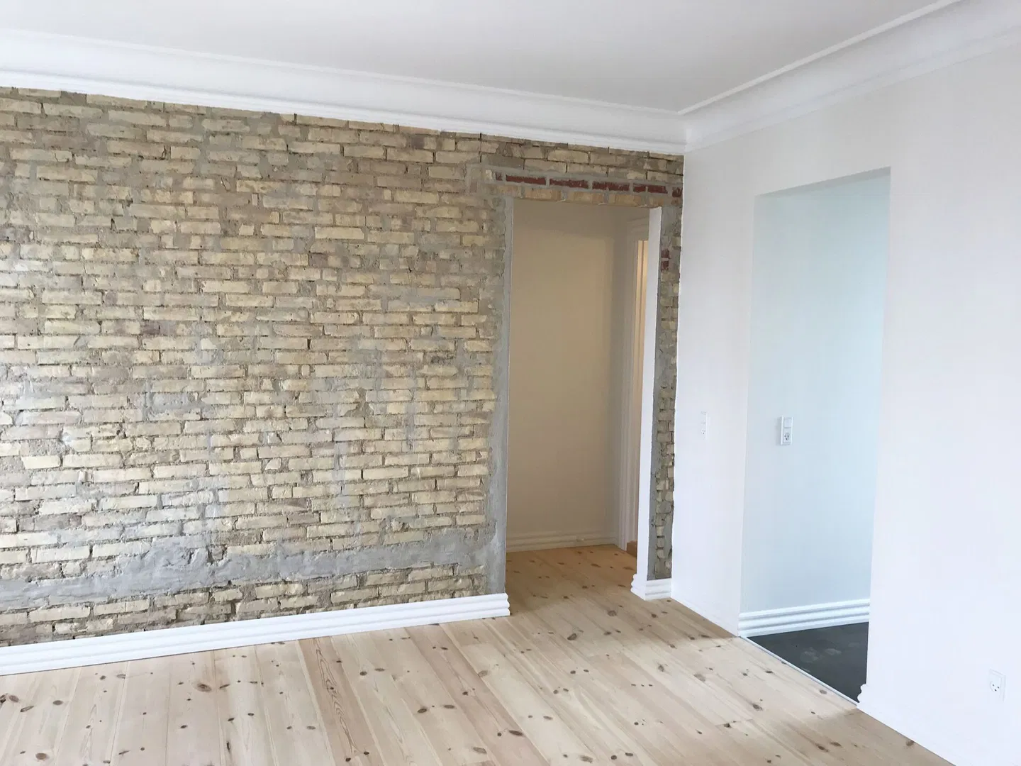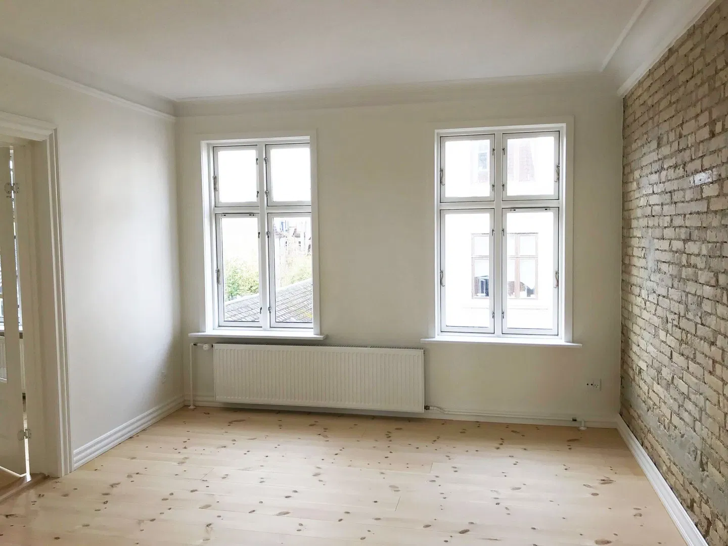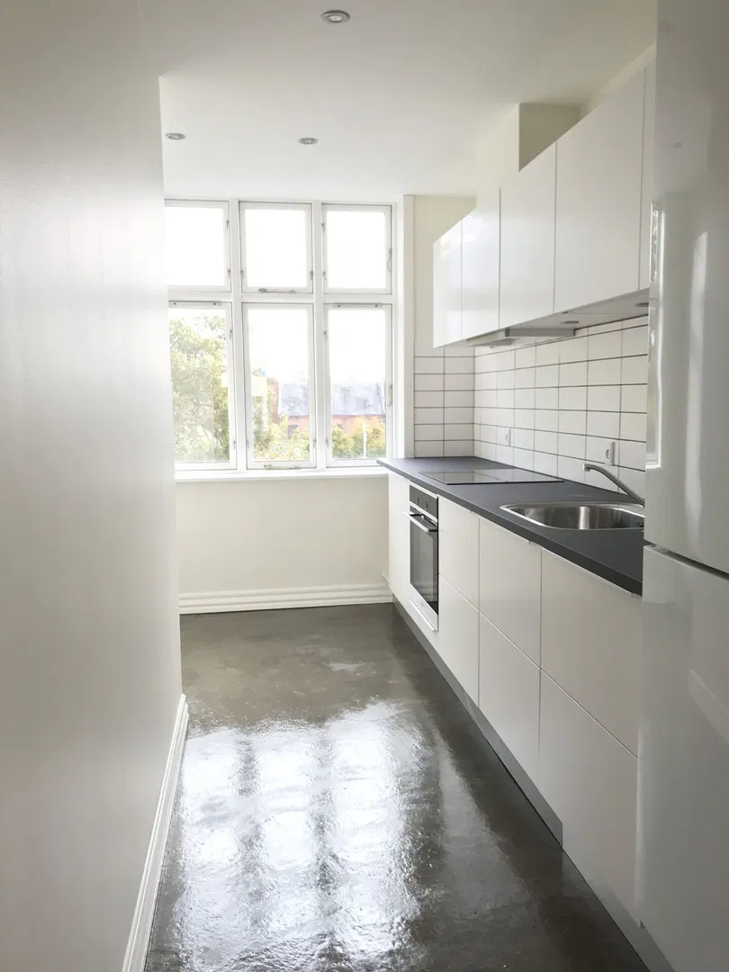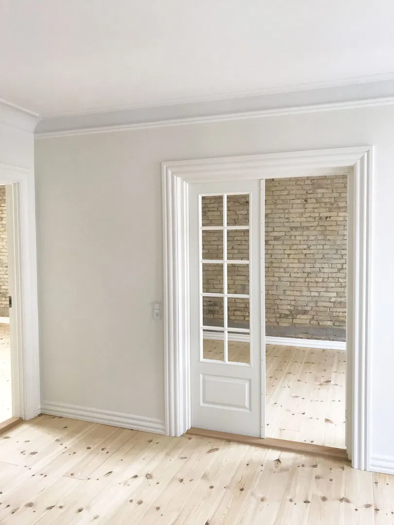Lejligheden byder på 74 m² nyrenoveret plads med lyse rum, fine listeprofiler og sprossede vinduer, der harmonerer smukt med de smukke plankegulve. I stuen og værelserne giver de lakbehandlede, blotlagte murstensvægge en rå og tidløs kontrast. Den velovervejede planløsning inkluderer en entré med trægulv, der åbner op til et lyst opholdsrum. Herfra er der adgang til to gode værelser, hvor det ene har et rummeligt indbygget skab med skydedøre. De store vinduer sikrer et behageligt lysindfald hele dagen, og de franske glasdøre mellem rummene tilføjer en klassisk elegance.