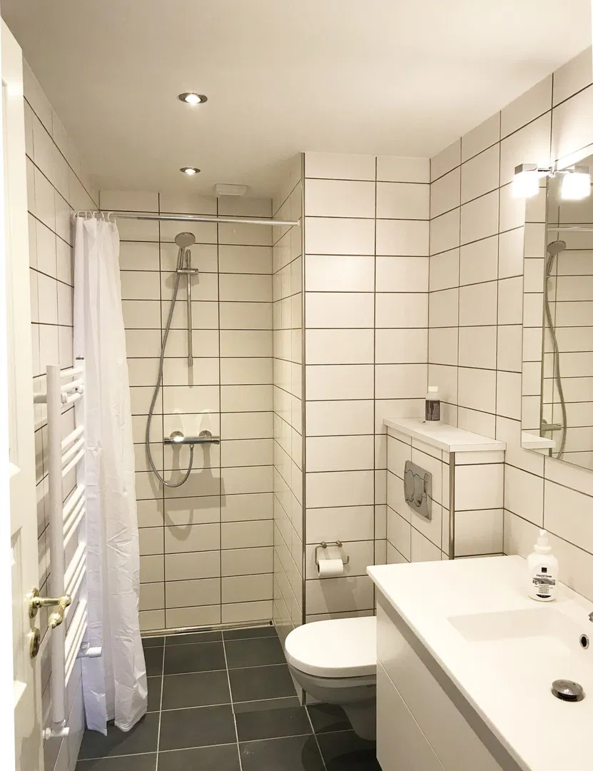 Køkkenet, designet af Svane, præsenterer sig i hvidt og stilrent med moderne faciliteter som køle-/fryseskab, glaskeramisk kogeplade, indbygningsovn og emhætte. Det funktionelle arbejdsområde er udstyret med hvide fliser, indbyggede spots i loftet samt et robust betongulv med gulvvarme, mens vinduespartiet ved køkkenet giver et lyst og venligt rum med udsigt til trækroner. Badeværelset er også moderniseret med store fliser, gulvvarme og et lækkert badmøbel fra Svane, hvilket skaber en ren og funktionel løsning til hverdagen.