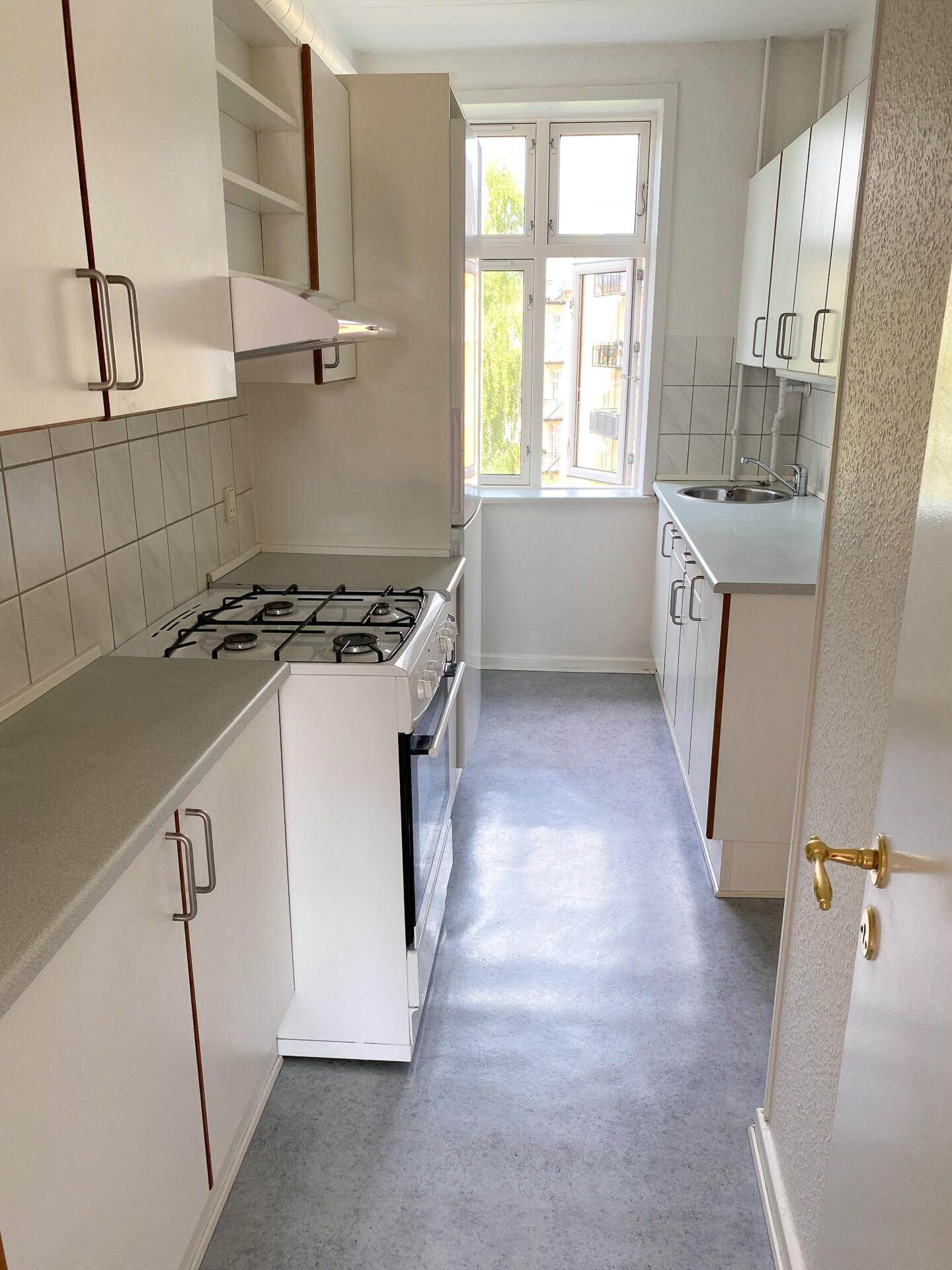 Denne hyggelige lejlighed tilbyder en funktionel og veludnyttet planløsning, der passer perfekt til dig, der søger en komfortabel bolig. Lejligheden er blandt andet udstyret med et køkken med hvide skabe med træforkanter, komfur, køle/fryseskab og emhætte, som giver en praktisk og stilren ramme for madlavningen.