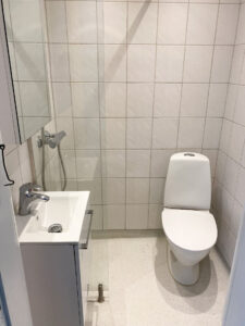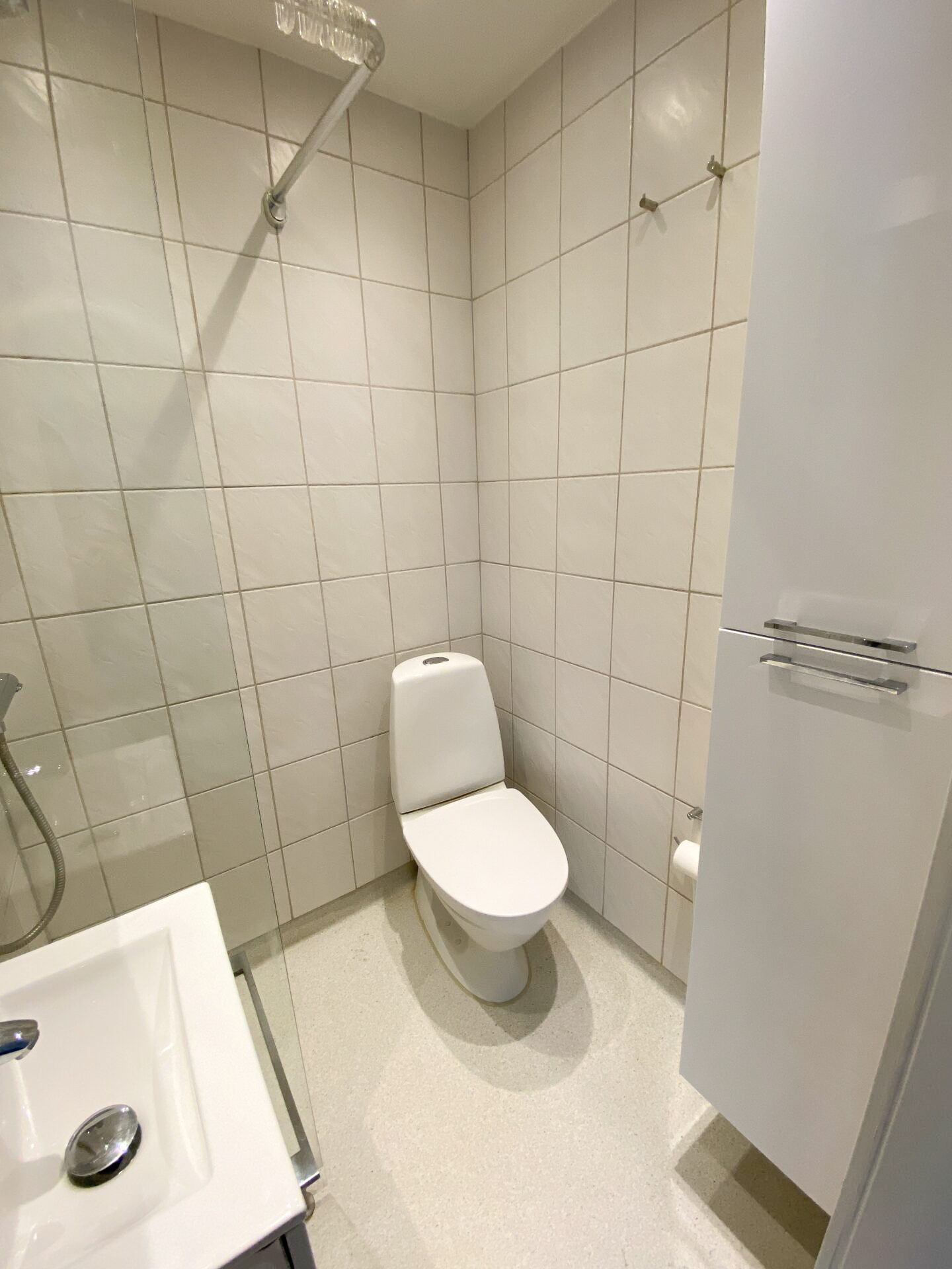 Badeværelset er funktionelt indrettet med vask med underskab, spejl, en glasvæg i brusenichen samt et højskab, der giver god opbevaringsplads.