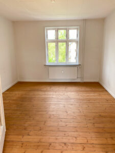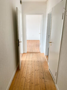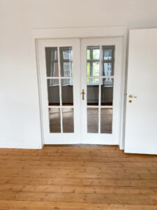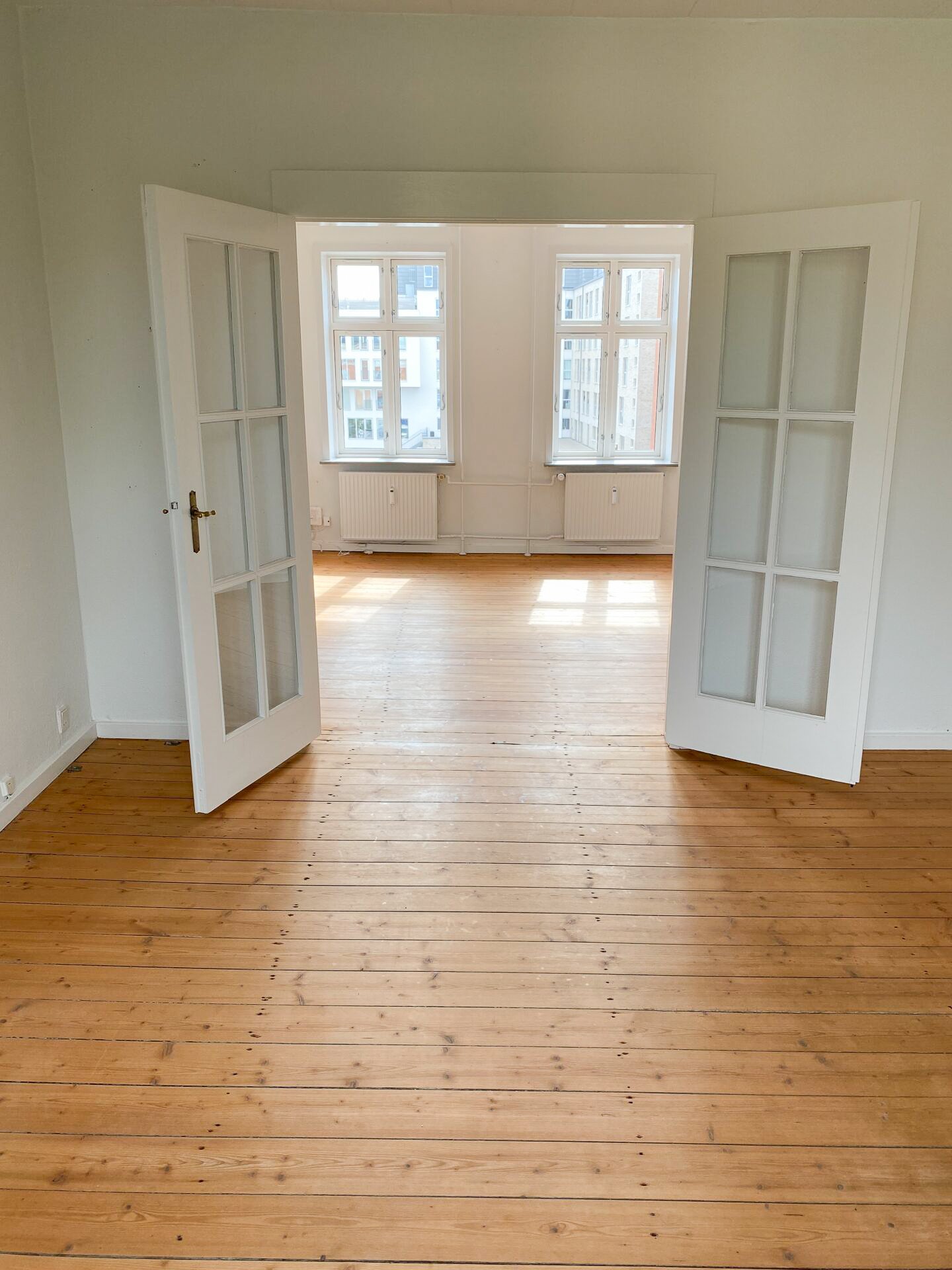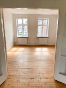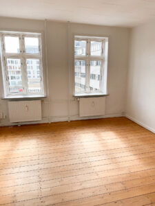 Lejligheden har afhøvlede og oliebehandlede trægulve, der skaber en varm og hyggelig atmosfære, mens linoleum i køkkenet er både praktisk og nemt at vedligeholde.