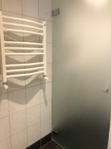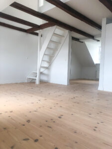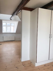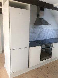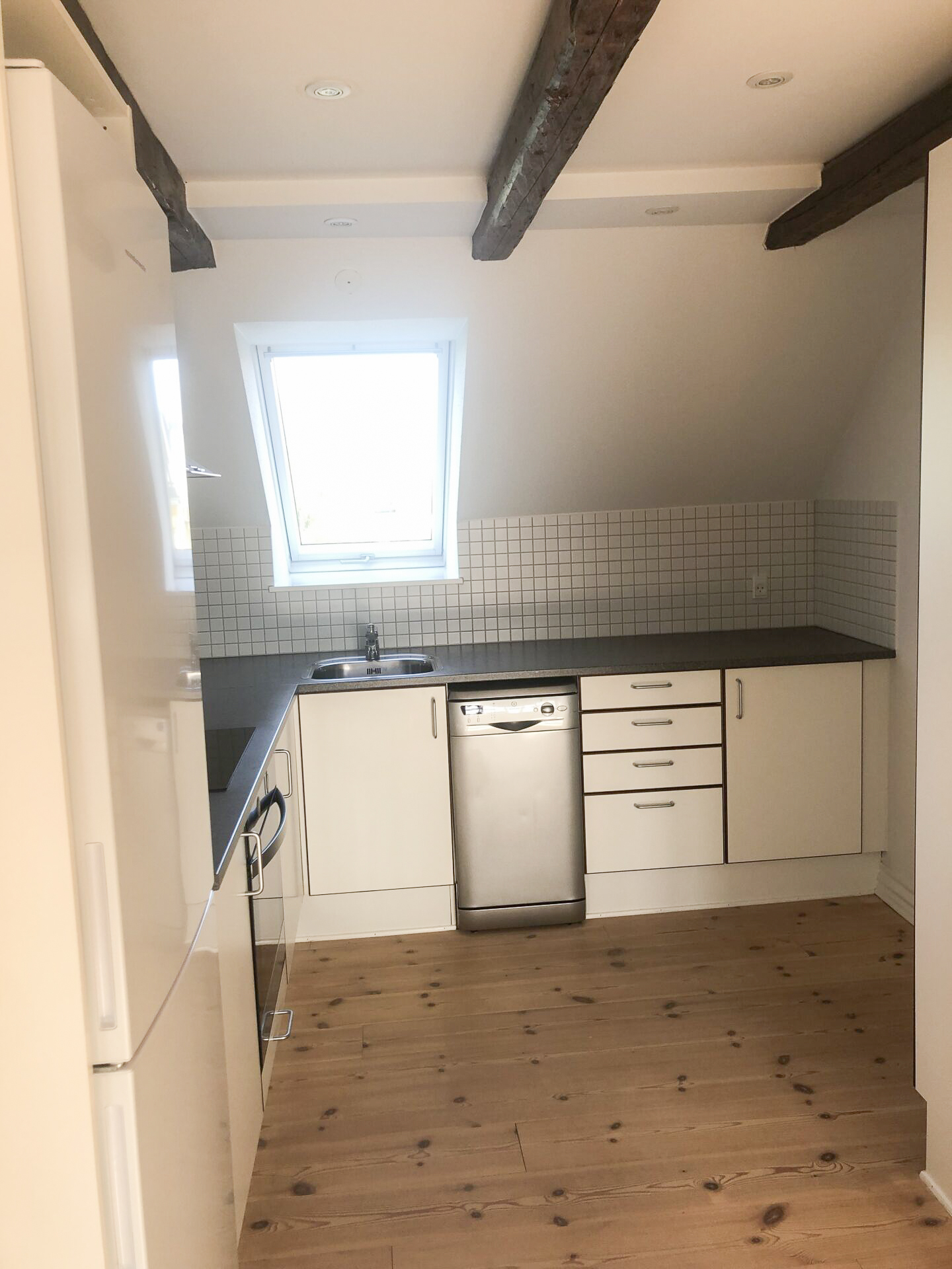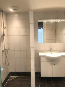 Lejligheden byder på et funktionelt køkken med hvide skabe med træforkanter og alle nødvendige hårde hvidevarer – herunder komfur, køle-/fryseskab, emhætte og opvaskemaskine. Badeværelset er praktisk indrettet med vask og underskab, spejl samt glasafskærmning ved brusenichen. Der er flotte, afhøvlede og oliebehandlede trægulve, som giver boligen et varmt og indbydende præg. Derudover er der porttelefon, adgang til fælles vaskeri i kælderen – og husdyrhold er ikke tilladt.