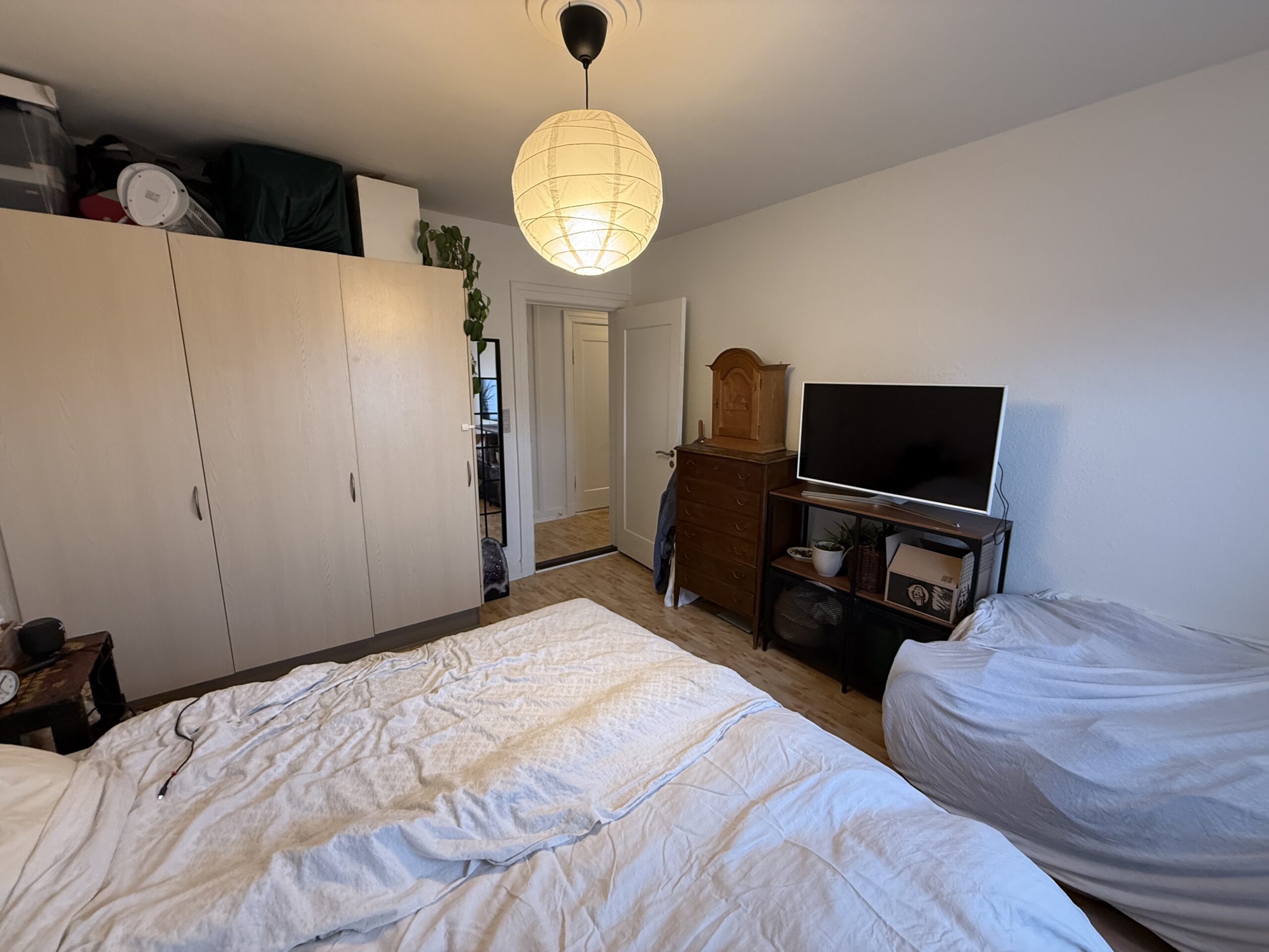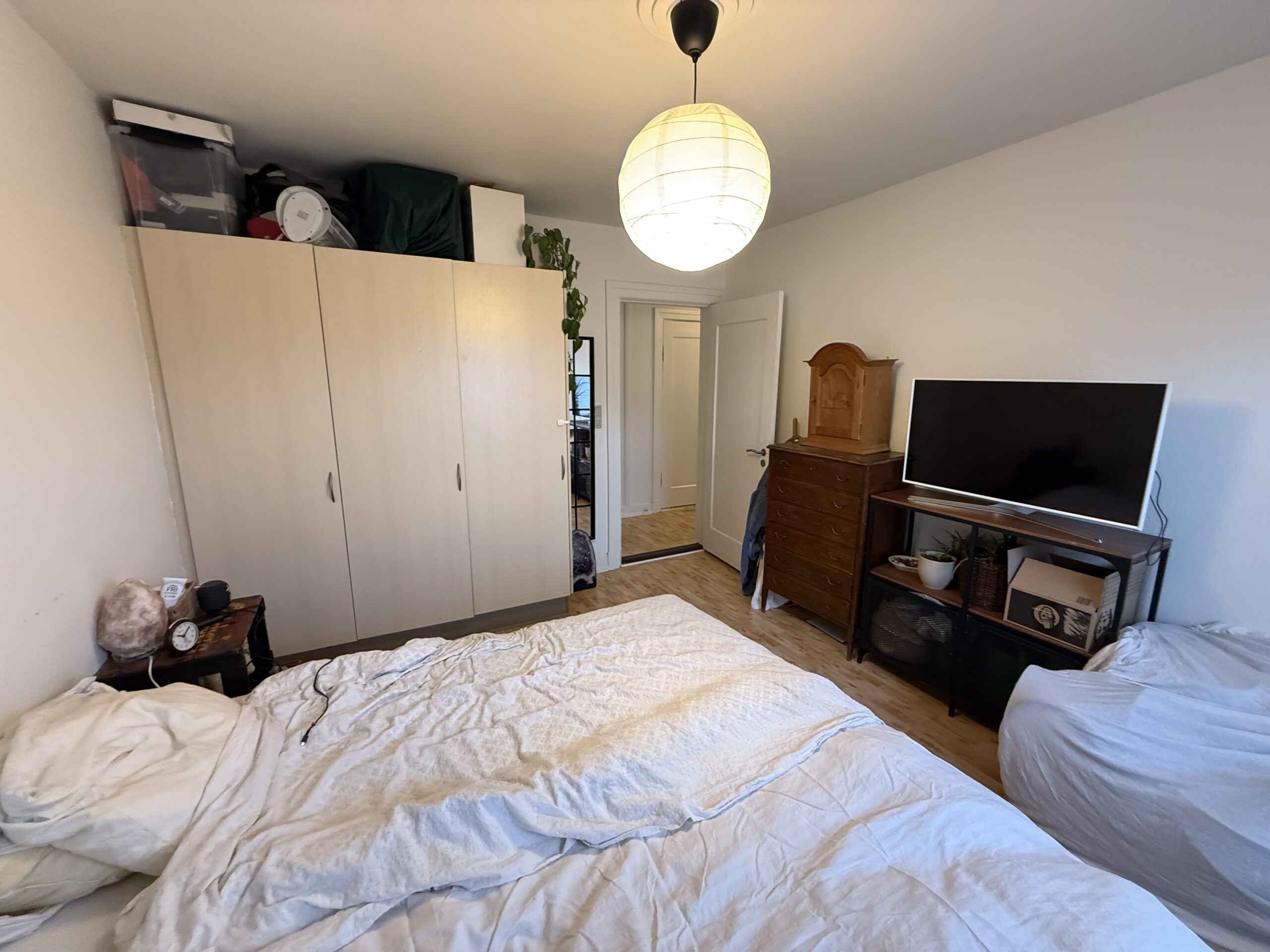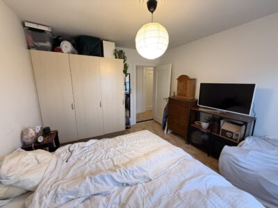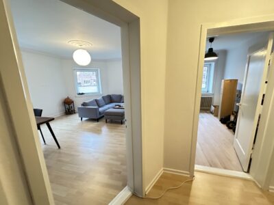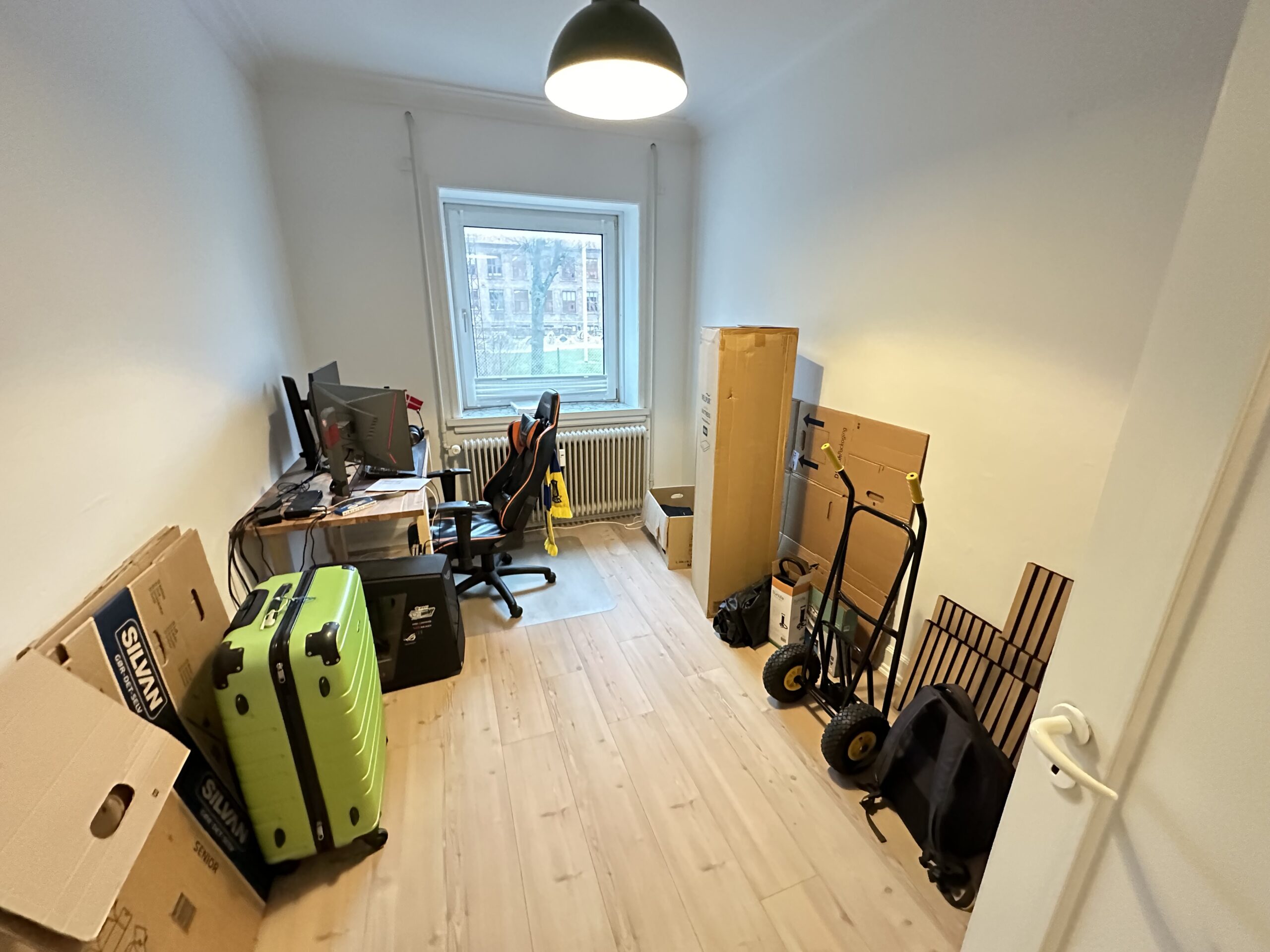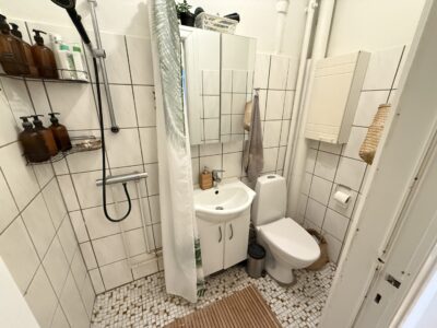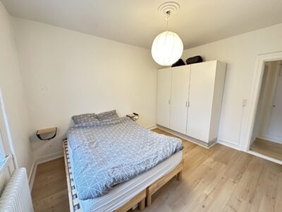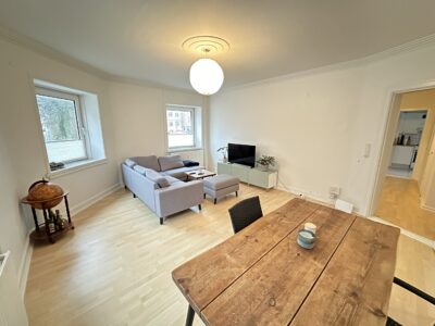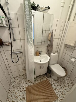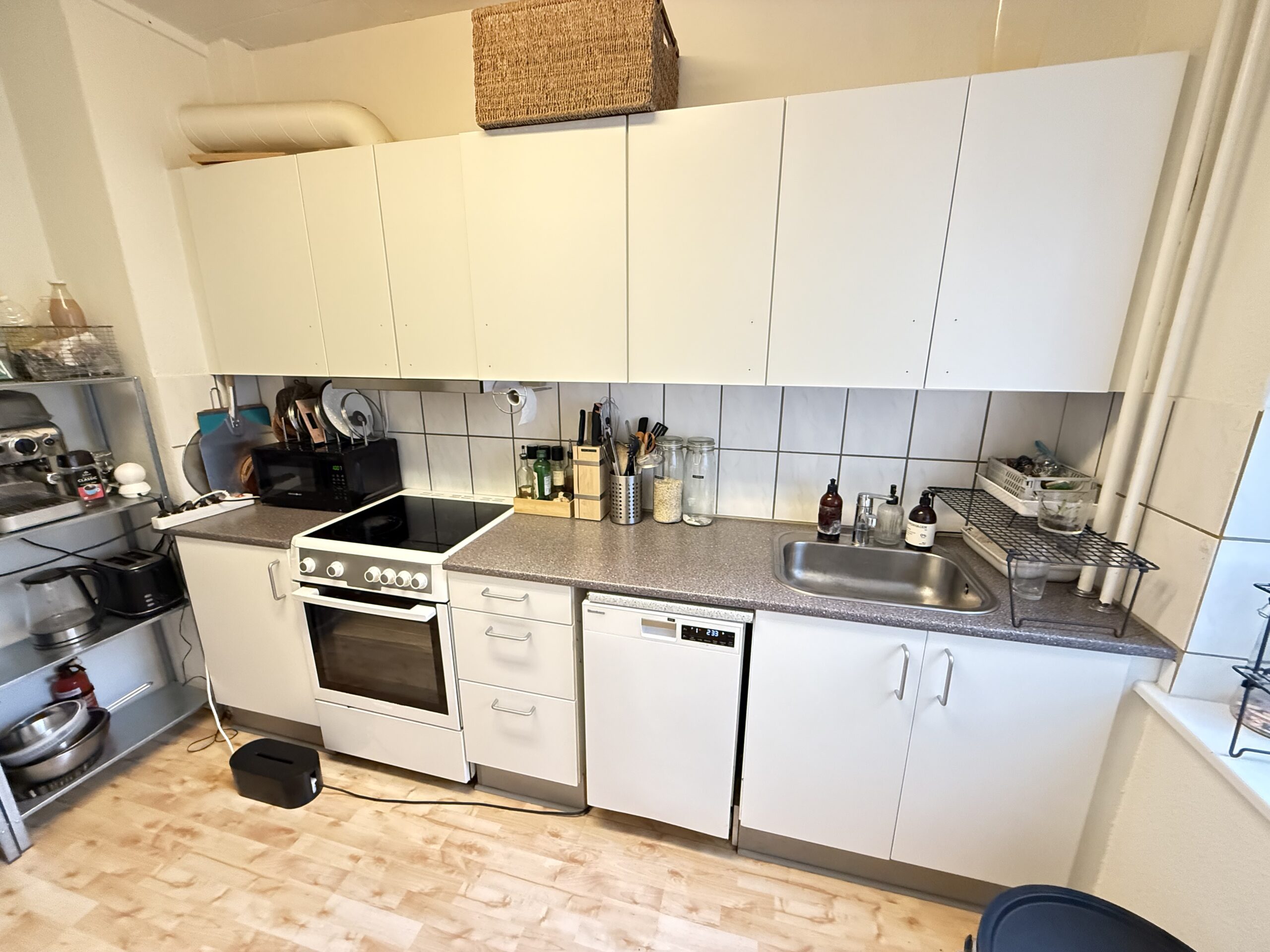 I den forreste del af lejligheden finder du det nyere, hvide køkken, der straks fanger øjet med sit stilfulde udseende. Her er der masser af skabsplads til dine køkkenredskaber og mulighed for at nyde måltider ved et lille bord. Opvaskemaskinen kan tilkøbes fra den nuværende lejer, mens køleskabet ikke er inkluderet.