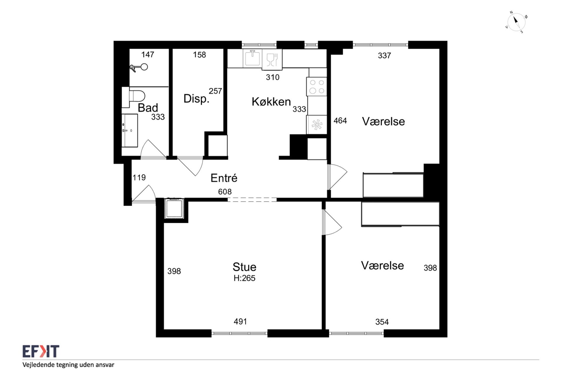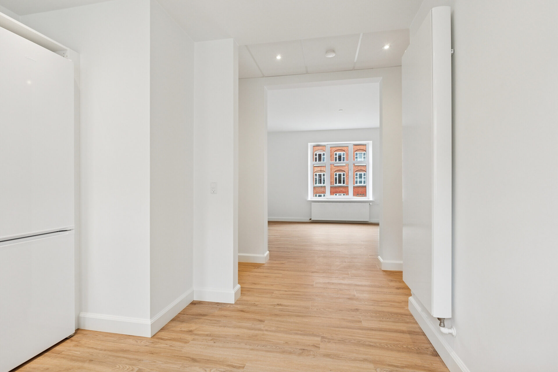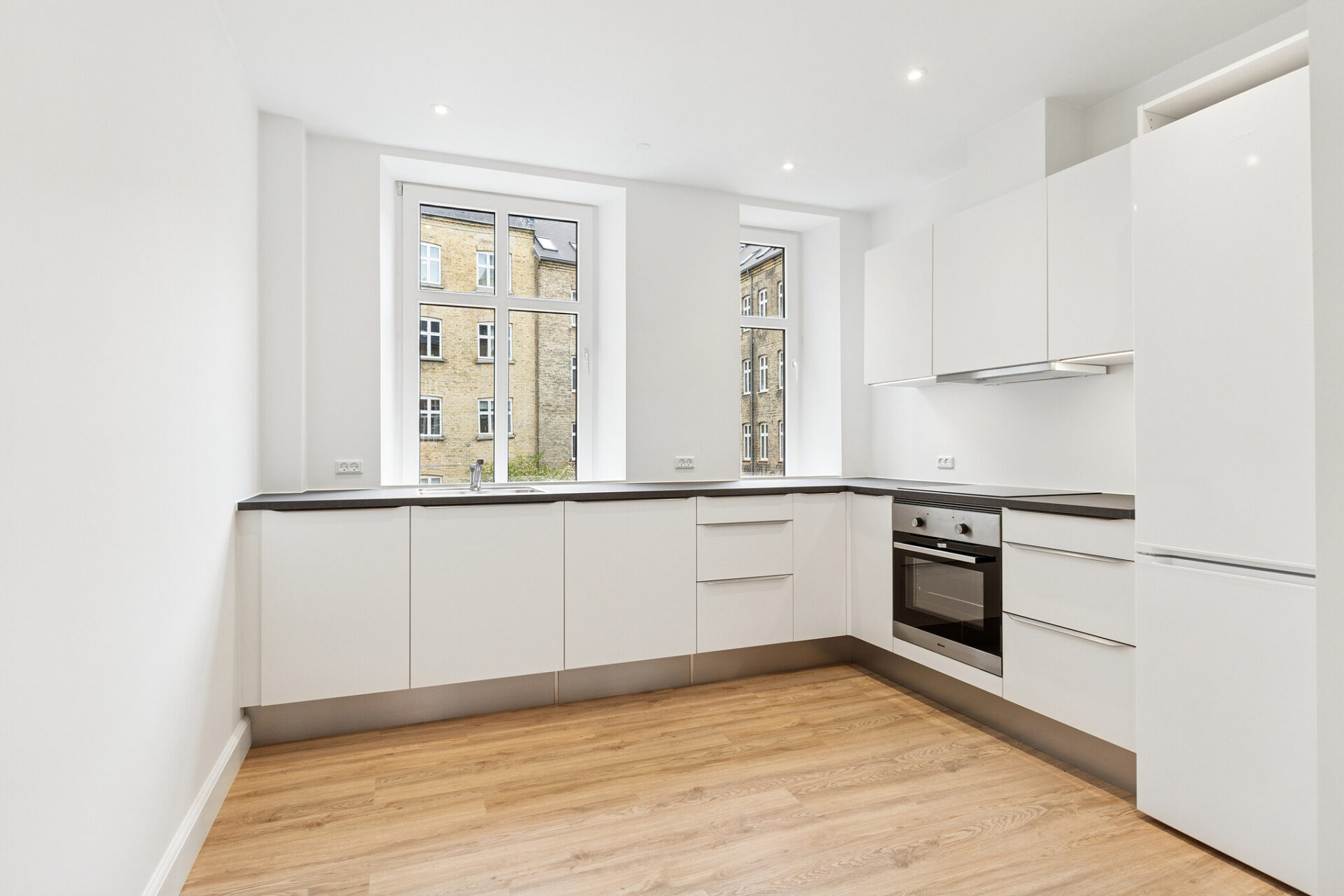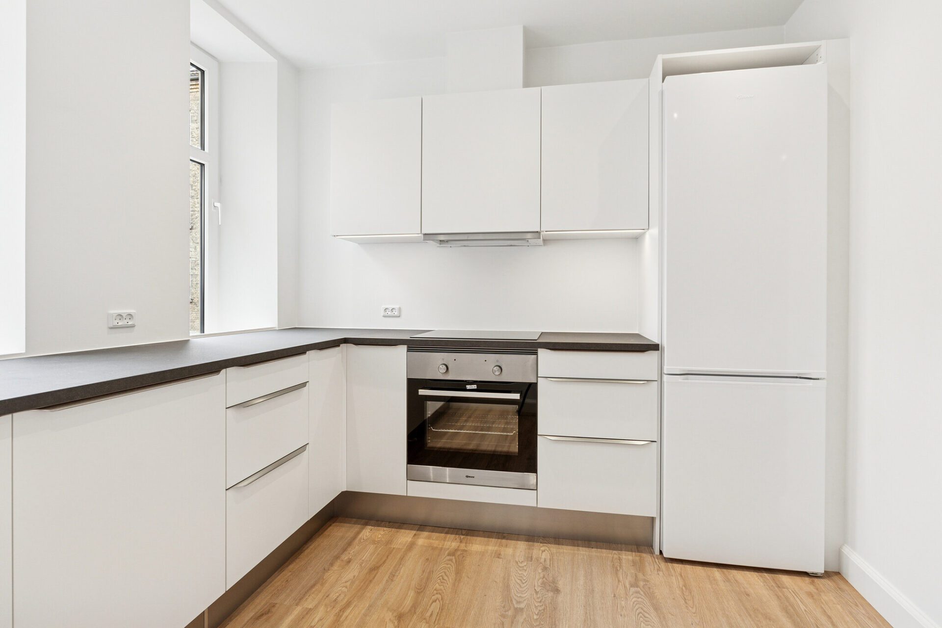 Lejligheden byder på et helt nyt og stilrent hvidt køkken, som er udstyret med alt i hårde hvidevarer: