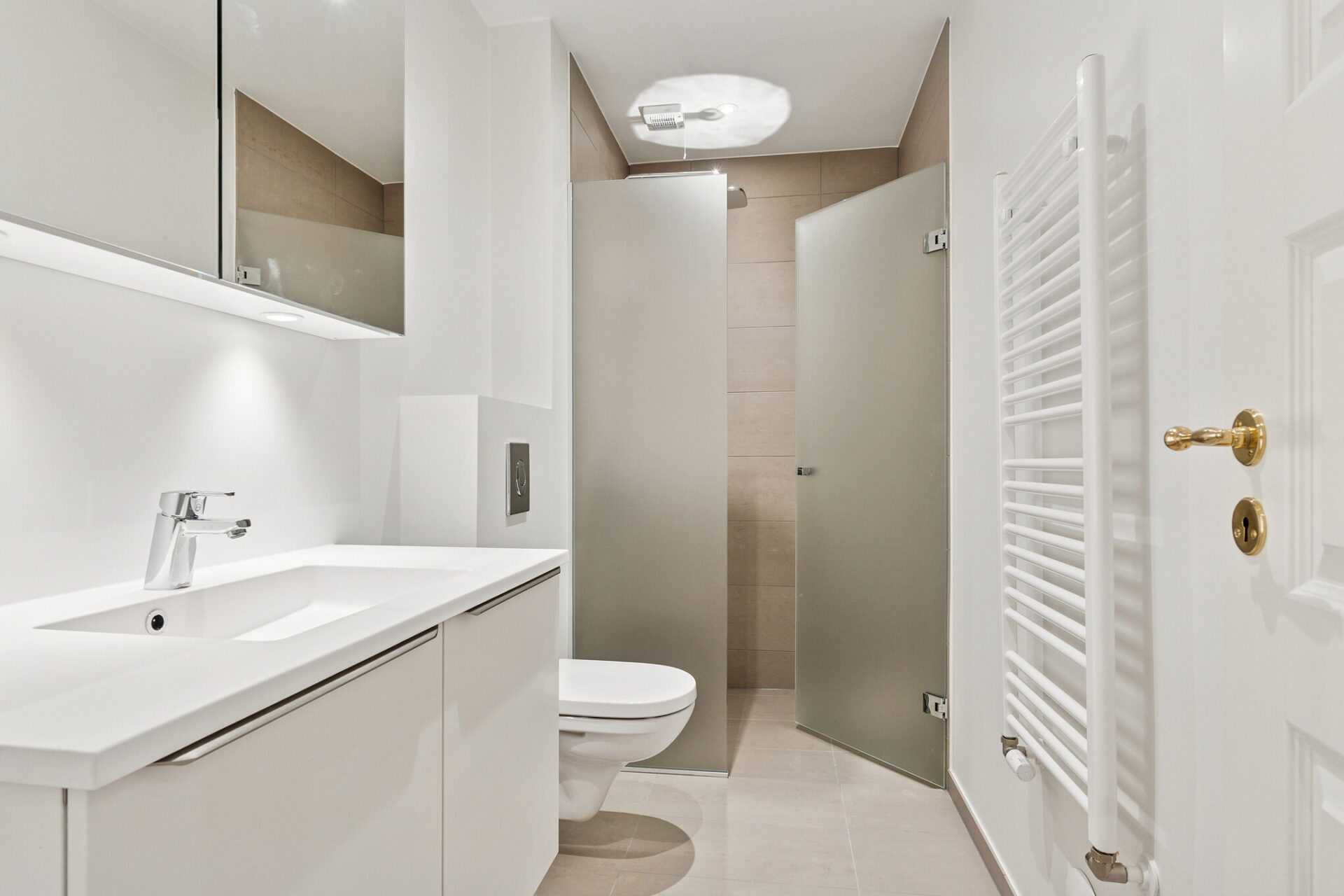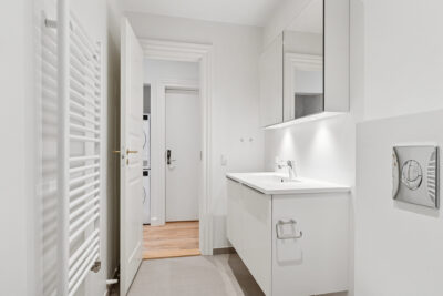 Badeværelset er ligeledes nyetableret og fremstår elegant og moderne med lyse fliser, behagelig gulvvarme, brusevægge i glas samt praktisk vaskearrangement med spejlskab og håndklædetørrer – alt sammen udført med sans for både komfort og æstetik.