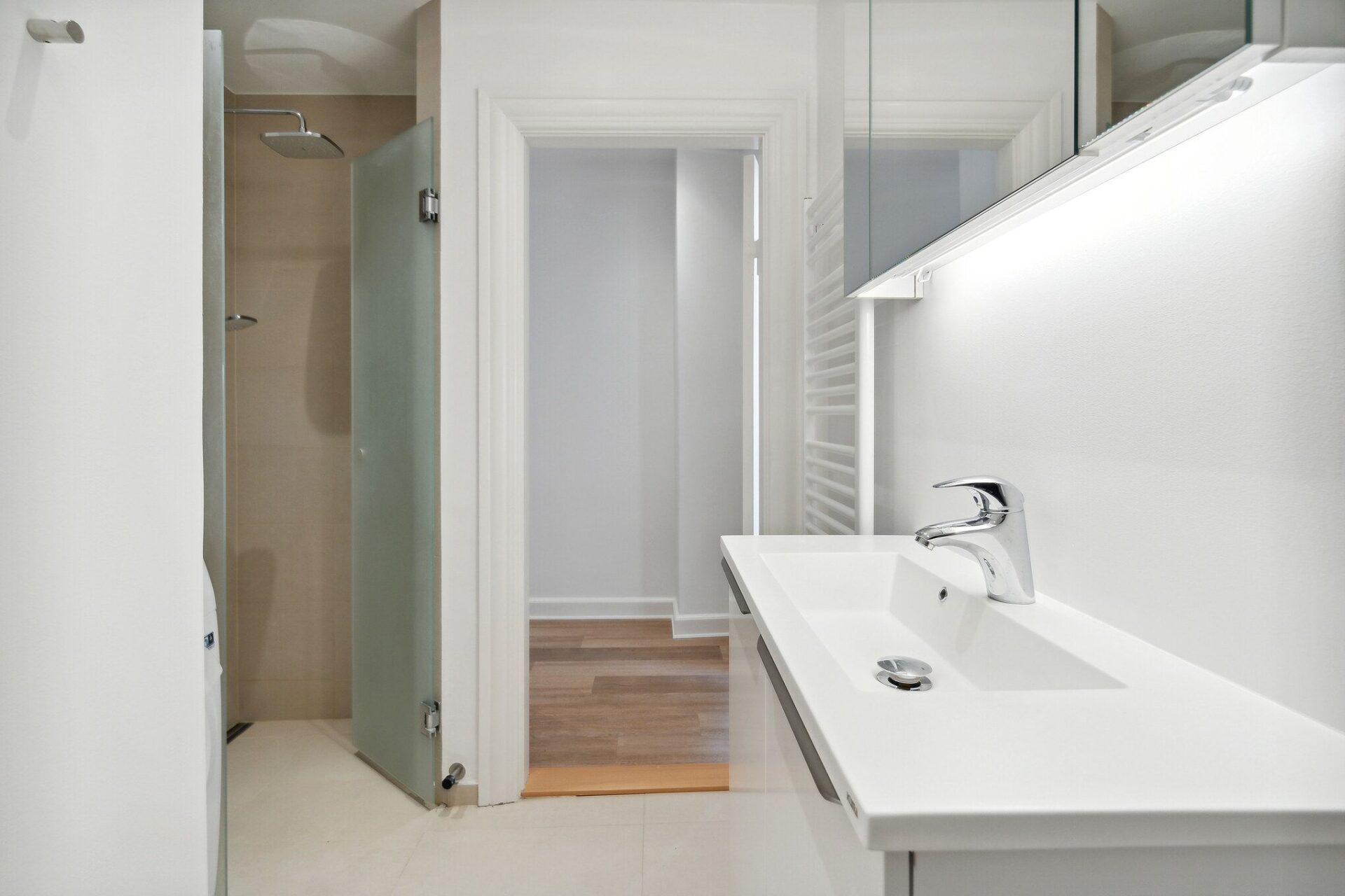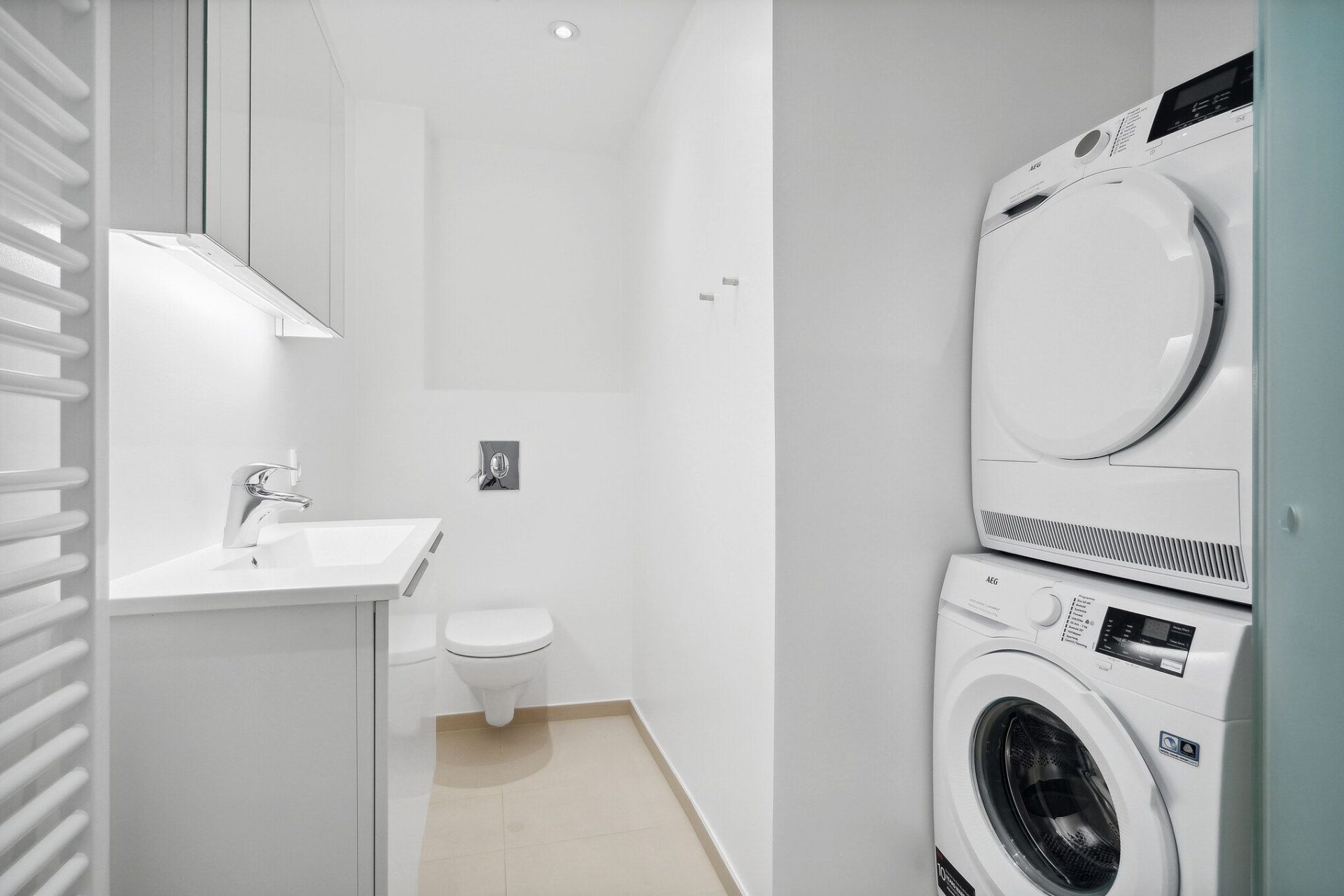 Badeværelset er ligeledes nyrenoveret og fremstår lækkert og funktionelt med gulvvarme, vaskeskab, spejlskab, håndklædetørrer samt både vaskemaskine og tørretumbler.