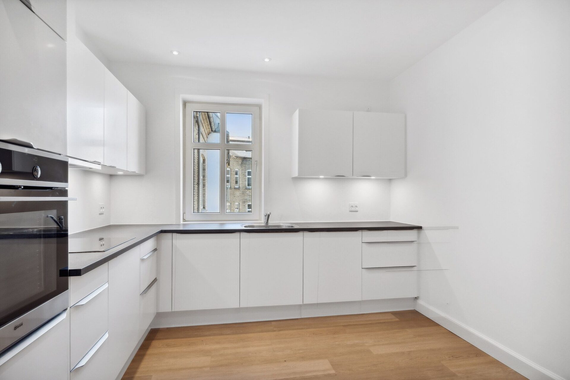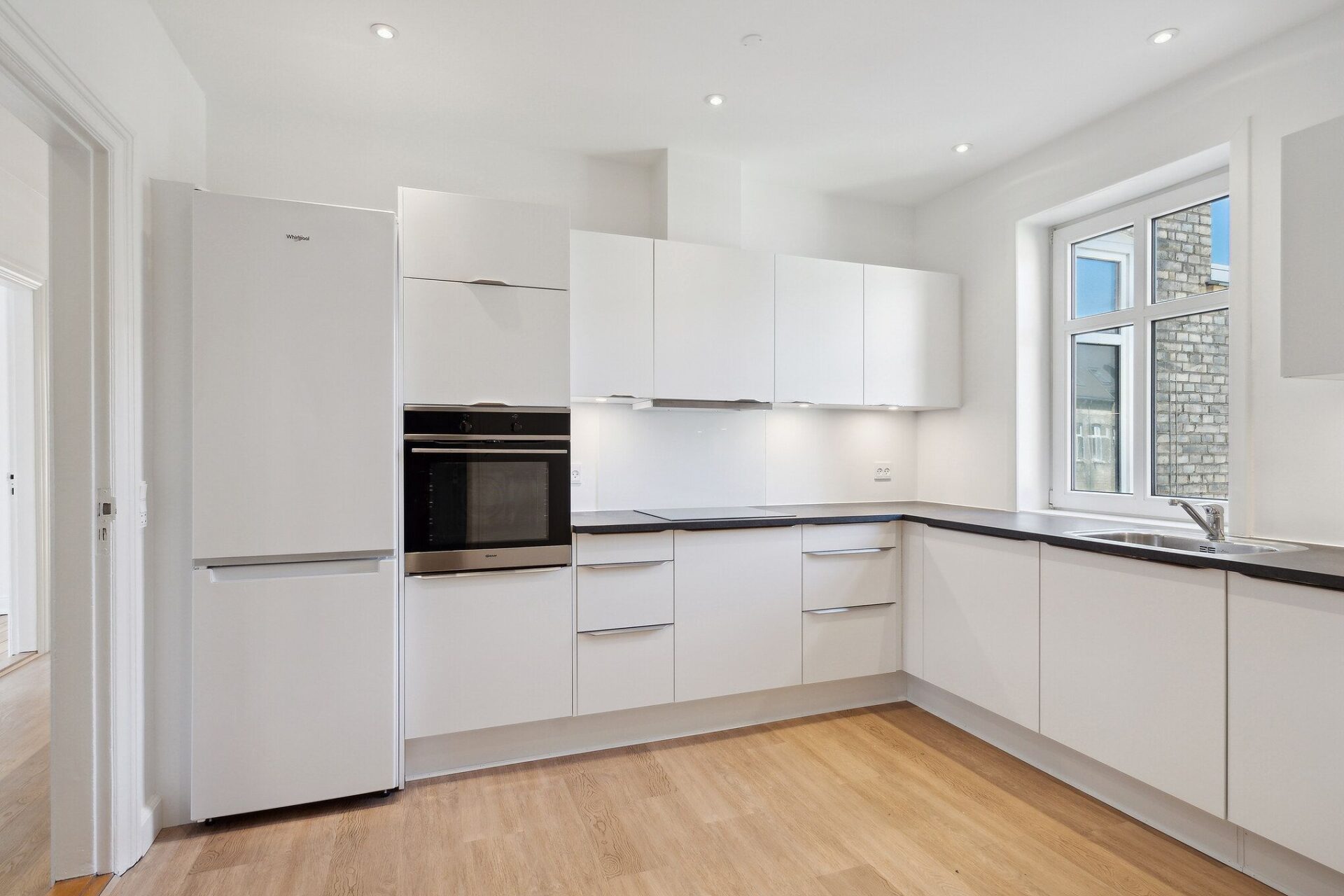 Det nye køkken er moderne og stilrent med god skabs- og bordplads og udstyret med alle nødvendige hårde hvidevarer: køle-/fryseskab, opvaskemaskine, ovn, induktionskogeplader og emhætte.
