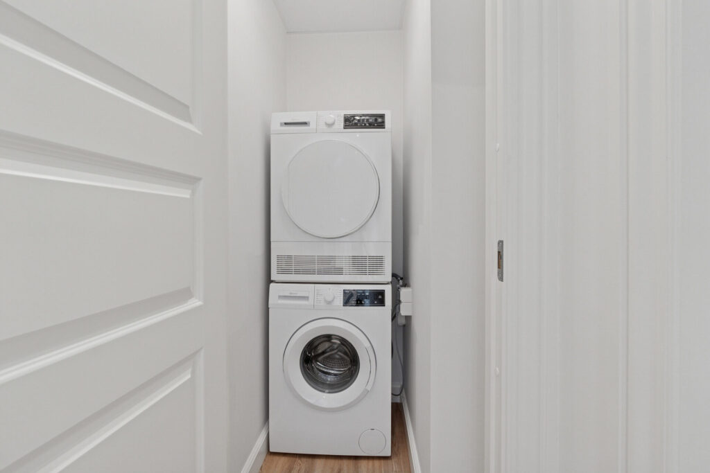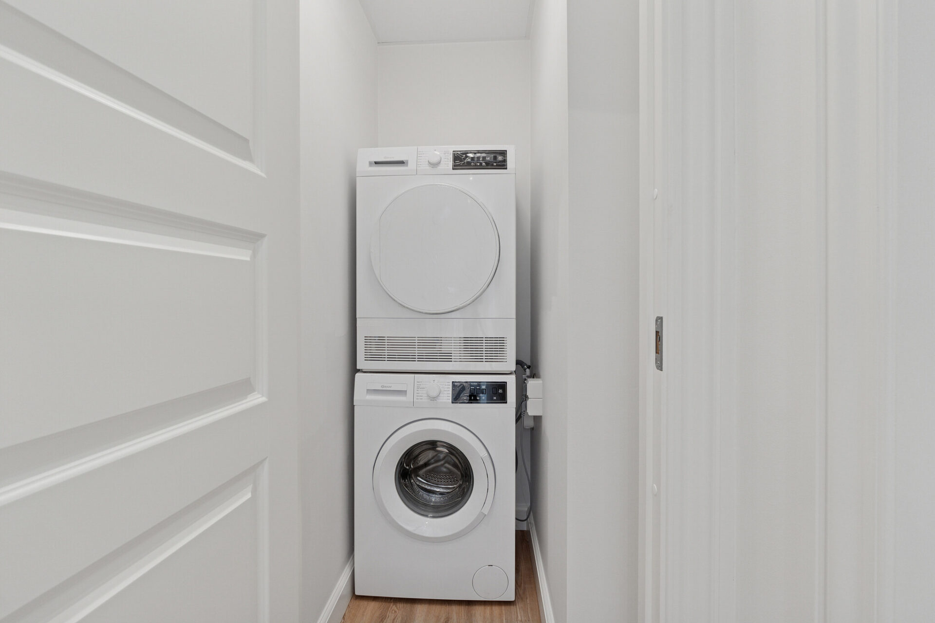 Fra entréen er der adgang til et praktisk lille depotrum, hvor både vaskemaskine og tørretumbler er installeret – en diskret og smart løsning, der gør det nemt at klare vasketøjet i hjemmet.