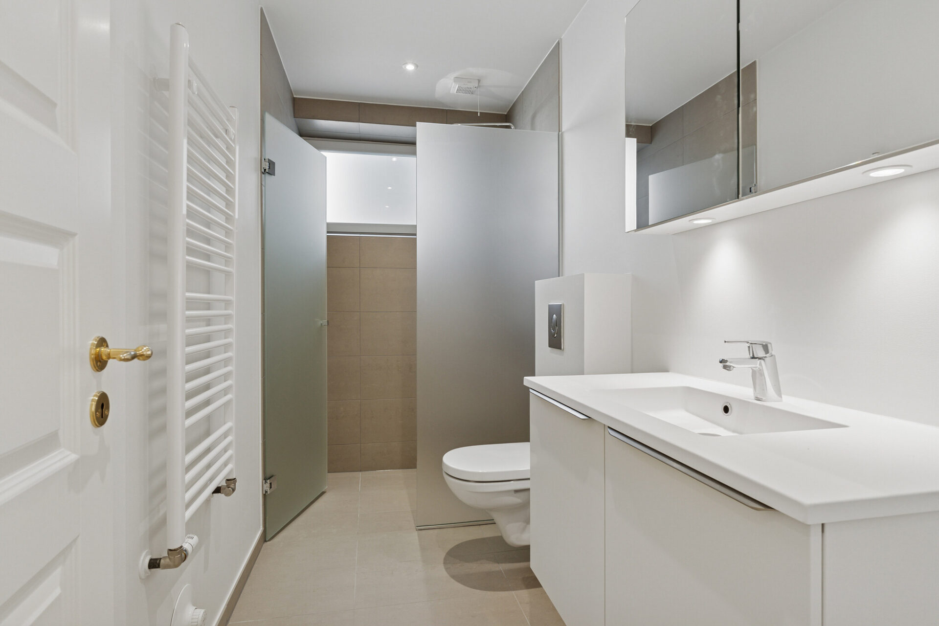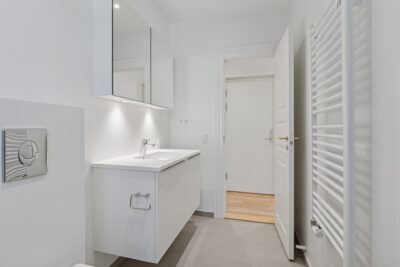 Det nye badeværelse er udført med lyse fliser og har behagelig gulvvarme. Her får du et moderne og funktionelt rum med vaskearrangement, spejlskab, håndklædetørrer og elegante brusevægge i glas.
