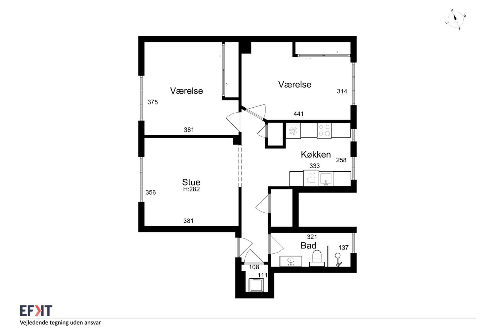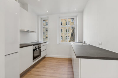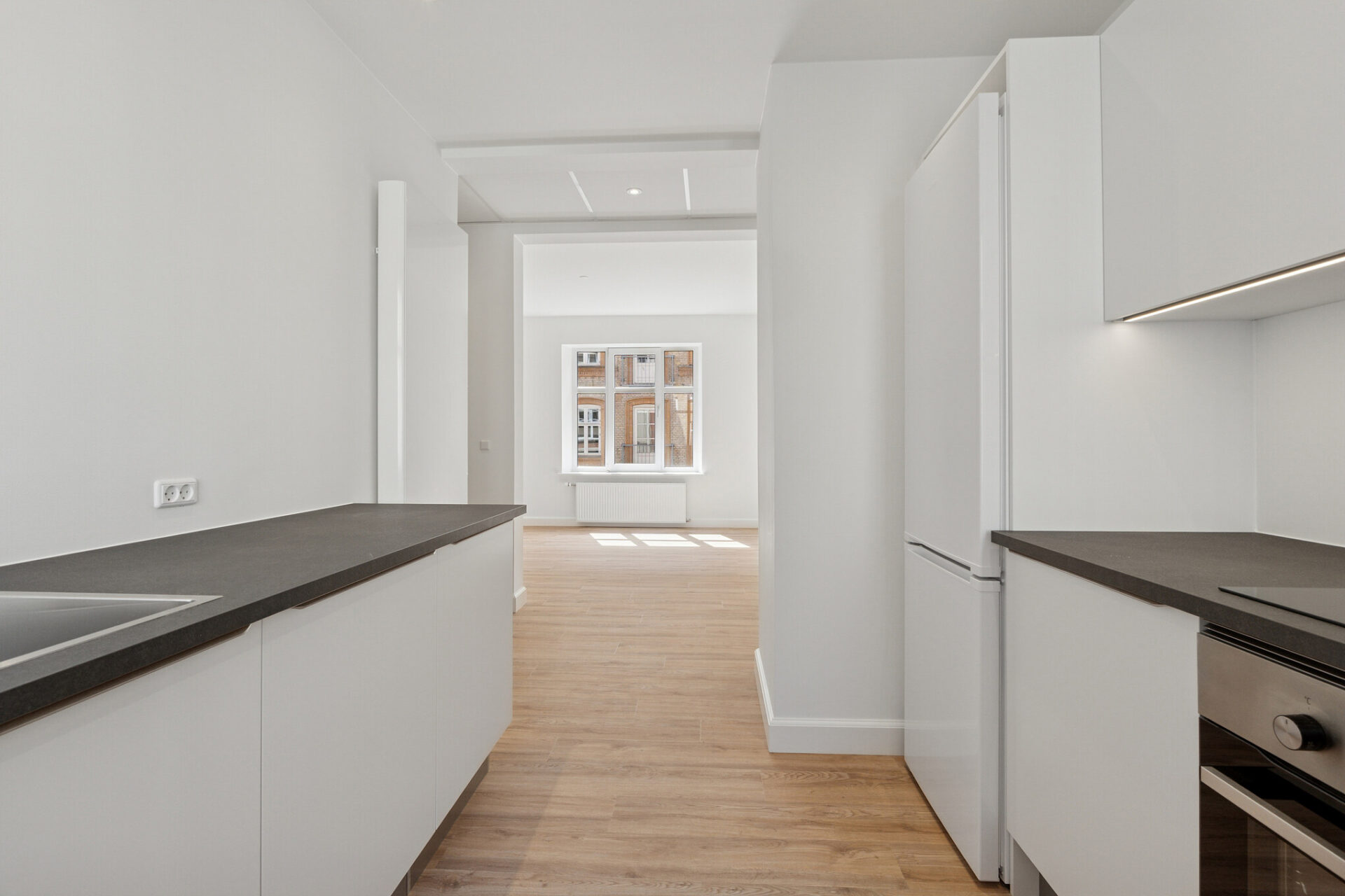 Lejligheden byder på et helt nyt, hvidt køkken i tidløst design, udstyret med alt i hårde hvidevarer: