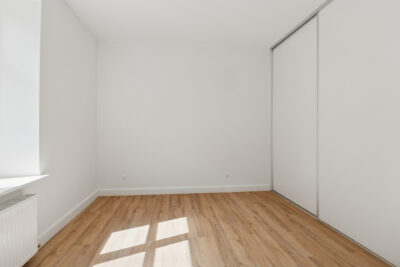 I begge værelser finder du rummelige garderobeskabe med skydelåger, som sikrer god opbevaringsplads og et ryddeligt udtryk.