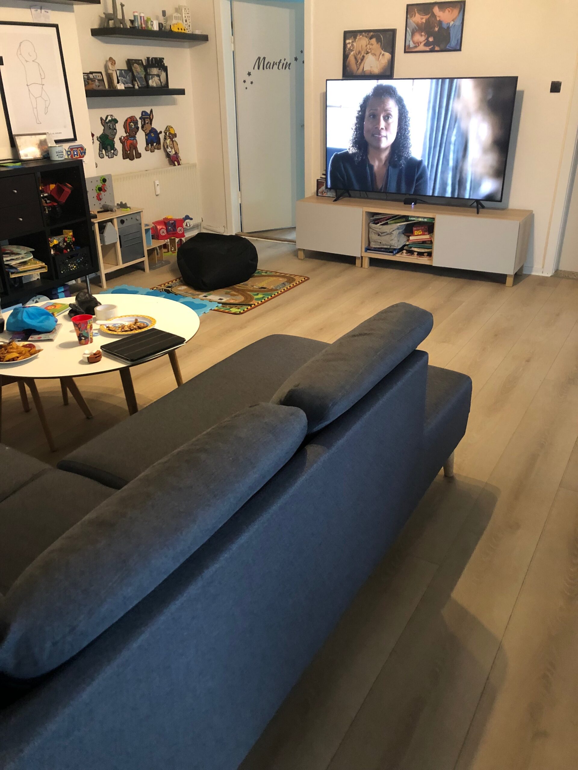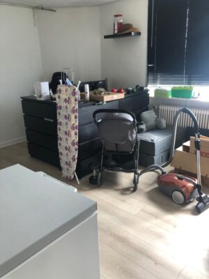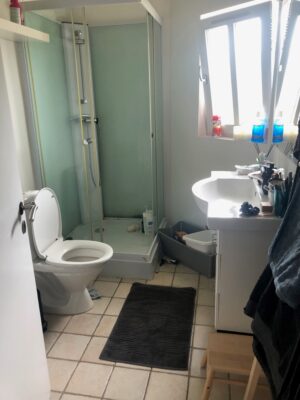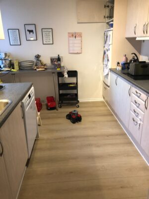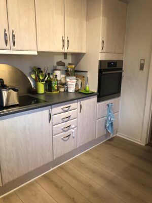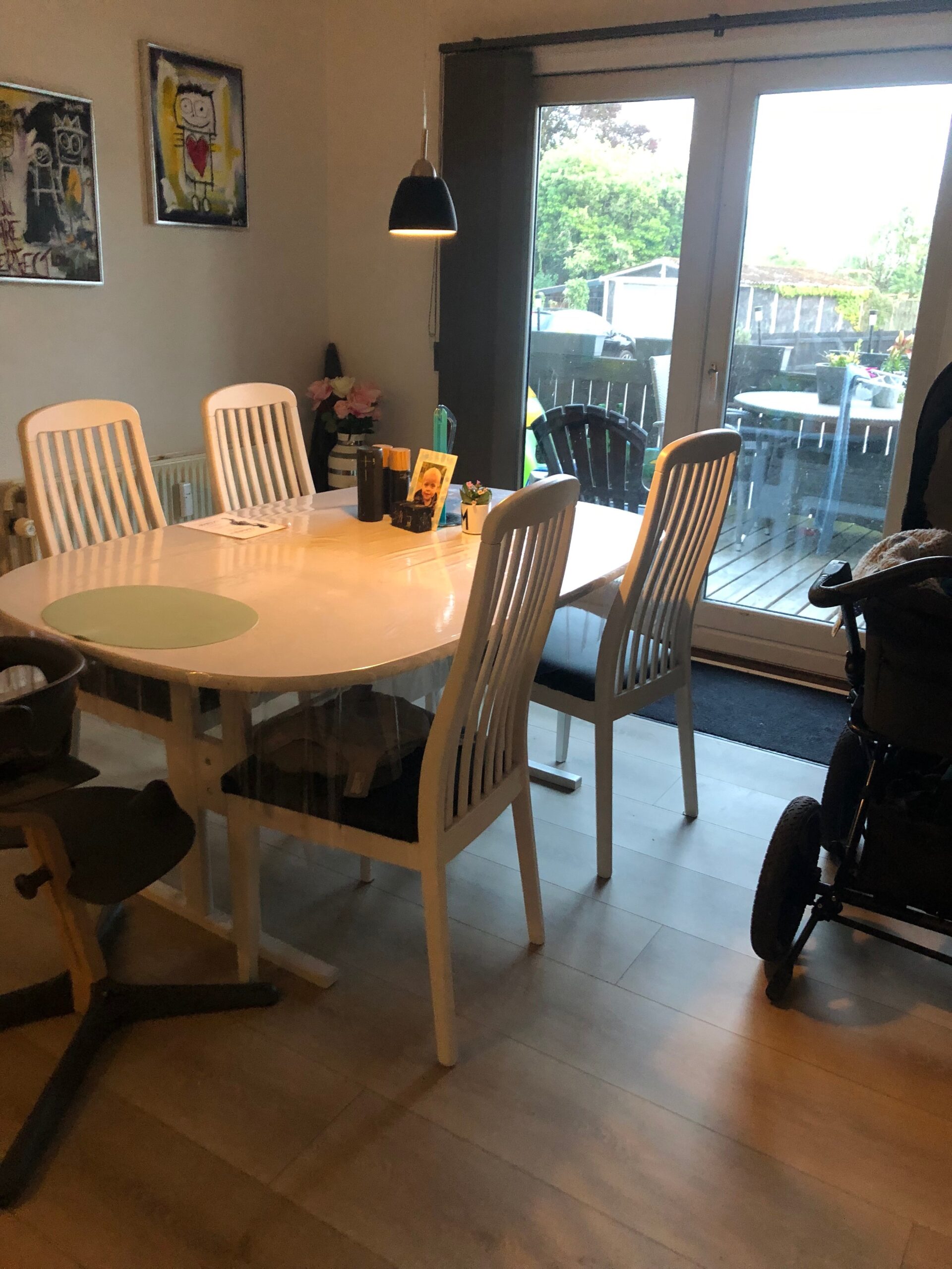 Der er sat en bordplade op i køkkenet, for at give lidt mere bordplads – denne kan evt. fjernes. Stuen kan opdeles i et sofa område og et spiseområde hvor der er udgang til terrassen (dobbeltdøre).