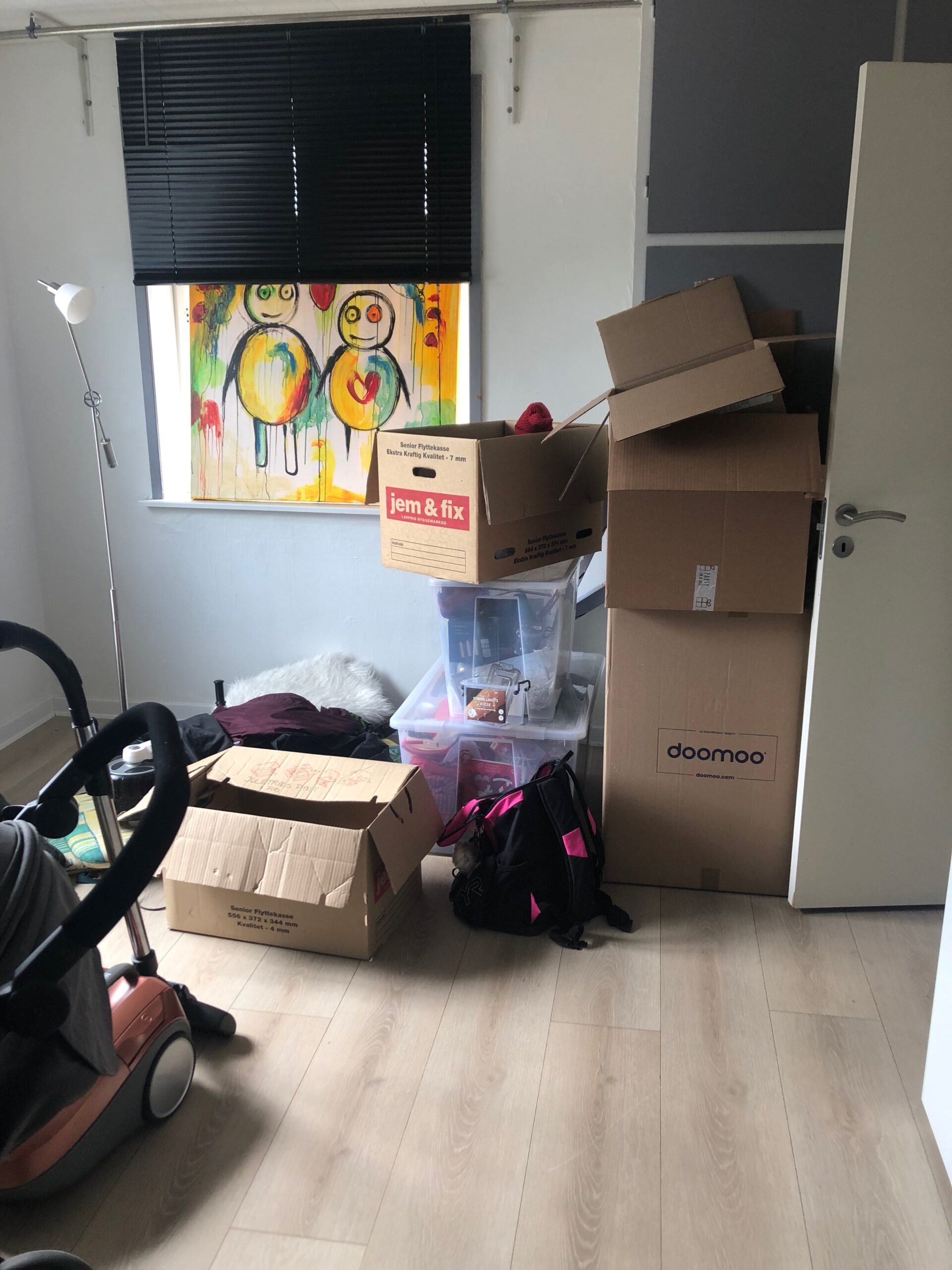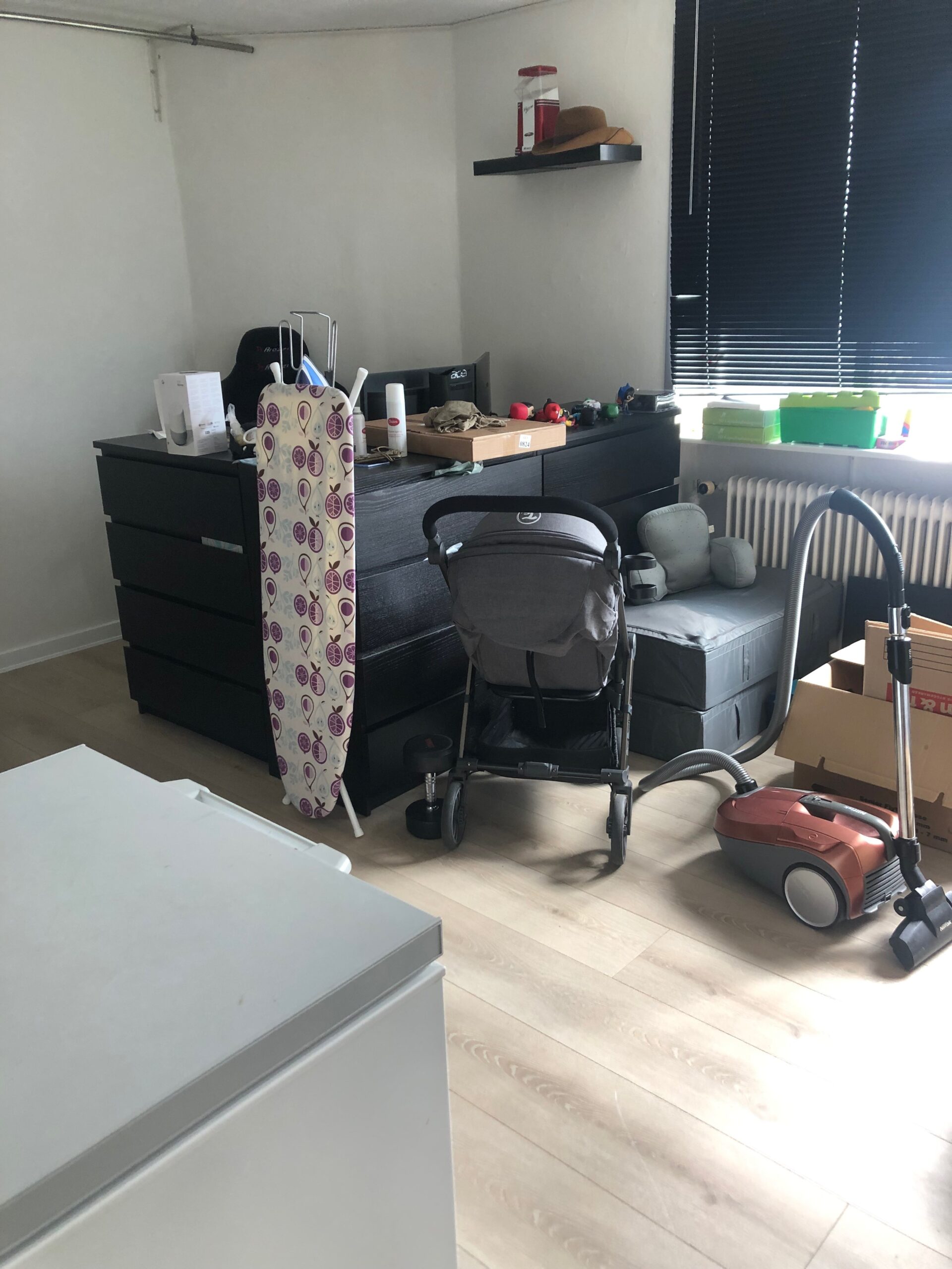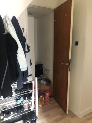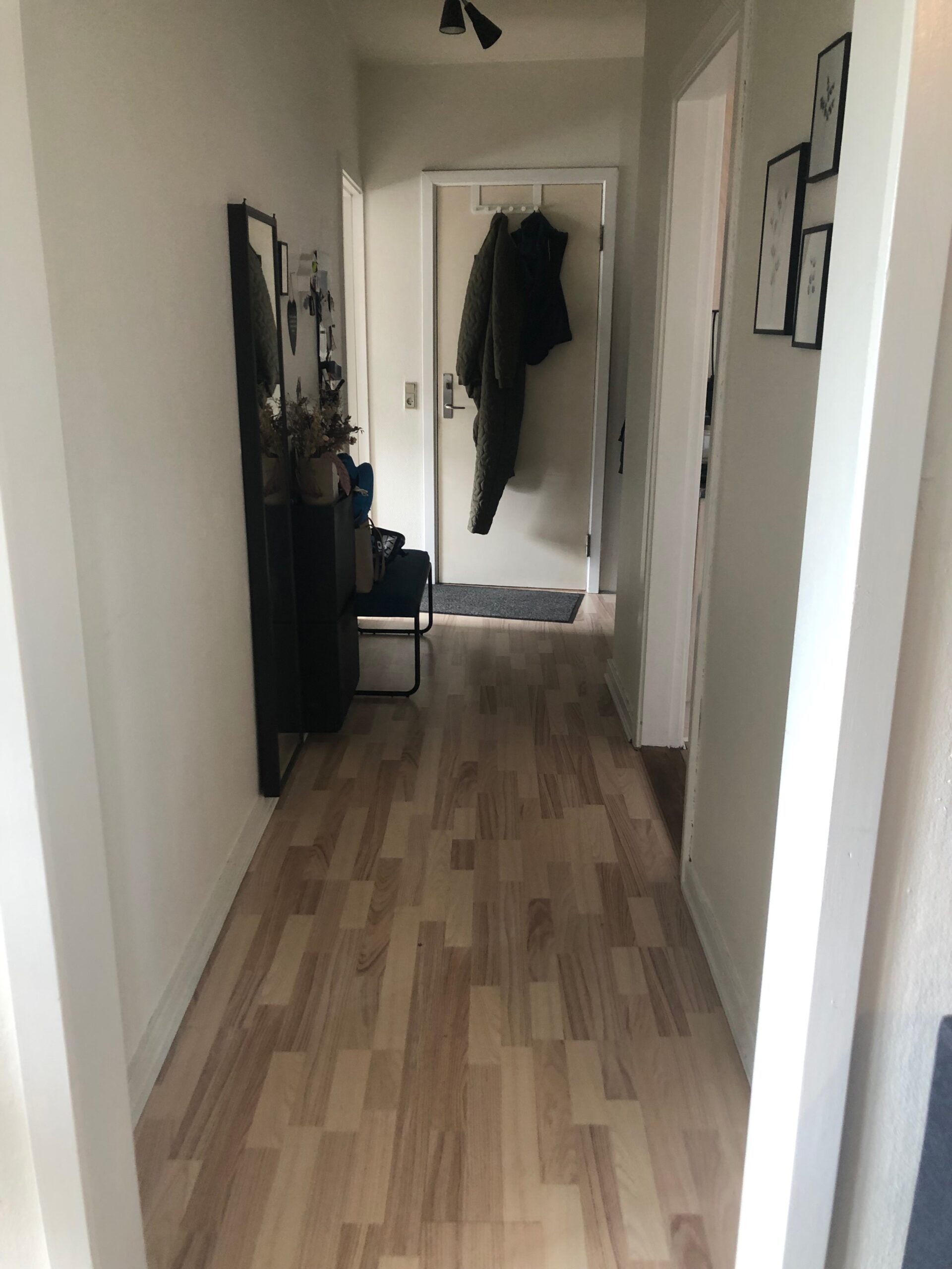 Fra gangen er der adgang til det største værelse, køkken og den det lille skab/rum under trappen.
