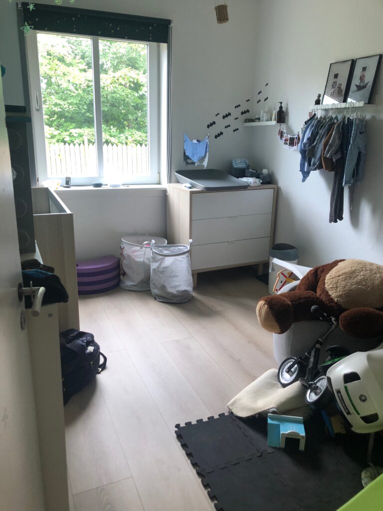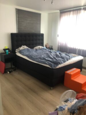 I det store værelse er der indbyggede skabe, og tre store vinduer, samt højt til loftet.