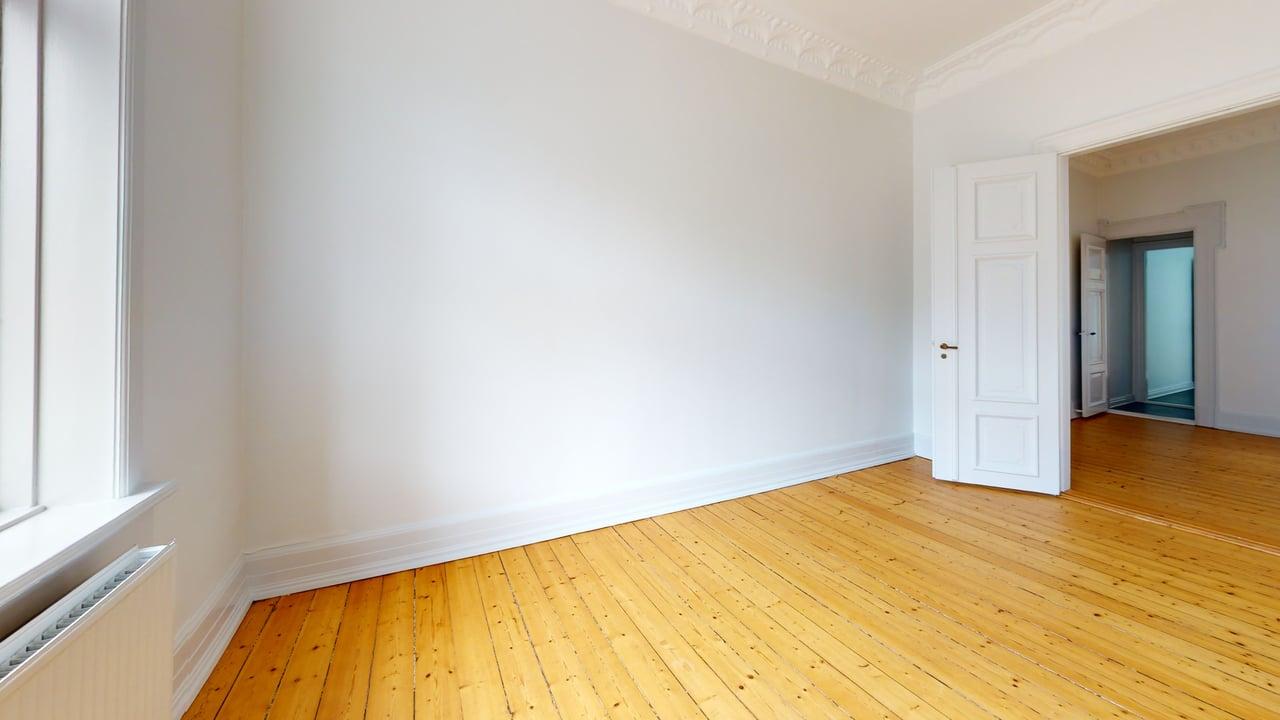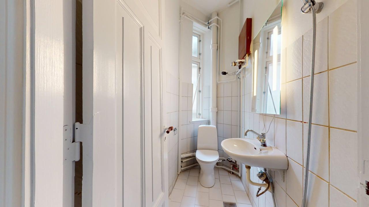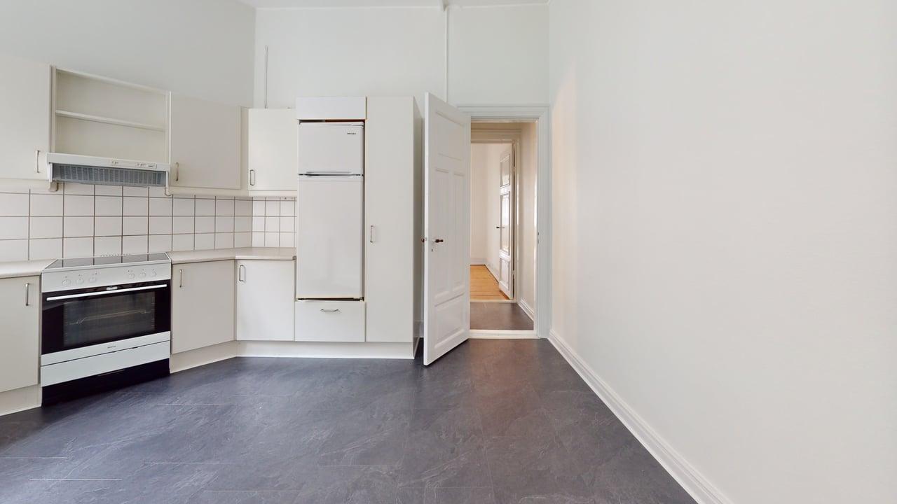 Lejligheden byder på hele 96 m², der emmer af historie og karakter. Med højt til loftet og originale stuklofter giver stuen en lys og indbydende stemning. Her er plads til både afslapning og samvær, og de indbyggede skabe i det store værelse bidrager til en praktisk indretning. Det rummelige køkken er i ældre stil, men udstyret med moderne bekvemmeligheder som opvaskemaskine og kølefryseskab, hvilket gør madlavningen til en fornøjelse. Badeværelset er kompakt, men funktionelt og velindrettet.