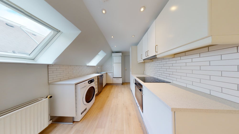 Køkkenet er praktisk indrettet og udstyret med nødvendige faciliteter, hvilket gør madlavningen til en fornøjelse. Badeværelset er funktionelt og indbydende, hvilket fuldender boligens komfort.
