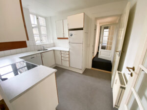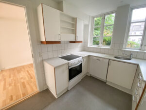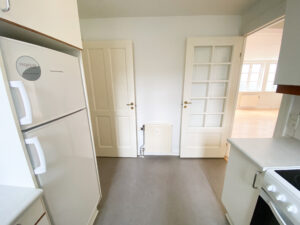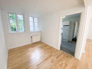 Man bydes velkommen i en indbydende entré med god opbevaringsplads i form af et klædeskab. Herfra træder man direkte ind i lejlighedens hjerte – den fantastiske, store og lyse stue. Stuen er nem at indrette med både sofaområde, tv-møbel og hvad man ellers måtte ønske sig, og byder desuden på en charmerende fransk altan og et lyst, pænt laminatgulv, der giver rummet et luftigt udtryk. En hyggelig niche i stuen giver mulighed for at etablere en spiseplads, hjemmekontor eller hyggekrog – helt efter behov.