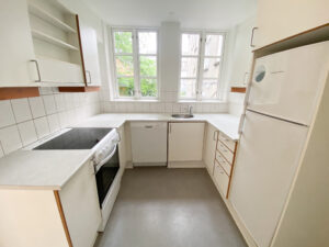 Fra stuenichen bevæger man sig videre ind i det velholdte køkken, der er indrettet i en praktisk hesteskoform. Her er der både god bordplads og masser af skabe til opbevaring, og som en ekstra bonus er der installeret opvaskemaskine.
