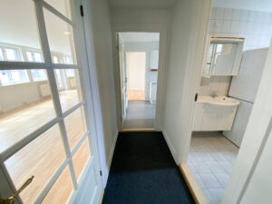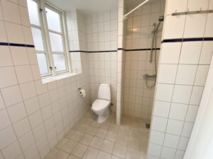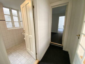 Både fra køkkenet og stuen er der adgang til en fordelingsgang, der forbinder badeværelset med to øvrige værelser. Badeværelset er lyst og rummeligt med hvide klinker, separat bruseniche og praktisk vaskesøjle.